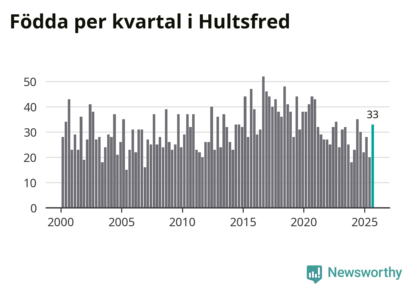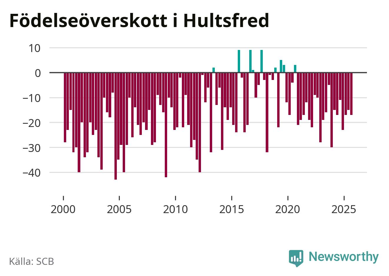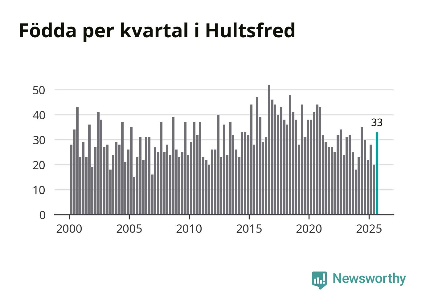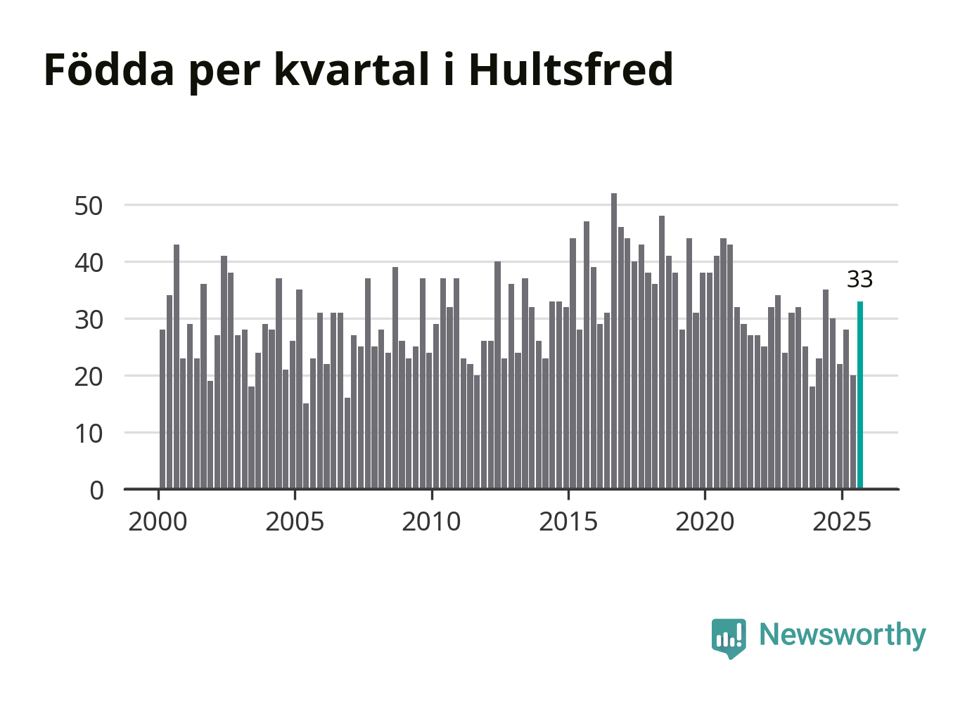 Enligt SCB:s siffror föddes 33 barn i Hultsfred under det senaste kvartalet. Samtidigt avled 50 personer. Hultsfred hade alltså ett negativt födelsenetto, vilket kommunen historiskt sett nästan alltid har haft.