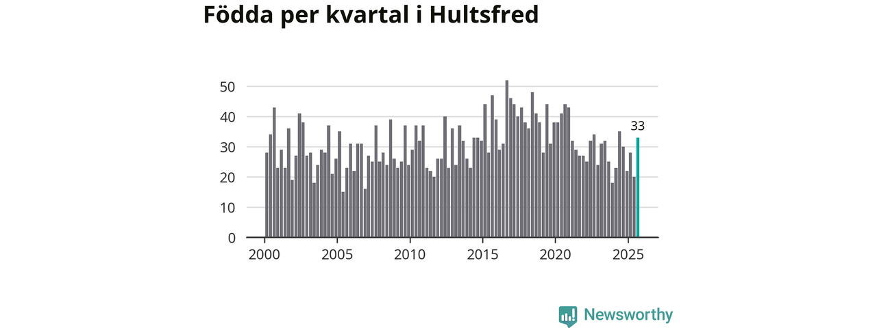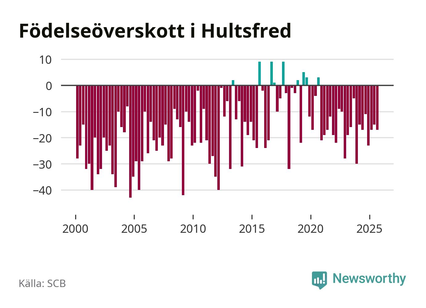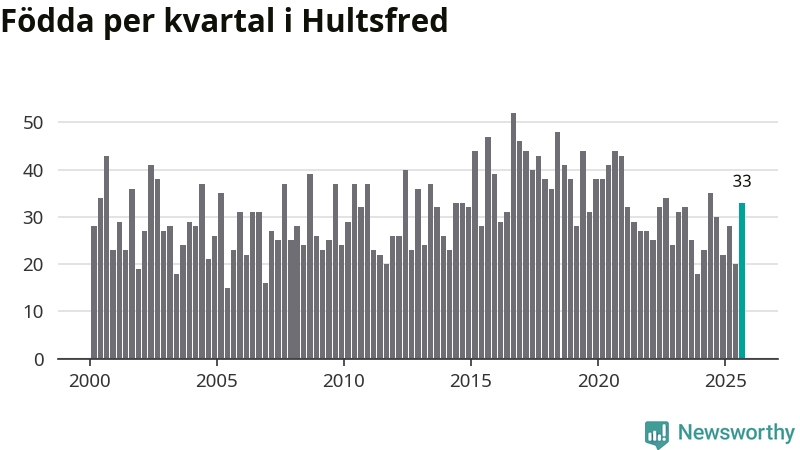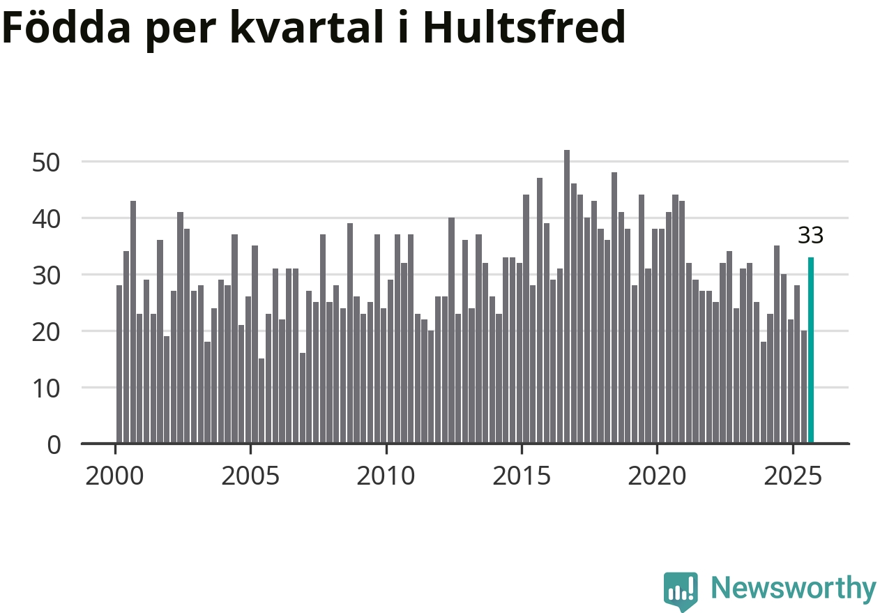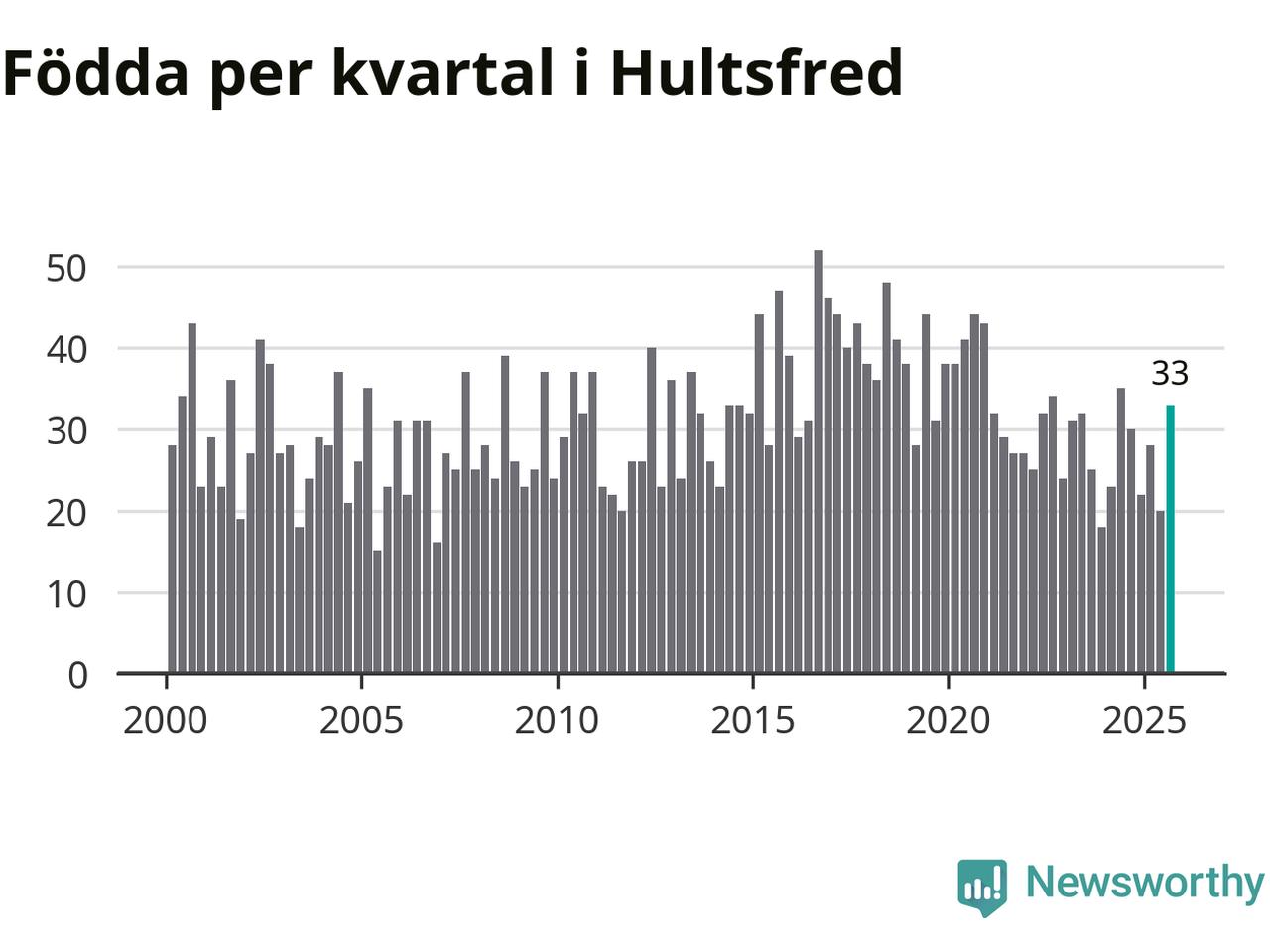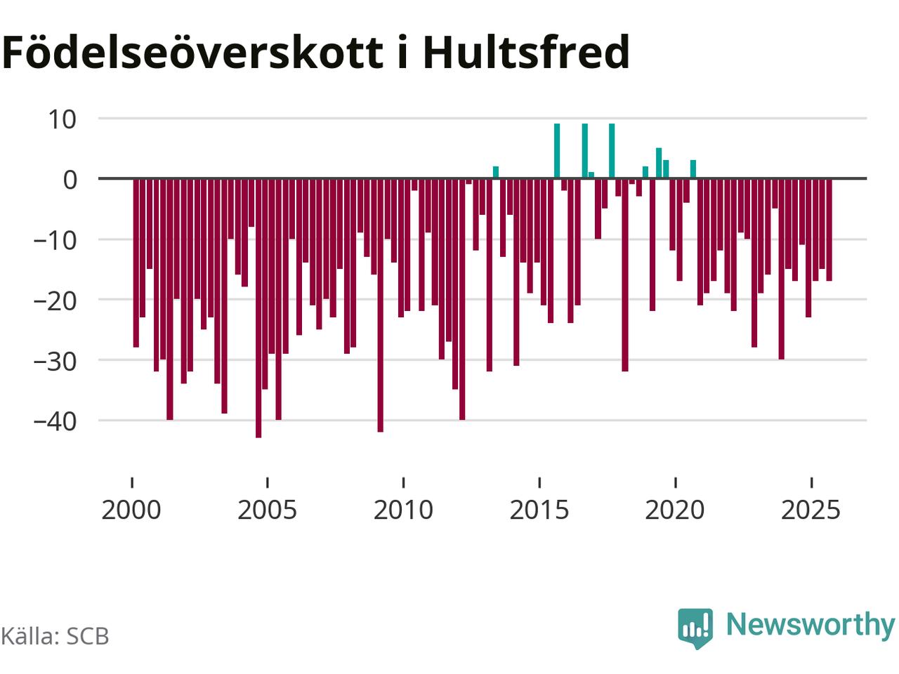 Enligt SCB:s siffror föddes 33 barn i Hultsfred under det senaste kvartalet. Samtidigt avled 50 personer. Hultsfred hade alltså ett negativt födelsenetto, vilket kommunen historiskt sett nästan alltid har haft.