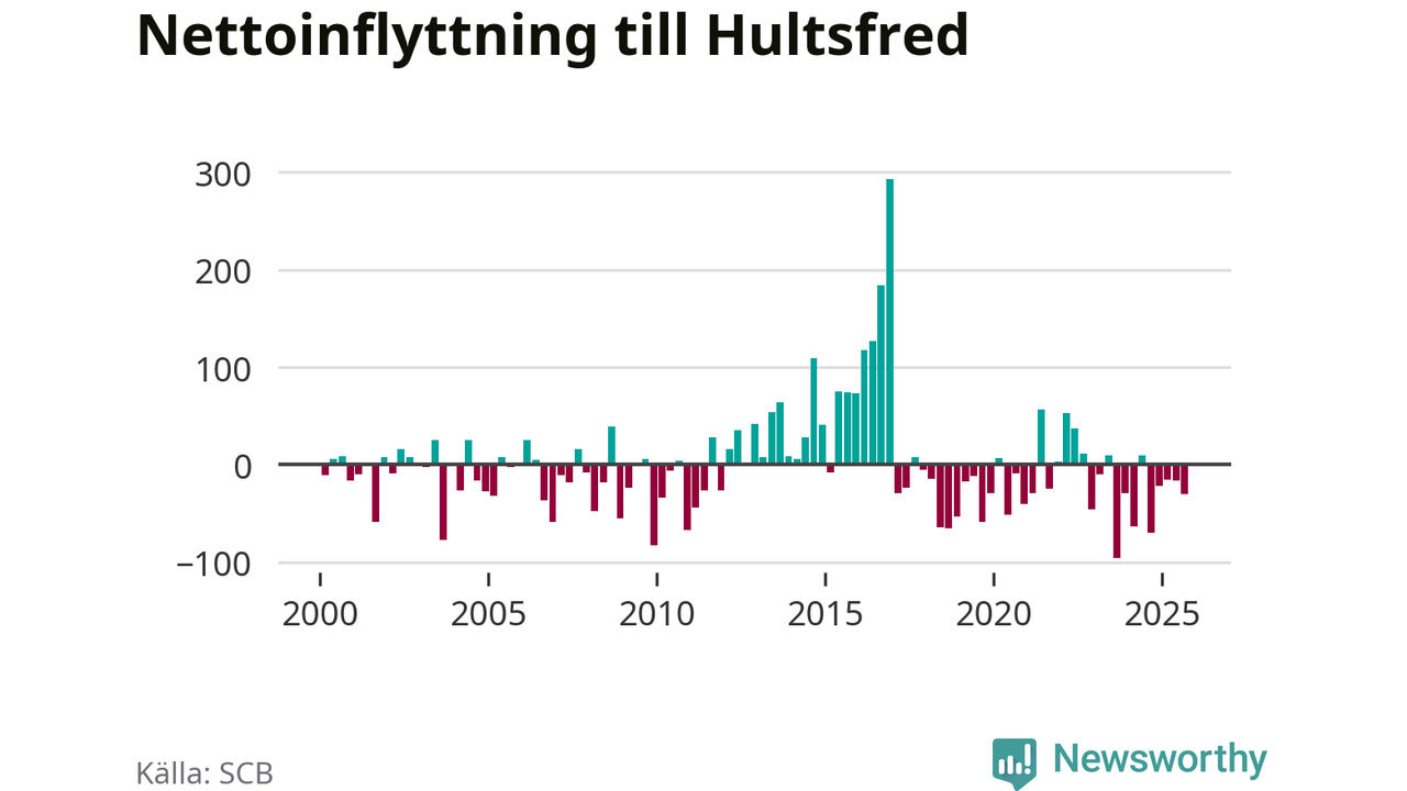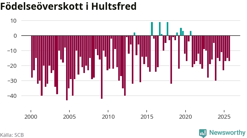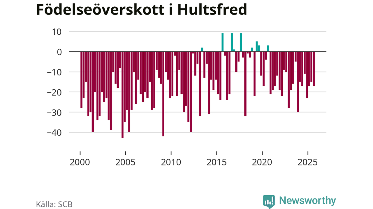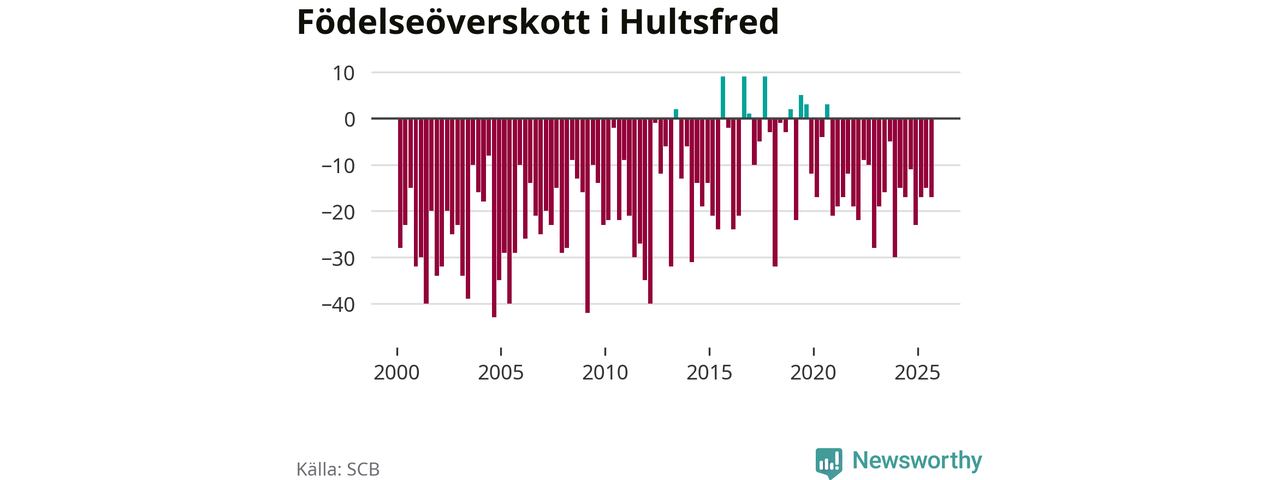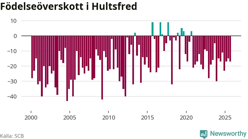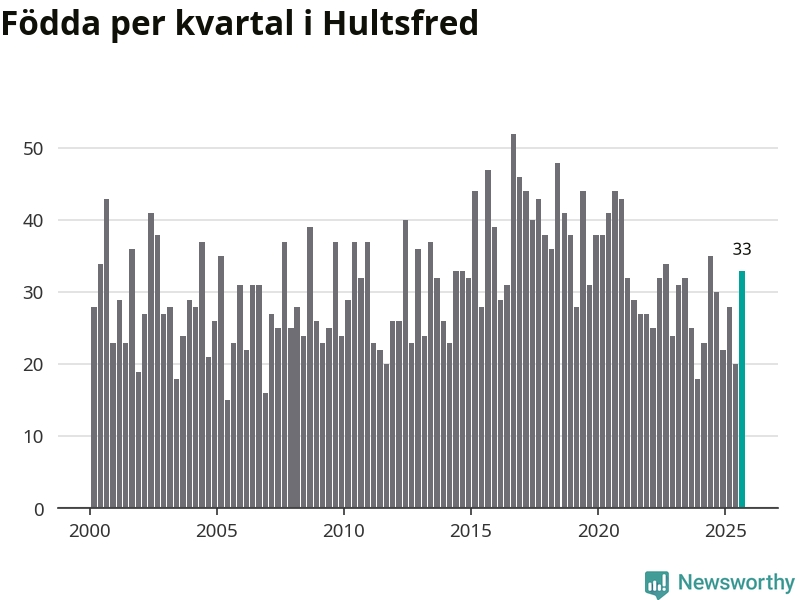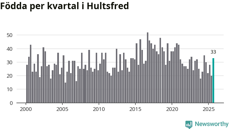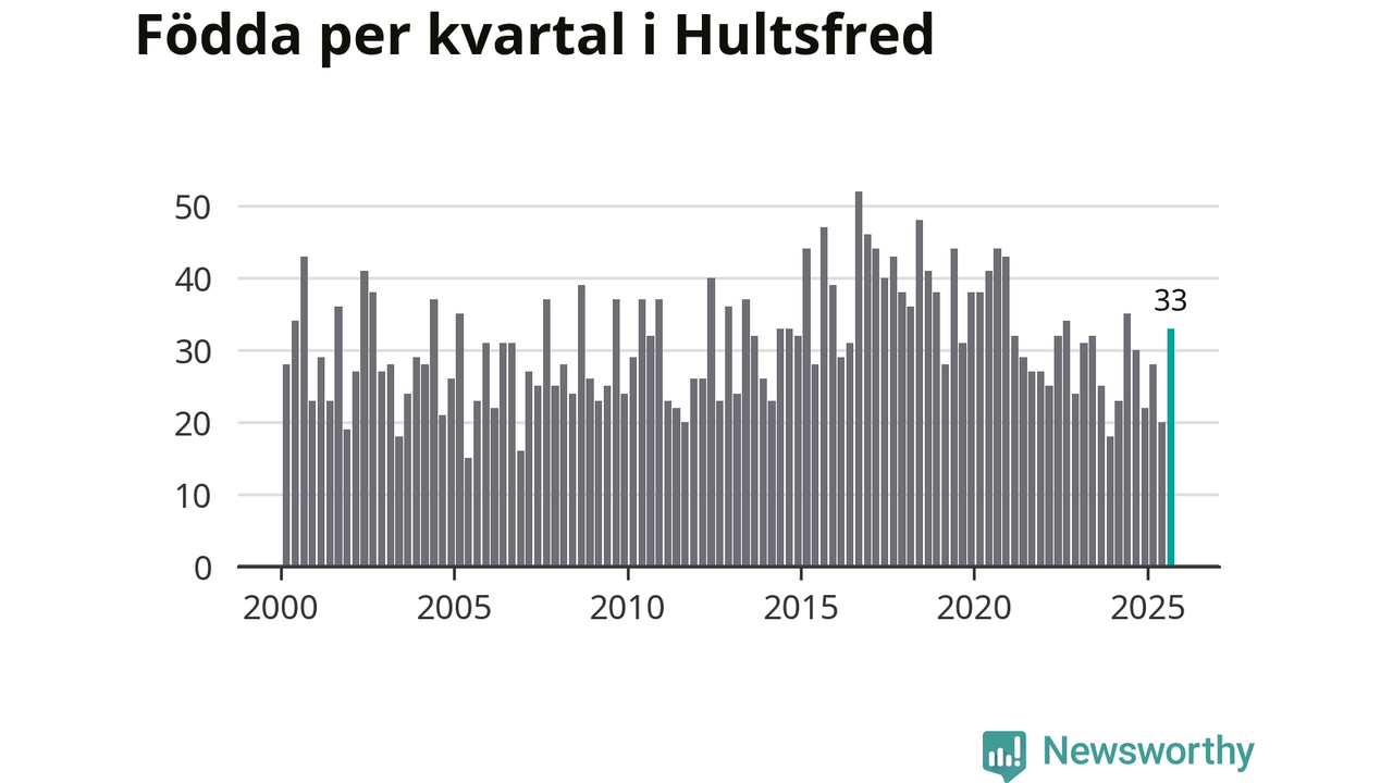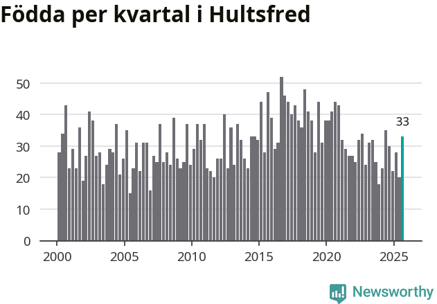 Enligt SCB:s siffror föddes 33 barn i Hultsfred under det senaste kvartalet. Samtidigt avled 50 personer. Hultsfred hade alltså ett negativt födelsenetto, vilket kommunen historiskt sett nästan alltid har haft.