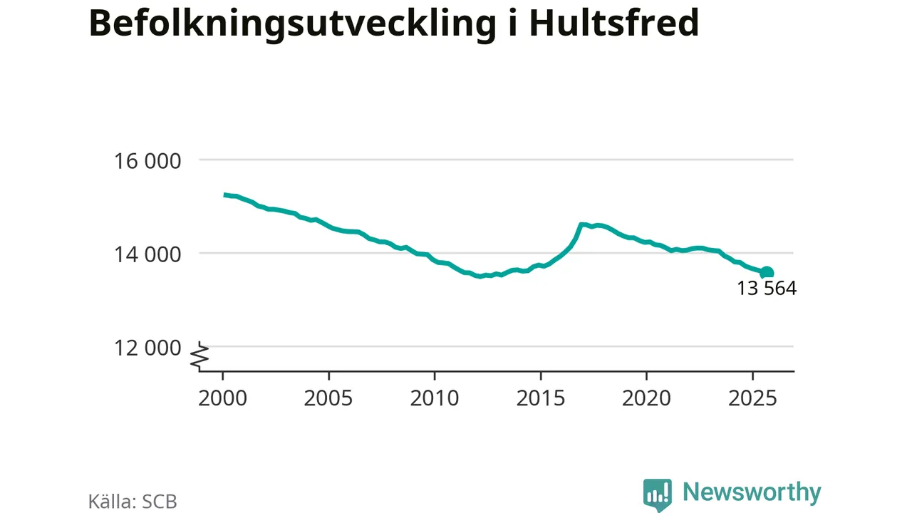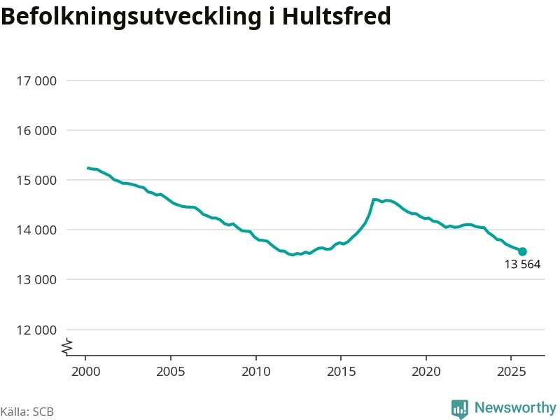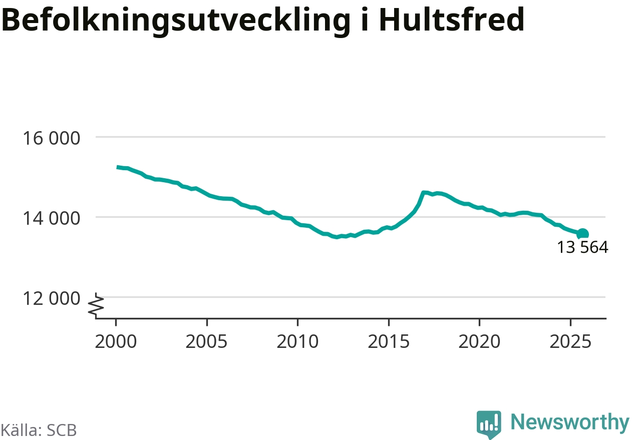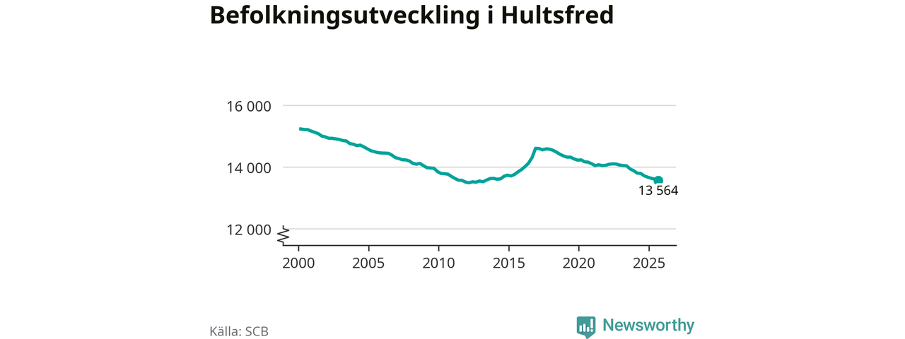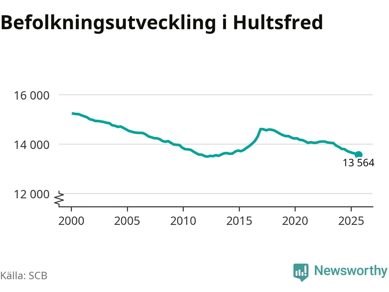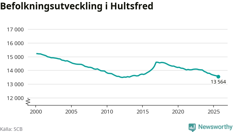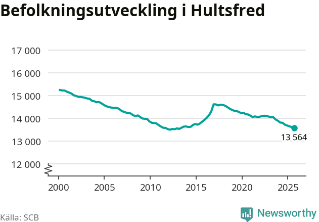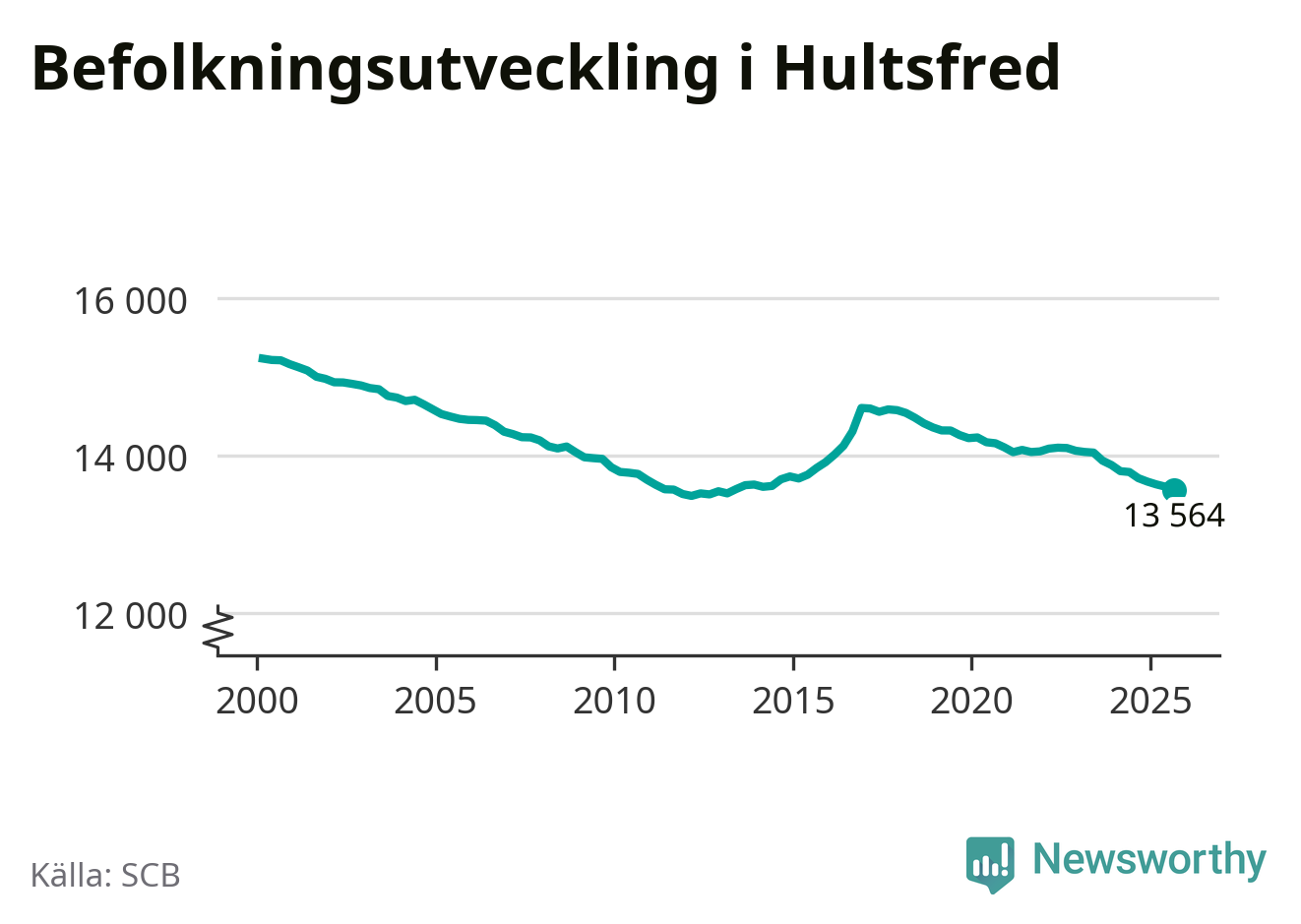Jämfört med för ett år sedan har befolkningen i Hultsfred minskat med ungefär 150 personer – vilket motsvarar en nedgång på 1,1 procent. Sedan millennieskiftet har folkmängden minskat med 1 670 personer, eller 11 procent.