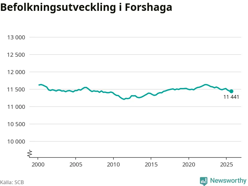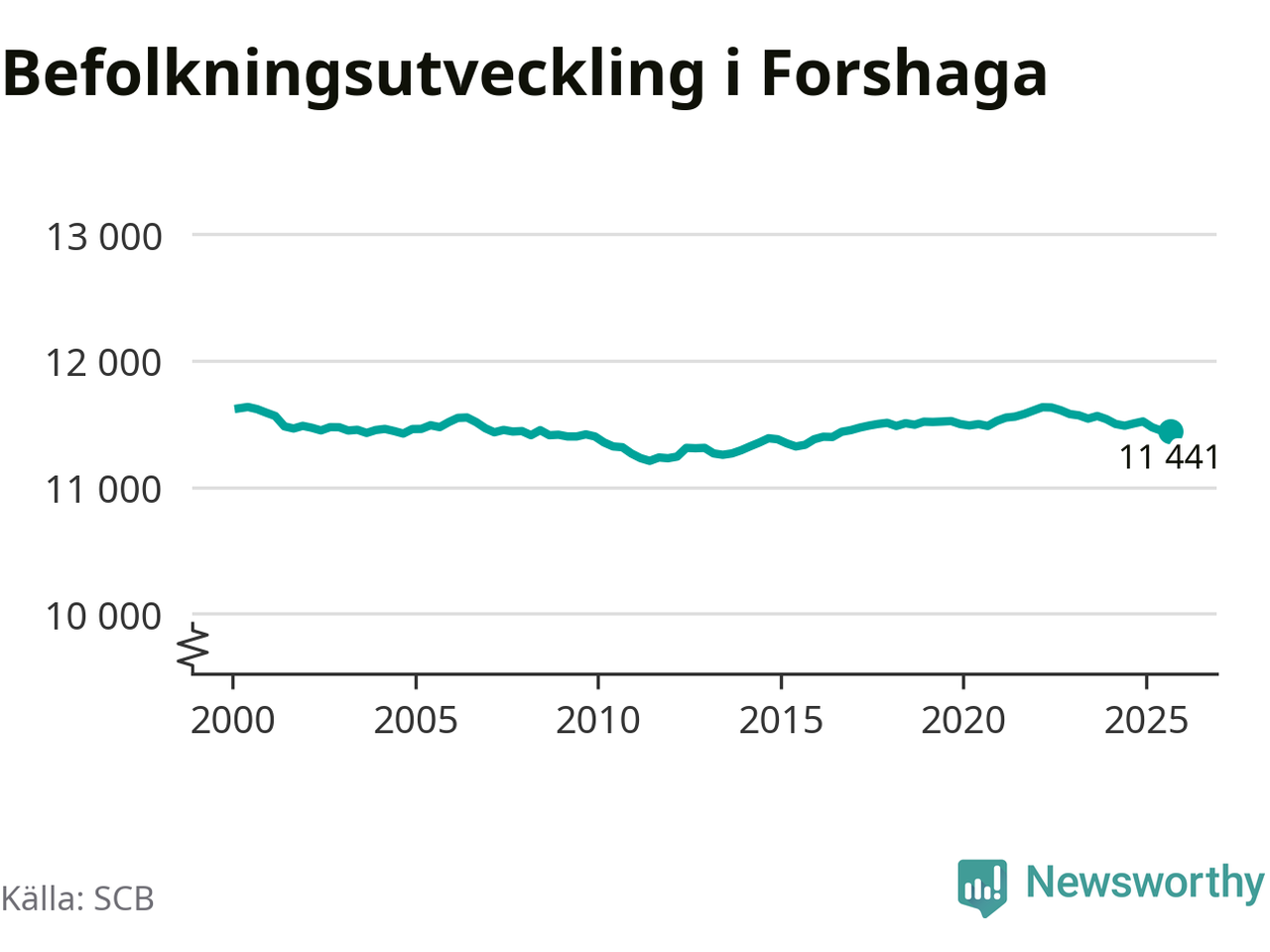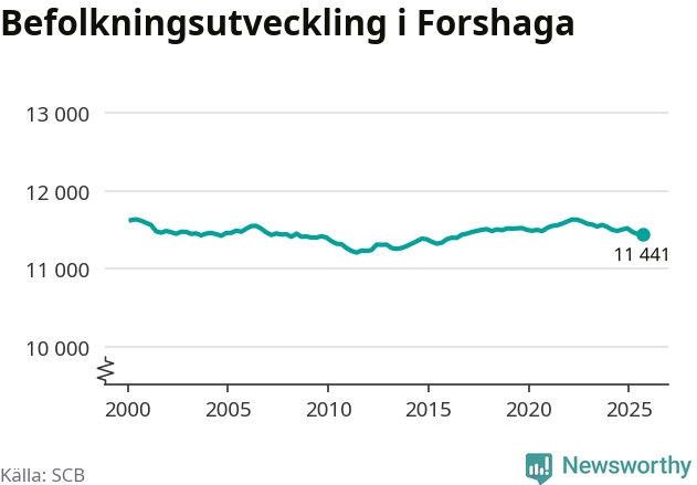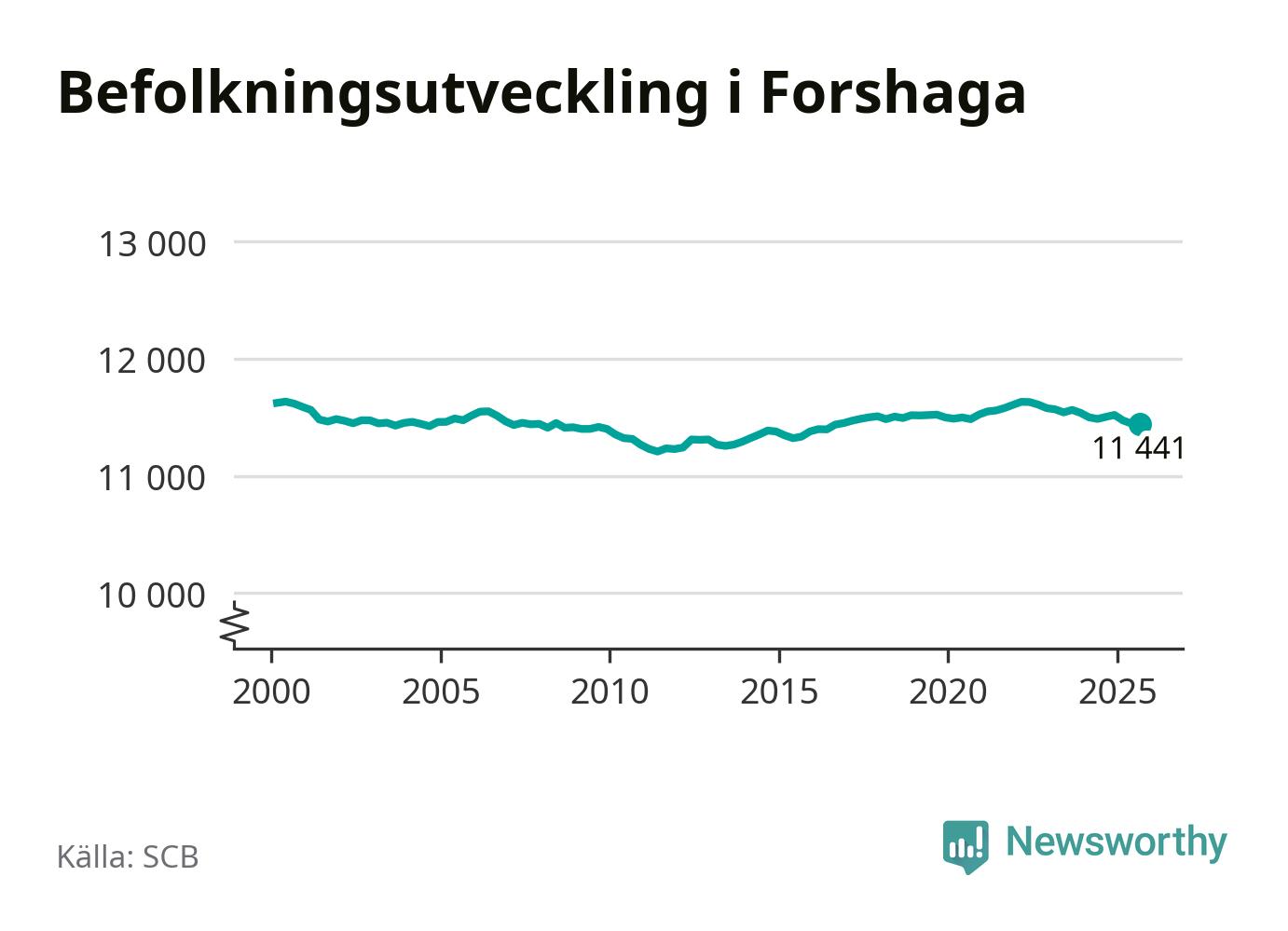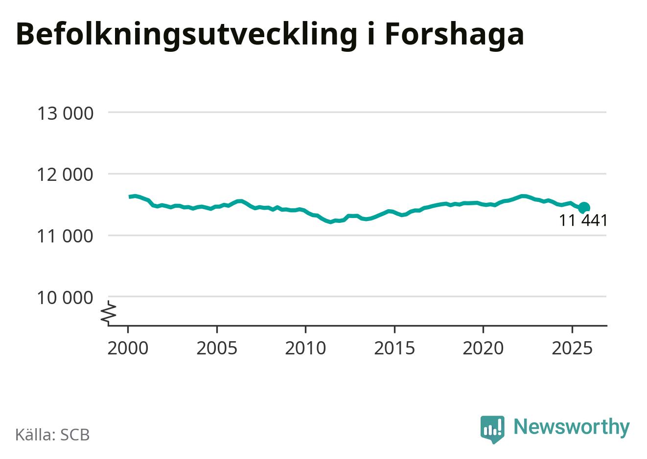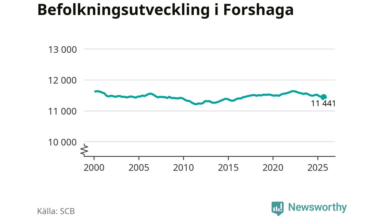 I slutet av tredje kvartalet 2025 bodde 11 441 personer i Forshaga kommun, enligt SCB:s senaste siffror. Det är drygt 60 personer färre än vid samma tidpunkt förra året.