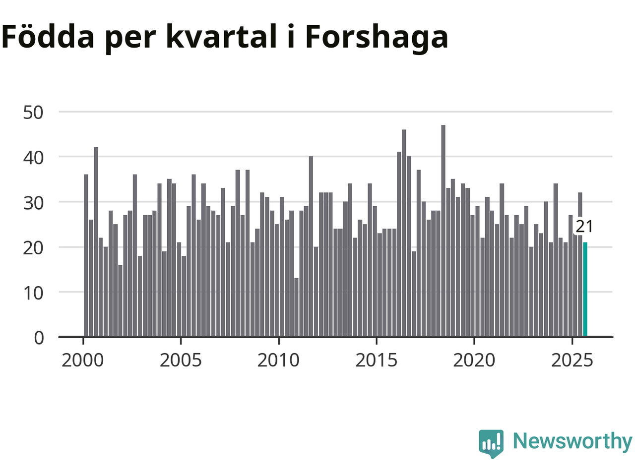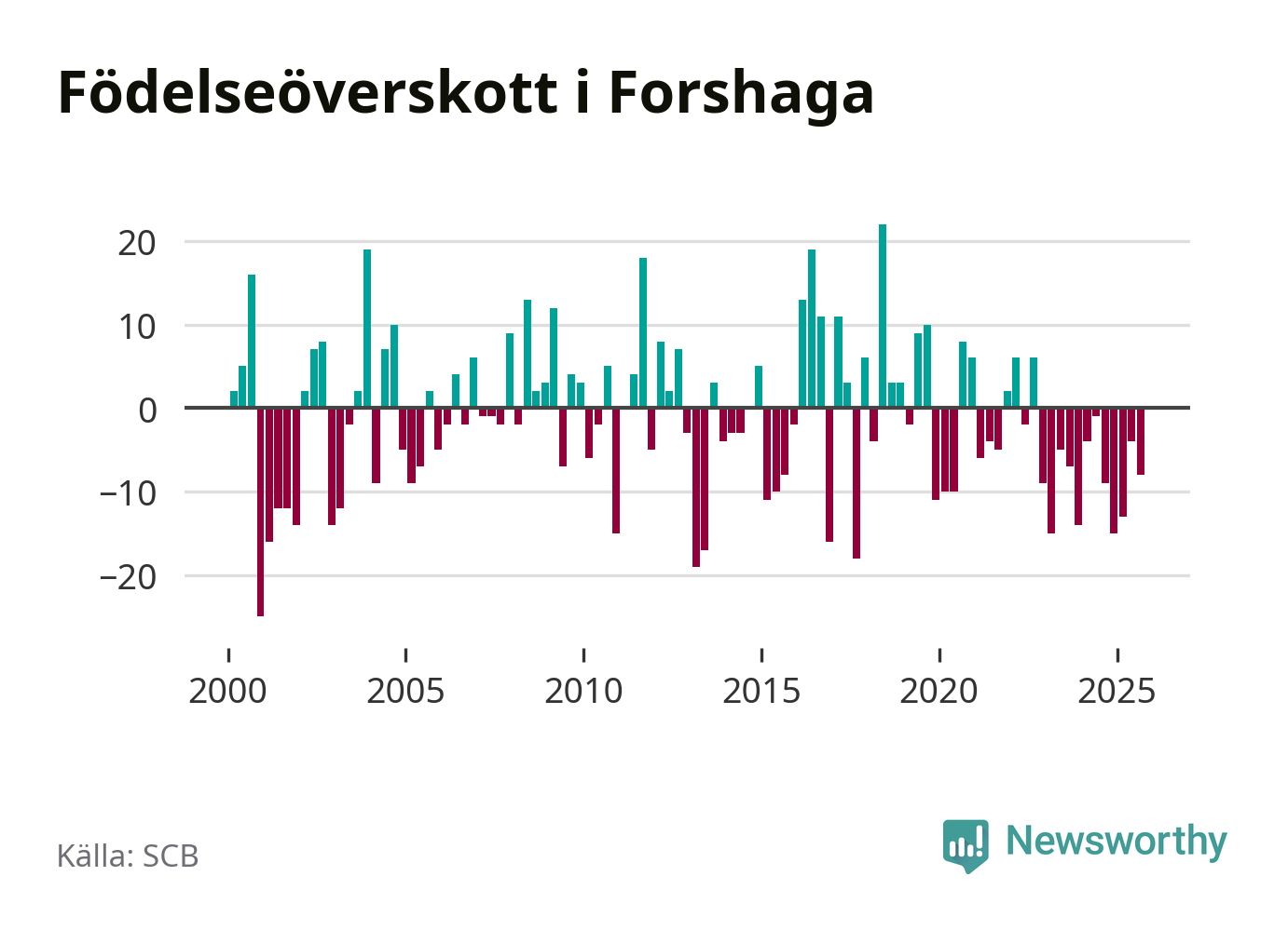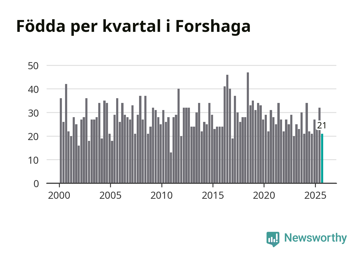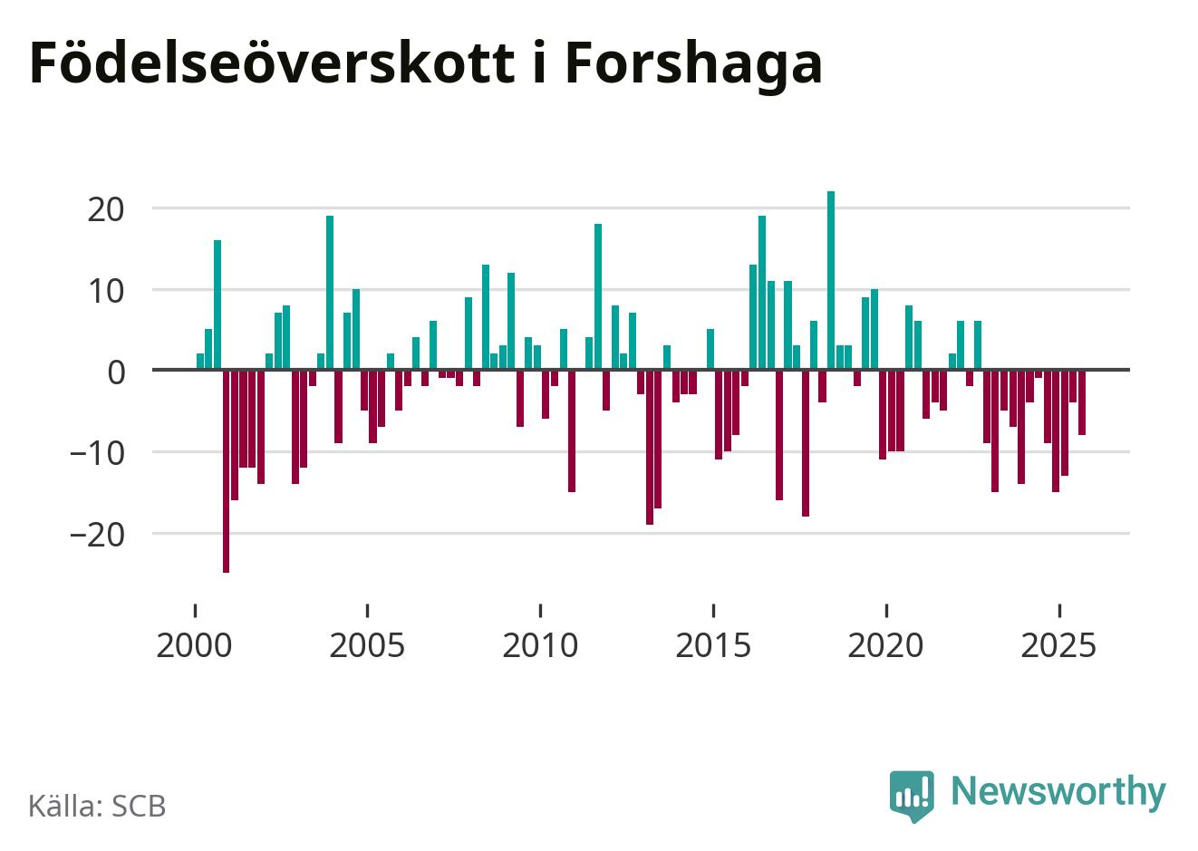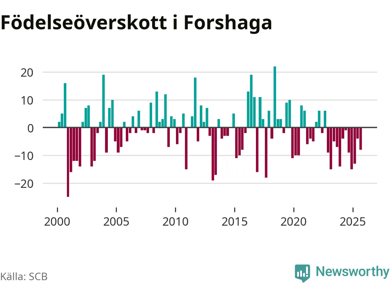 Enligt SCB:s siffror föddes 21 barn i Forshaga under det senaste kvartalet. Samtidigt avled 29 personer. Skillnaden mellan antal födda och döda är så liten att det inte går att säga om det beror på något annat än SCB:s röjandeskydd. Kommunen har oftast haft negativt födelsenetto tidigare.