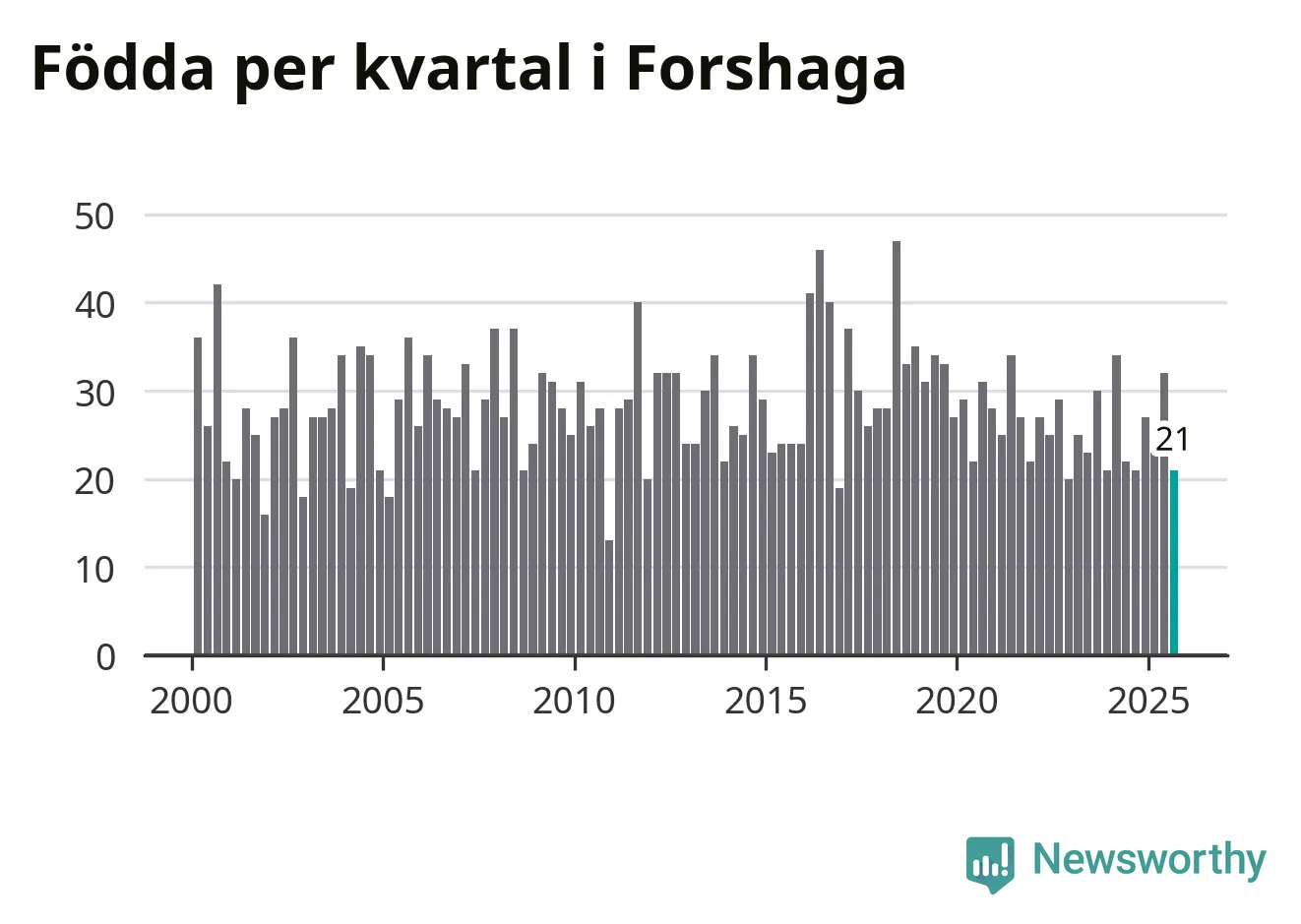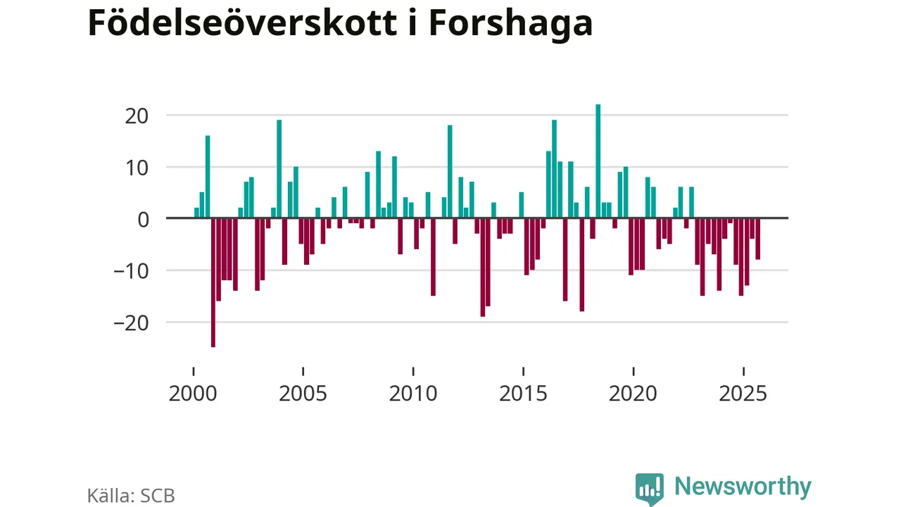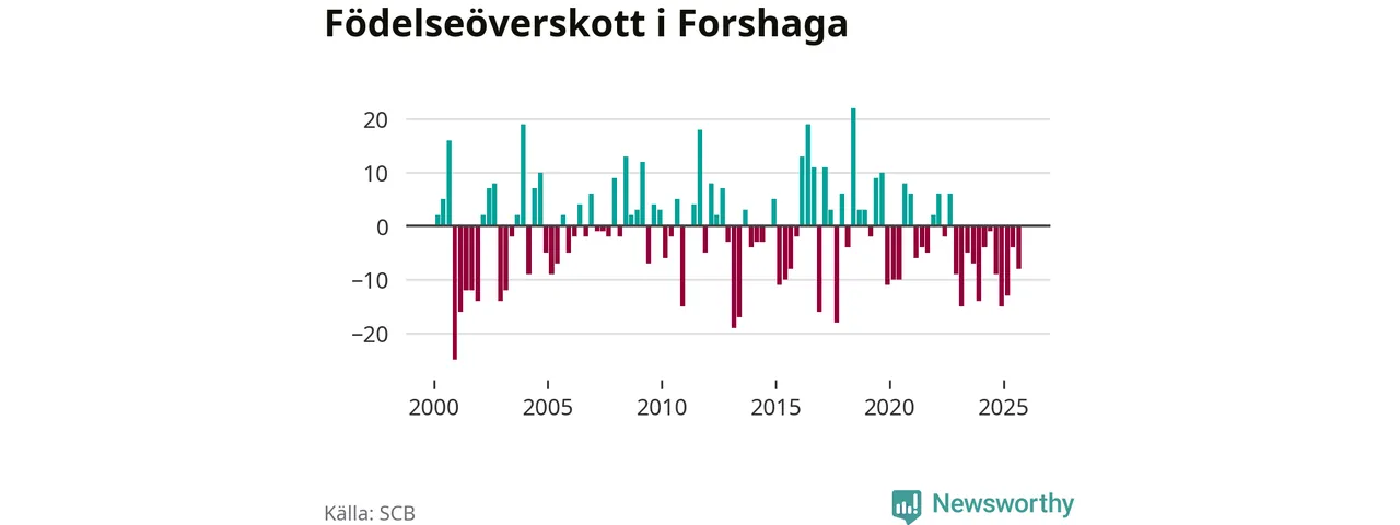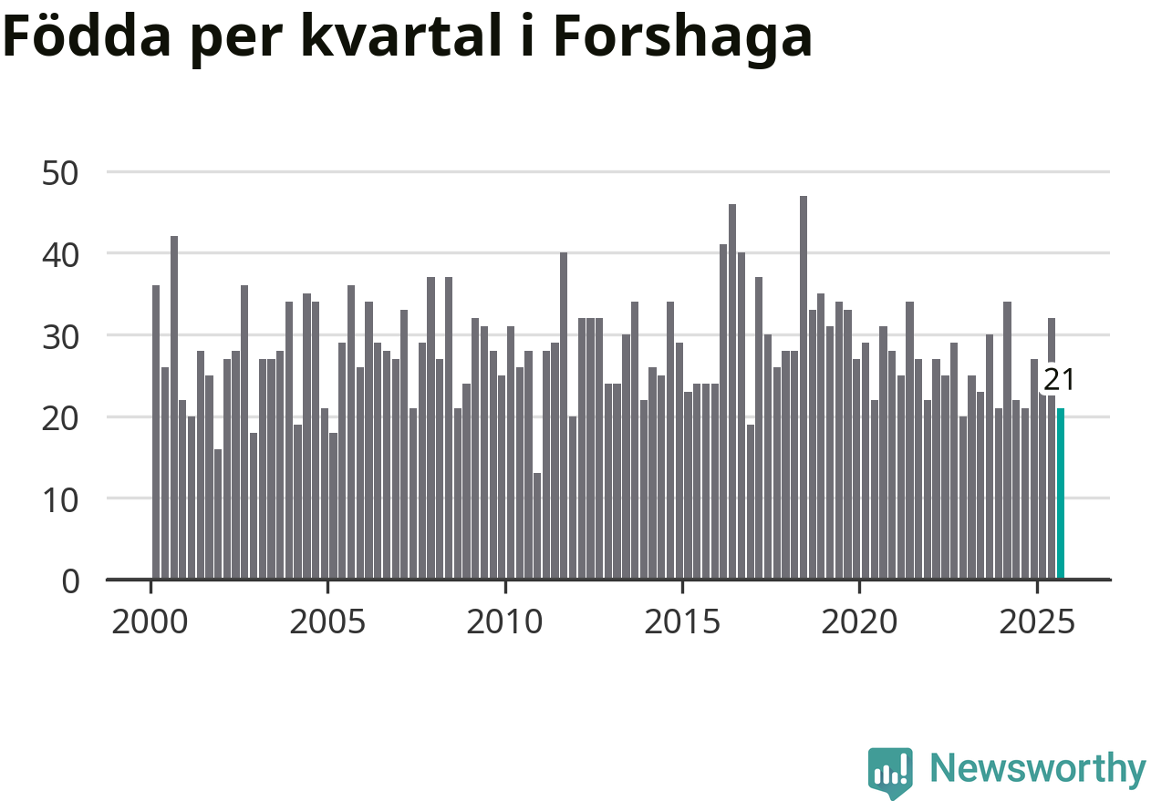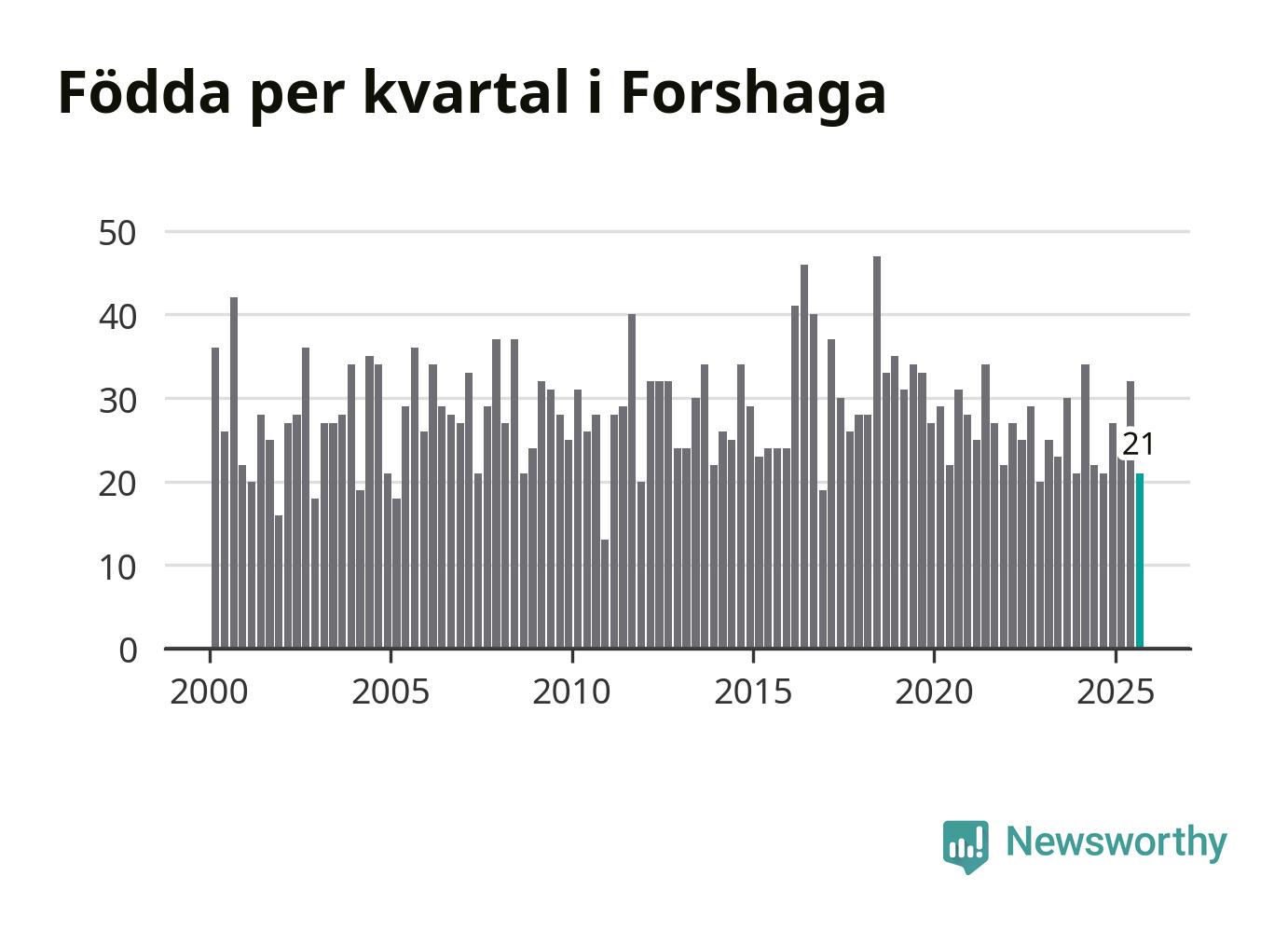 Enligt SCB:s siffror föddes 21 barn i Forshaga under det senaste kvartalet. Samtidigt avled 29 personer. Skillnaden mellan antal födda och döda är så liten att det inte går att säga om det beror på något annat än SCB:s röjandeskydd. Kommunen har oftast haft negativt födelsenetto tidigare.