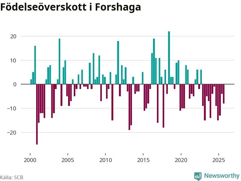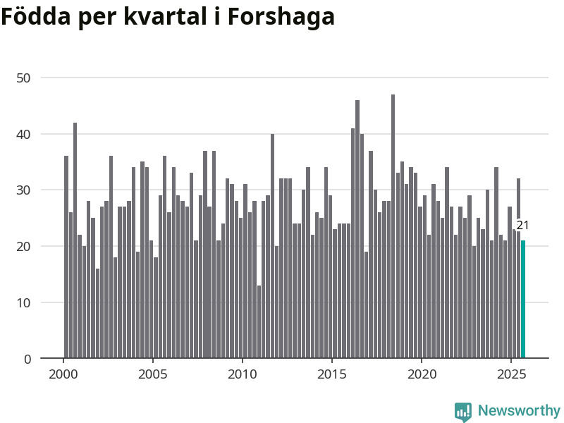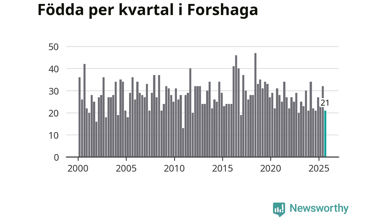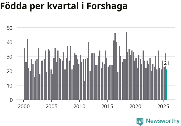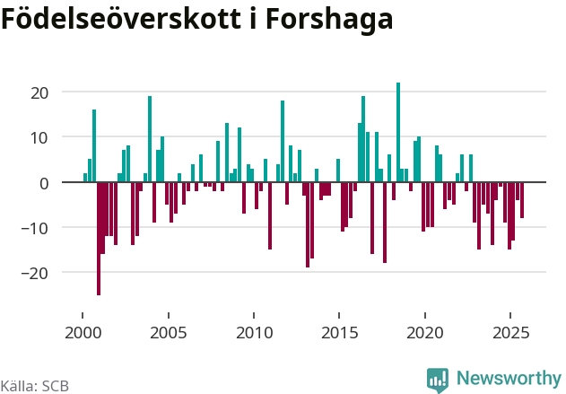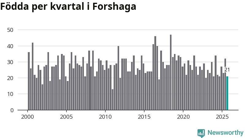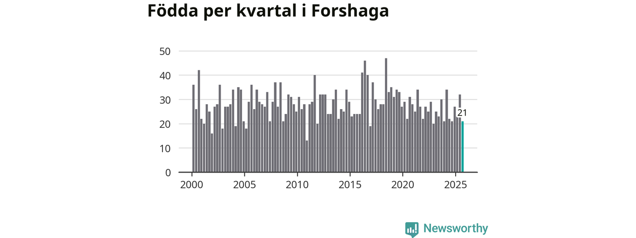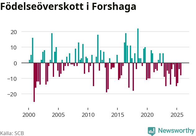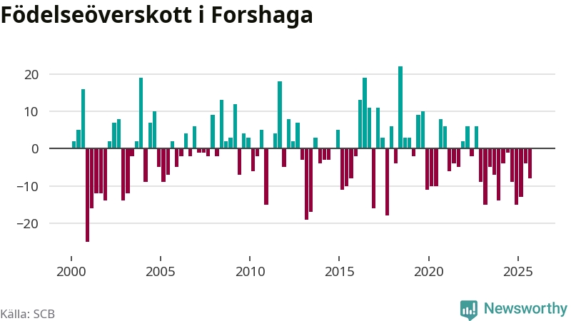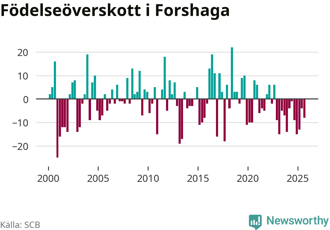 Enligt SCB:s siffror föddes 21 barn i Forshaga under det senaste kvartalet. Samtidigt avled 29 personer. Skillnaden mellan antal födda och döda är så liten att det inte går att säga om det beror på något annat än SCB:s röjandeskydd. Kommunen har oftast haft negativt födelsenetto tidigare.