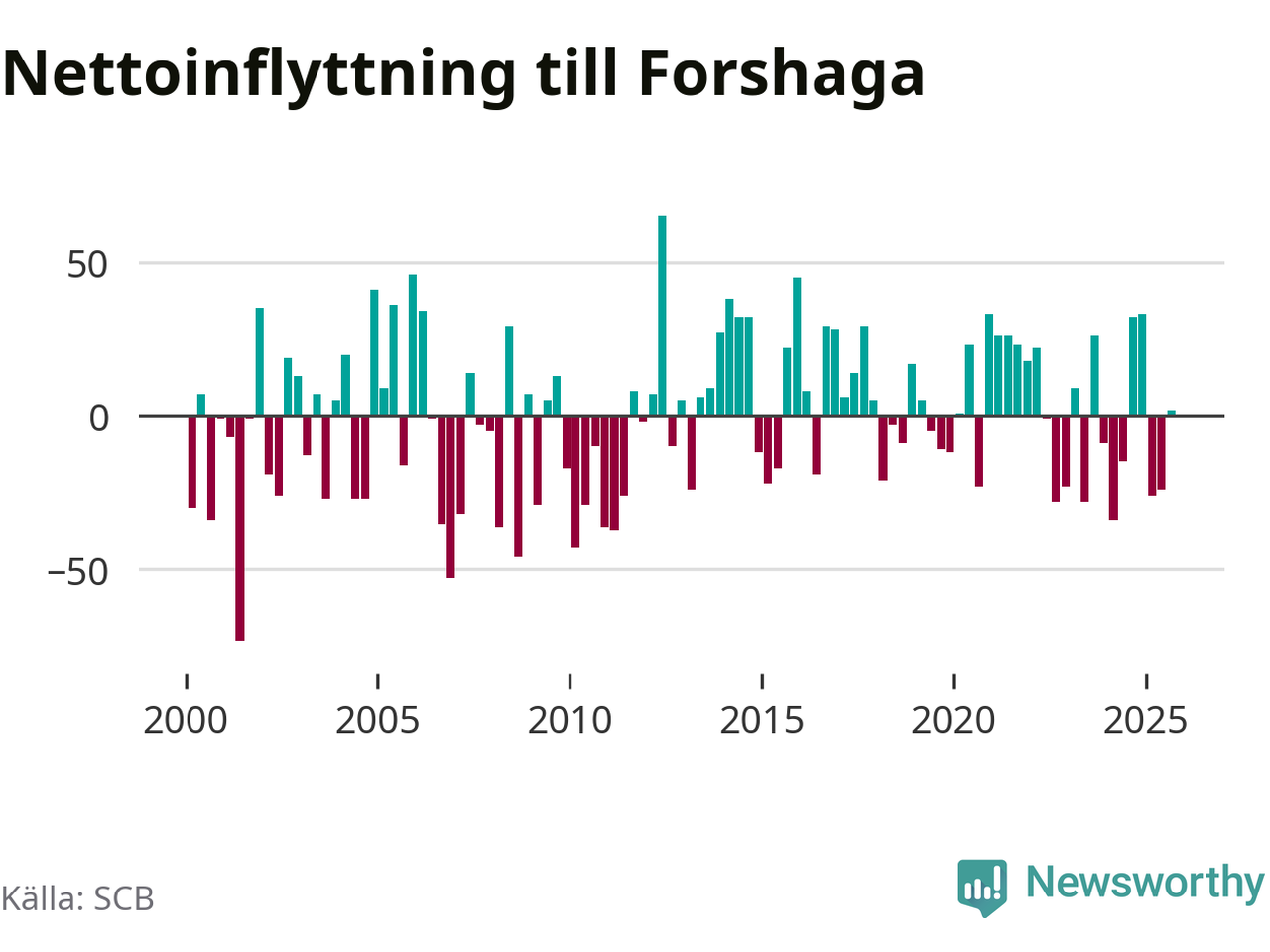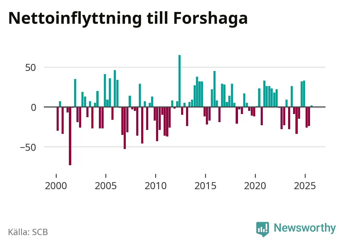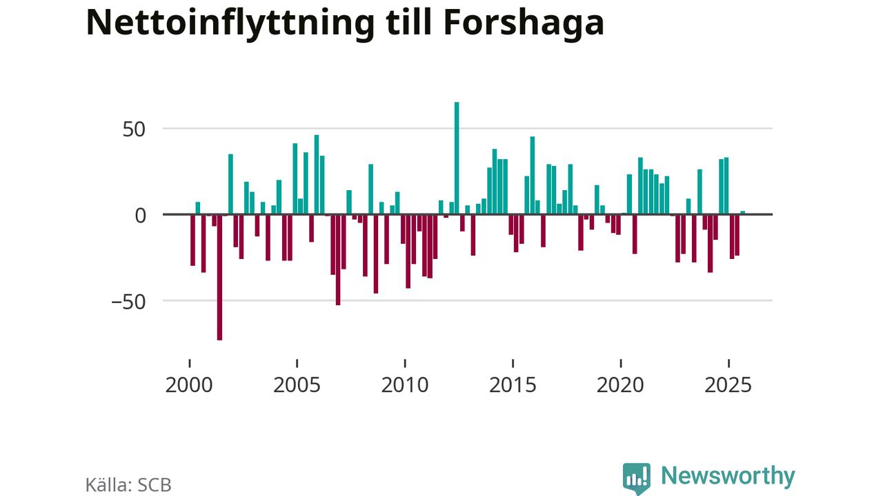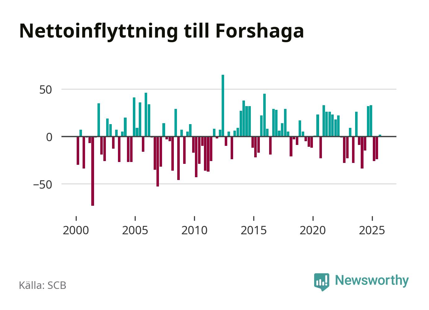 Under tredje kvartalet 2025 flyttade 173 personer till kommunen medan 171 personer flyttade därifrån. Skillnaden mellan antalet in- och utflyttade är så liten att den lika gärna kan bero på SCB:s slumpmässiga brus. Sedan seklets början har Forshaga oftast haft ett positivt flyttnetto.