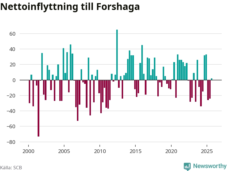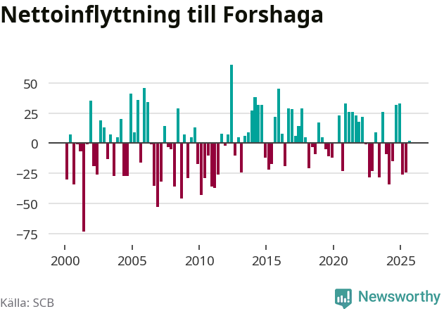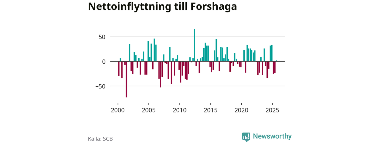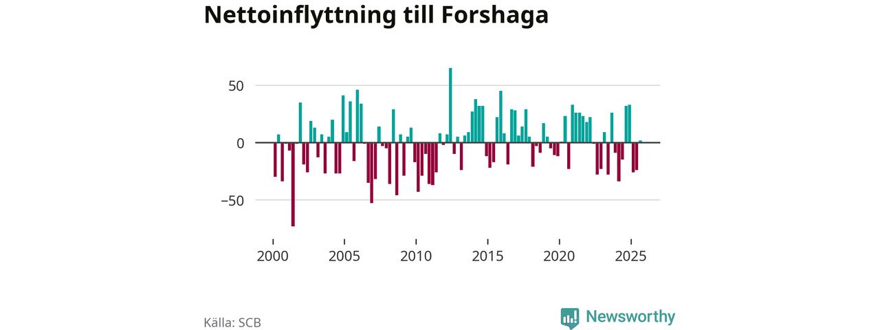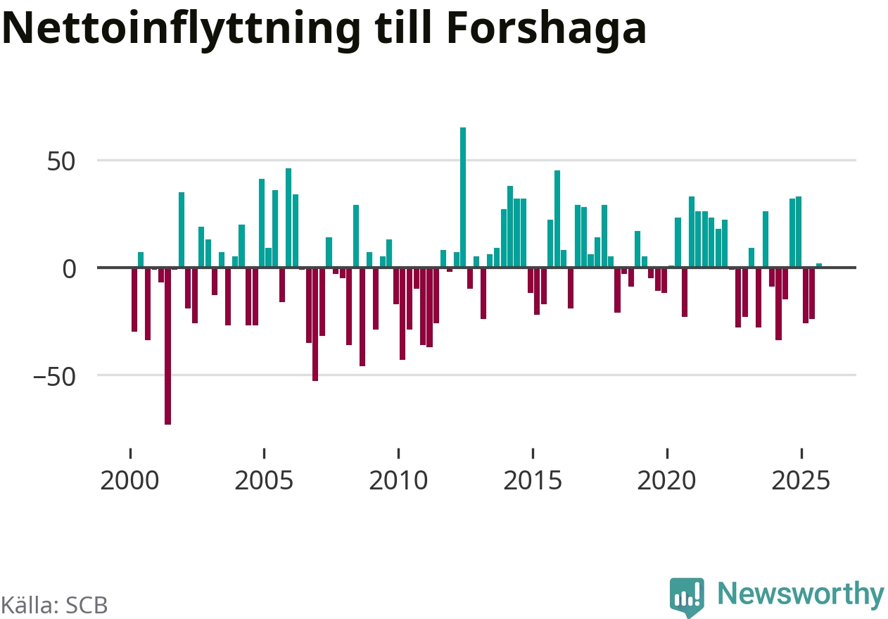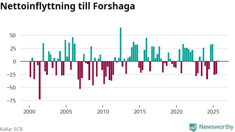 Under tredje kvartalet 2025 flyttade 173 personer till kommunen medan 171 personer flyttade därifrån. Skillnaden mellan antalet in- och utflyttade är så liten att den lika gärna kan bero på SCB:s slumpmässiga brus. Sedan seklets början har Forshaga oftast haft ett positivt flyttnetto.
