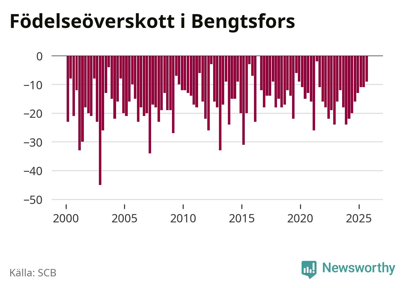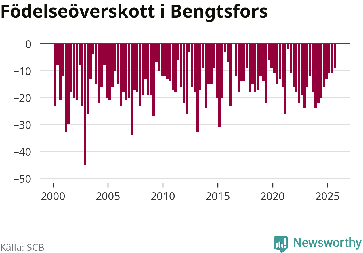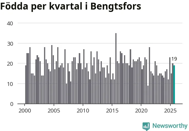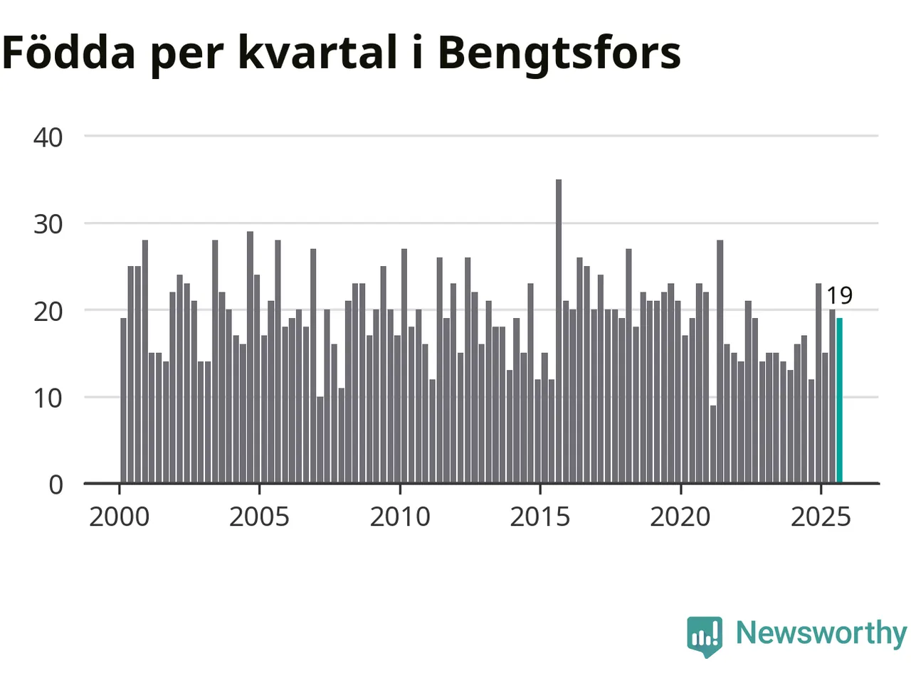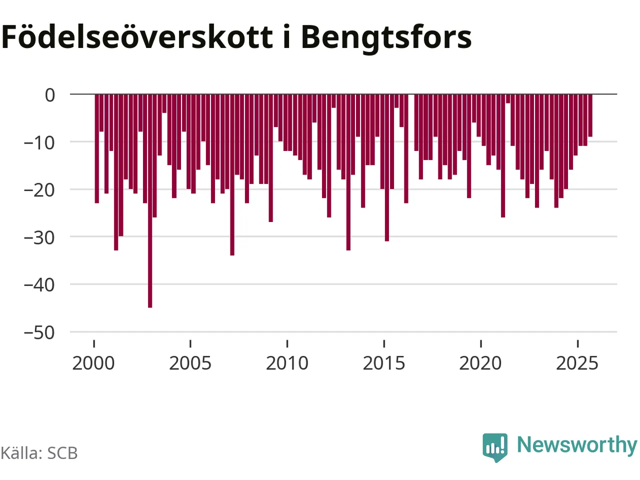 Enligt SCB:s siffror föddes 19 barn i Bengtsfors under det senaste kvartalet. Samtidigt avled 28 personer. Skillnaden mellan antal födda och döda är så liten att det inte går att säga om det beror på något annat än SCB:s röjandeskydd. Kommunen har nästan alltid haft negativt födelsenetto tidigare.