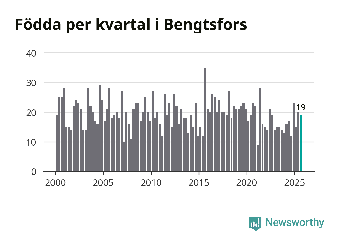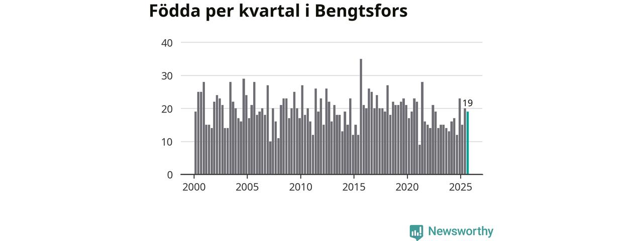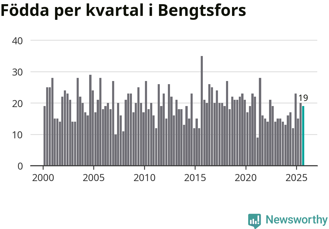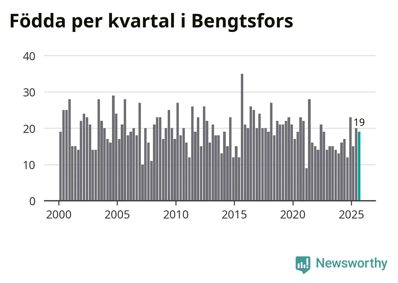 Enligt SCB:s siffror föddes 19 barn i Bengtsfors under det senaste kvartalet. Samtidigt avled 28 personer. Skillnaden mellan antal födda och döda är så liten att det inte går att säga om det beror på något annat än SCB:s röjandeskydd. Kommunen har nästan alltid haft negativt födelsenetto tidigare.