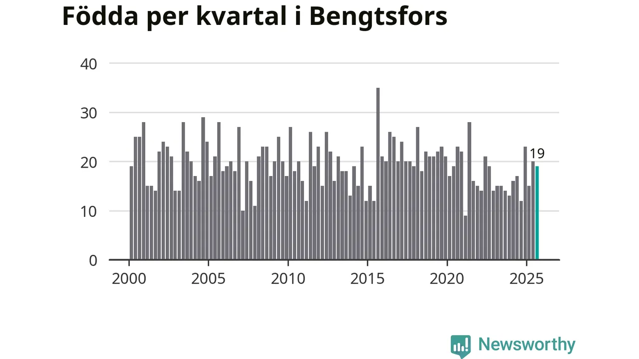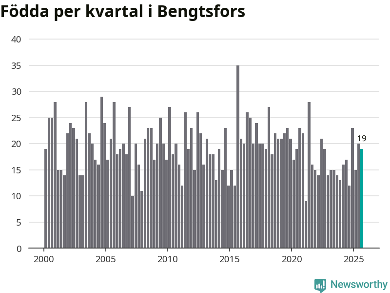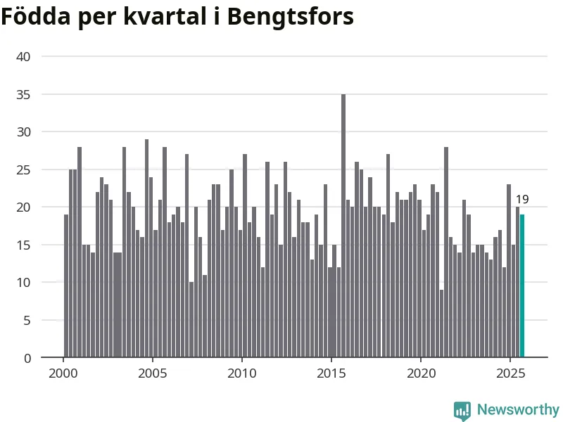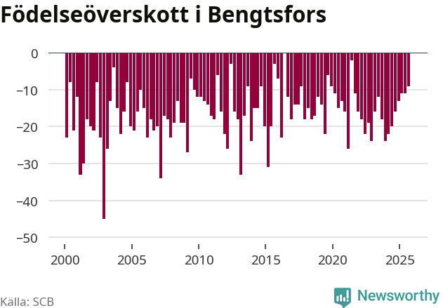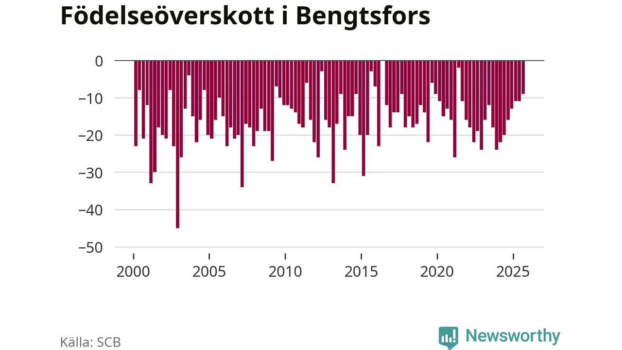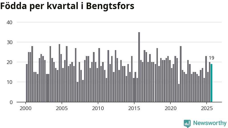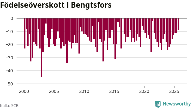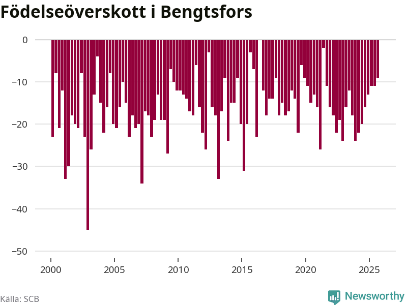 Enligt SCB:s siffror föddes 19 barn i Bengtsfors under det senaste kvartalet. Samtidigt avled 28 personer. Skillnaden mellan antal födda och döda är så liten att det inte går att säga om det beror på något annat än SCB:s röjandeskydd. Kommunen har nästan alltid haft negativt födelsenetto tidigare.