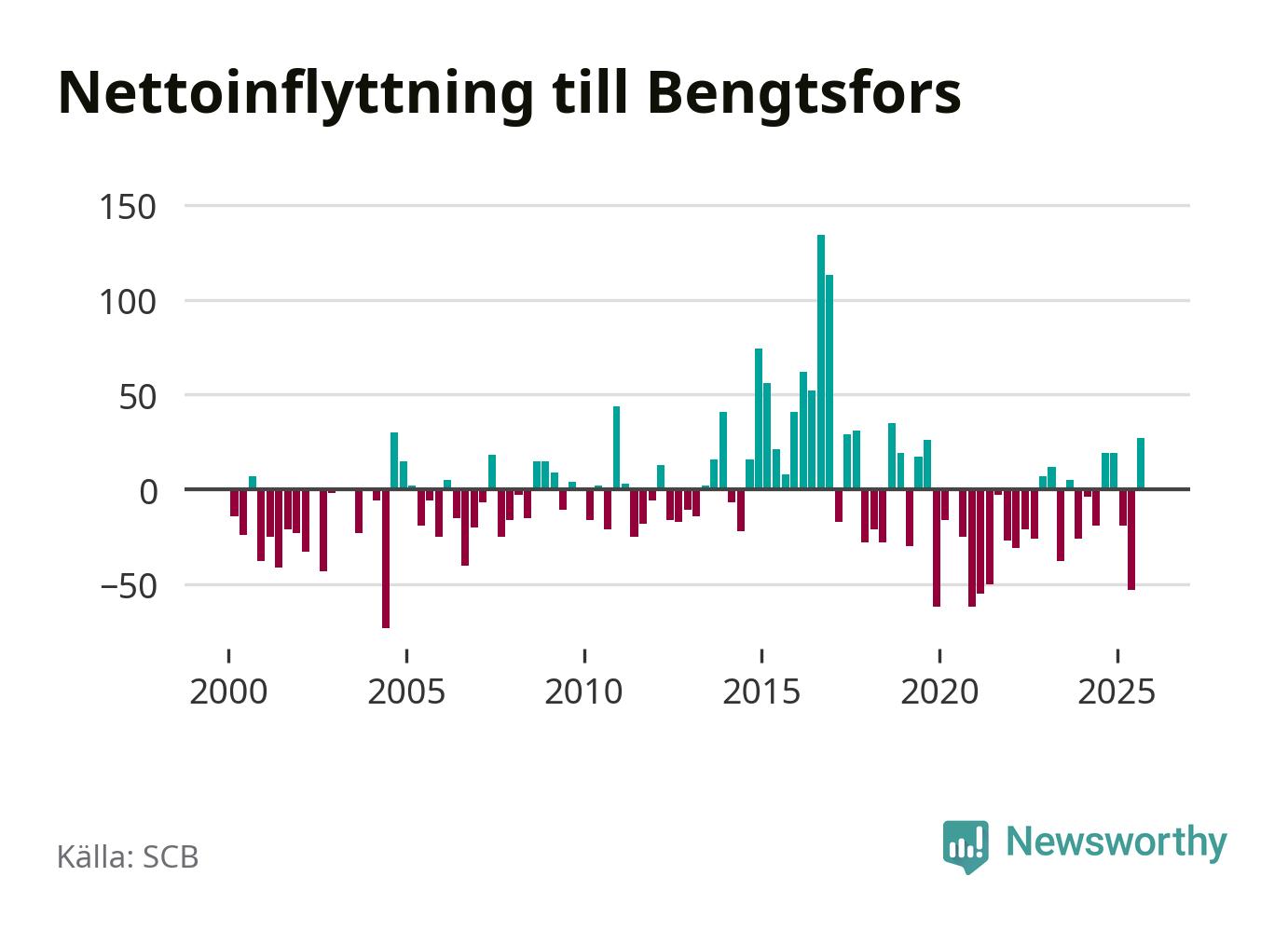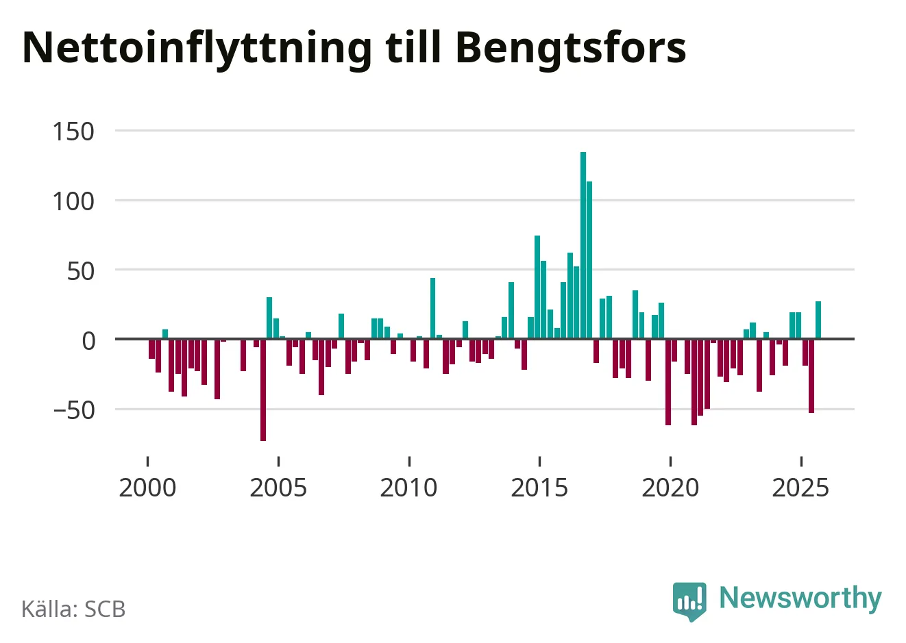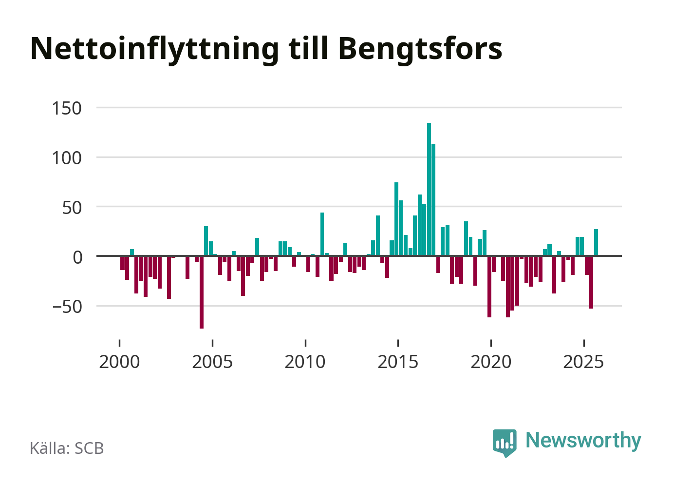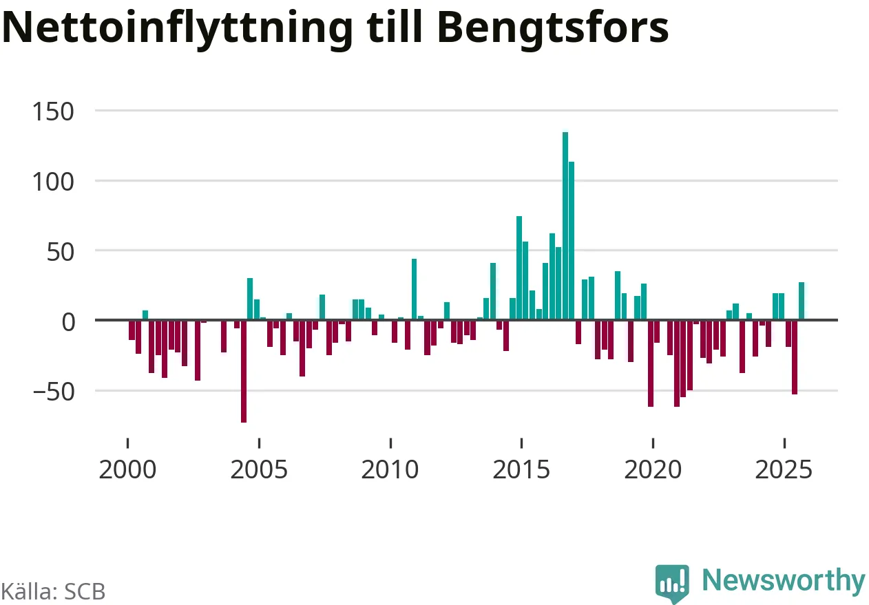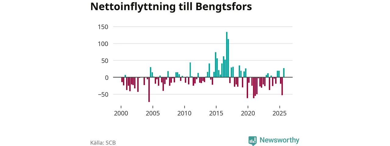 Under tredje kvartalet 2025 flyttade 187 personer till kommunen medan 160 personer flyttade därifrån. Det är historiskt sett en stor inflyttning under ett kvartal. Sedan seklets början har Bengtsfors oftast haft ett negativt flyttnetto, inklusive det senaste kvartalet.