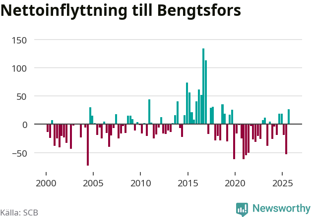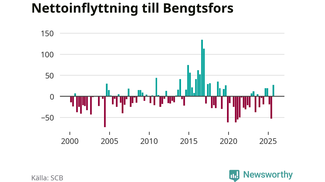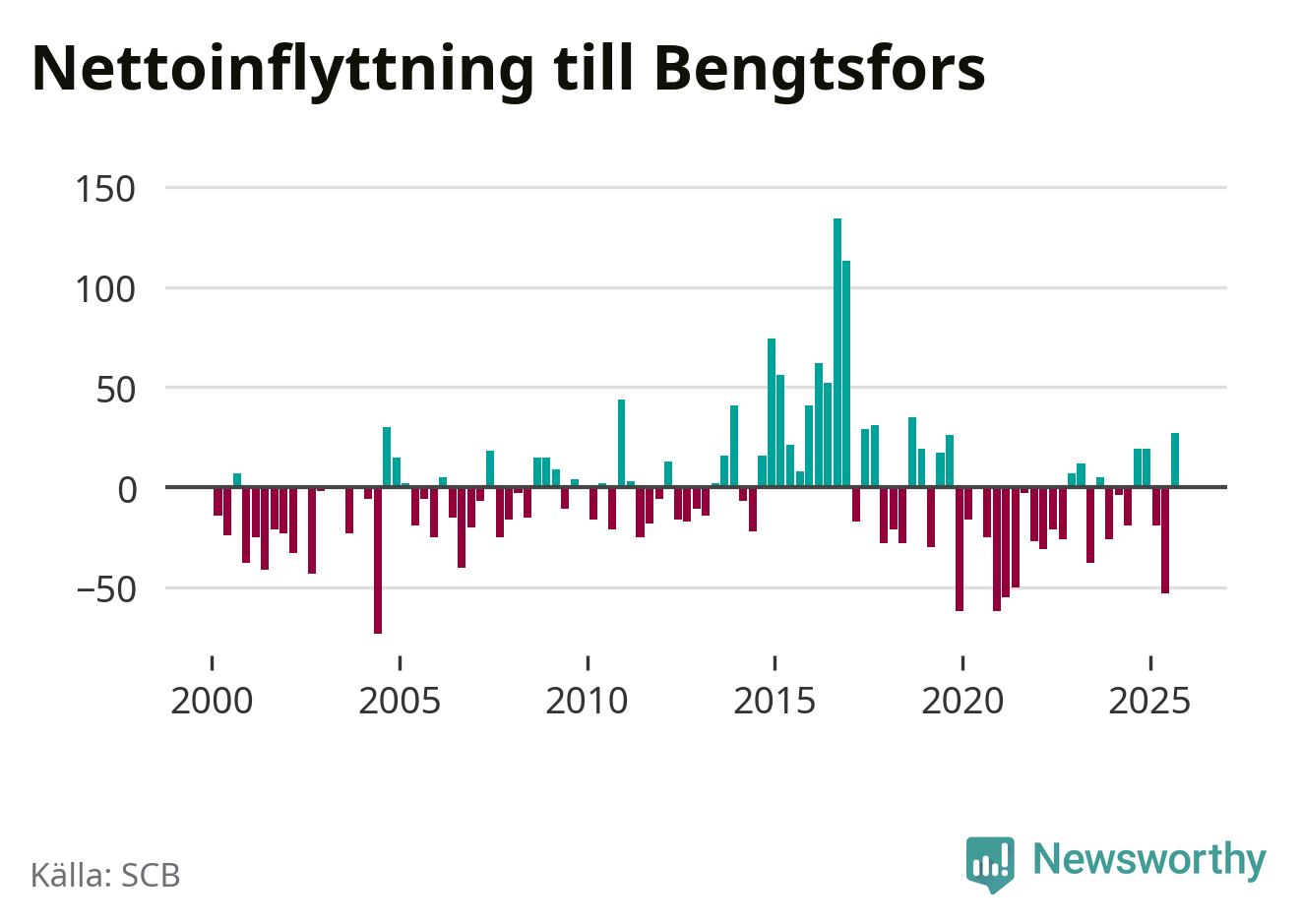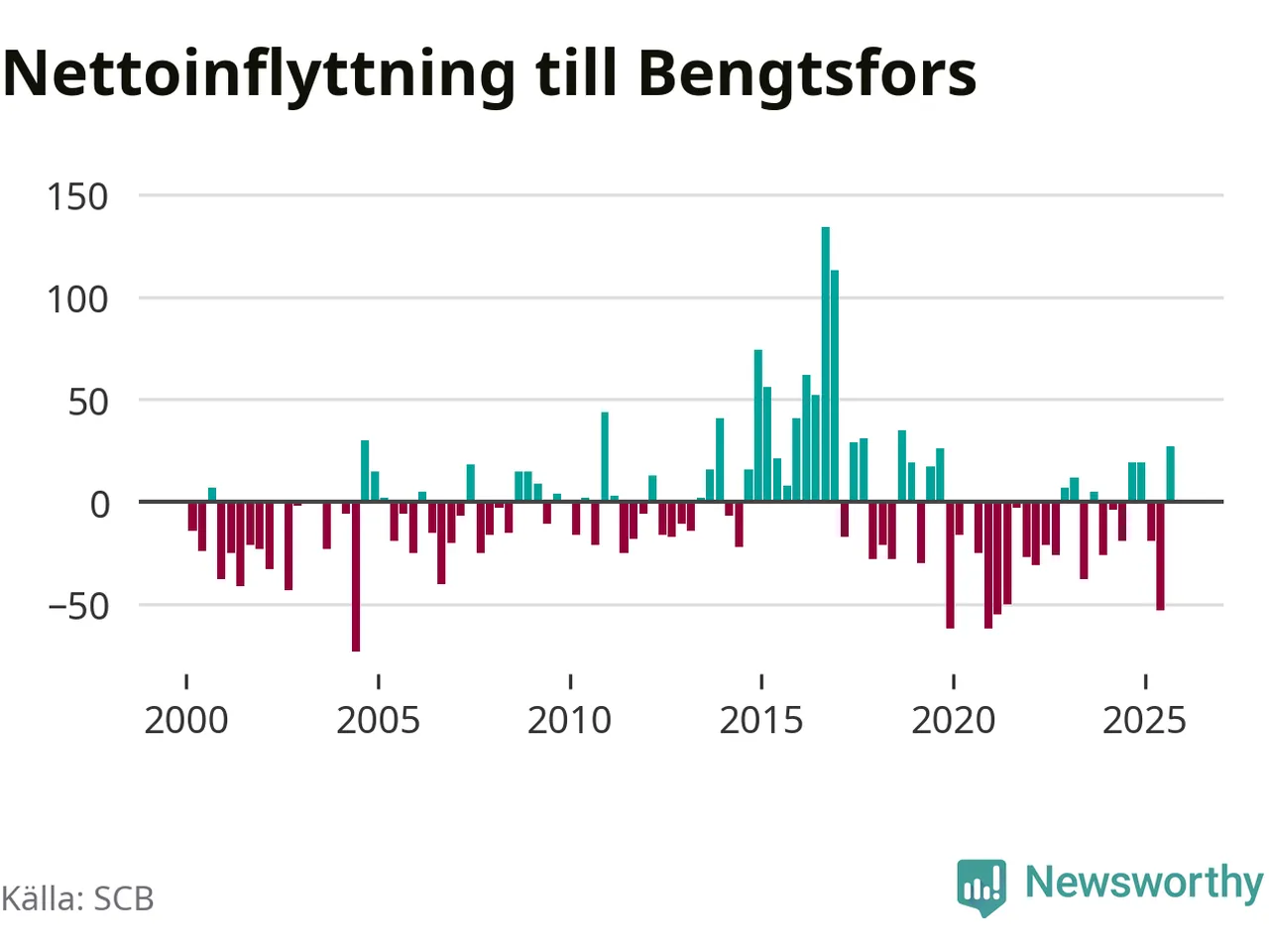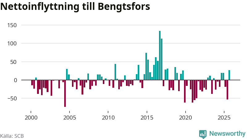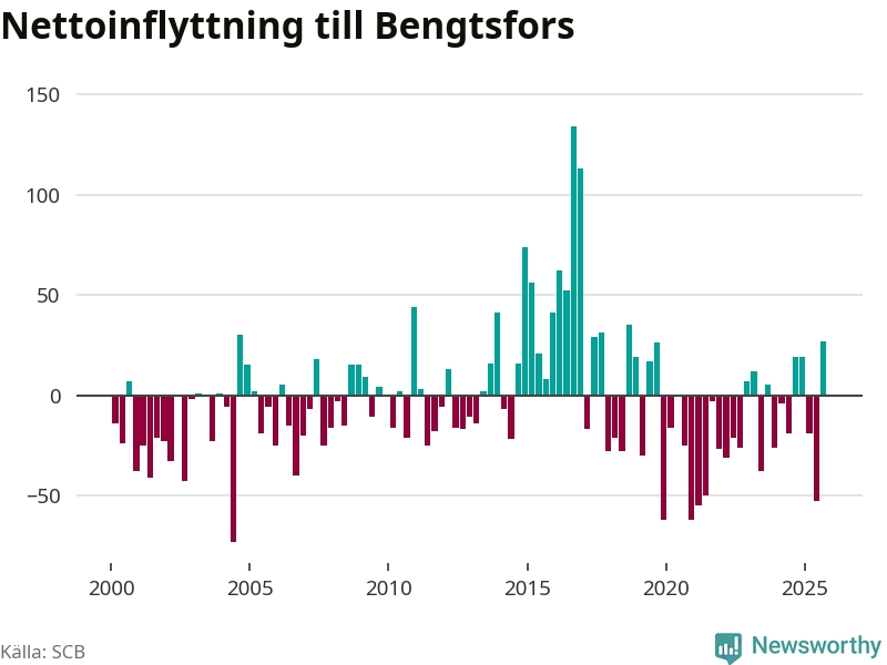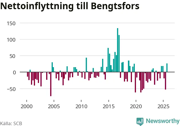 Under tredje kvartalet 2025 flyttade 187 personer till kommunen medan 160 personer flyttade därifrån. Det är historiskt sett en stor inflyttning under ett kvartal. Sedan seklets början har Bengtsfors oftast haft ett negativt flyttnetto, inklusive det senaste kvartalet.