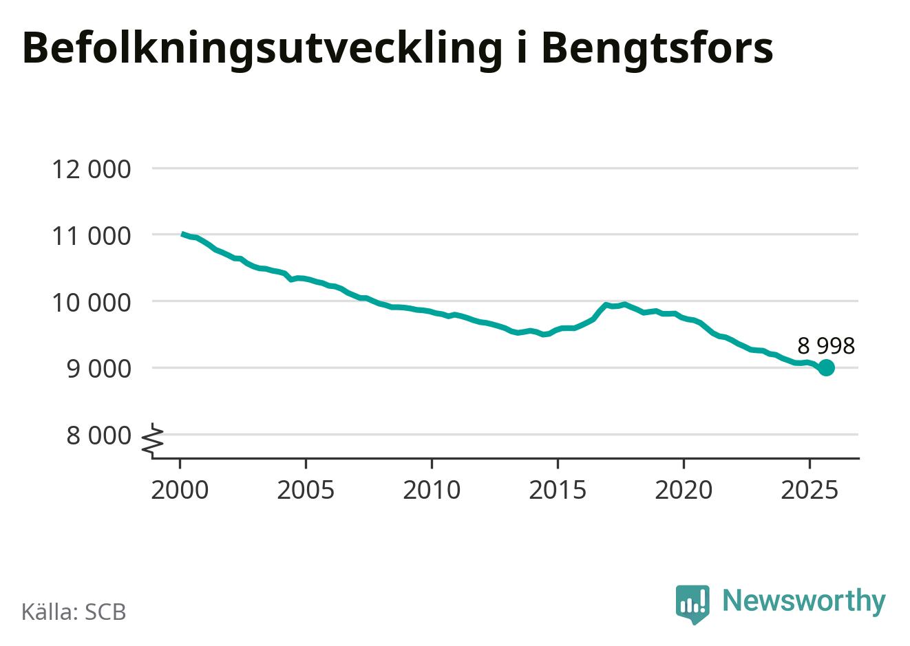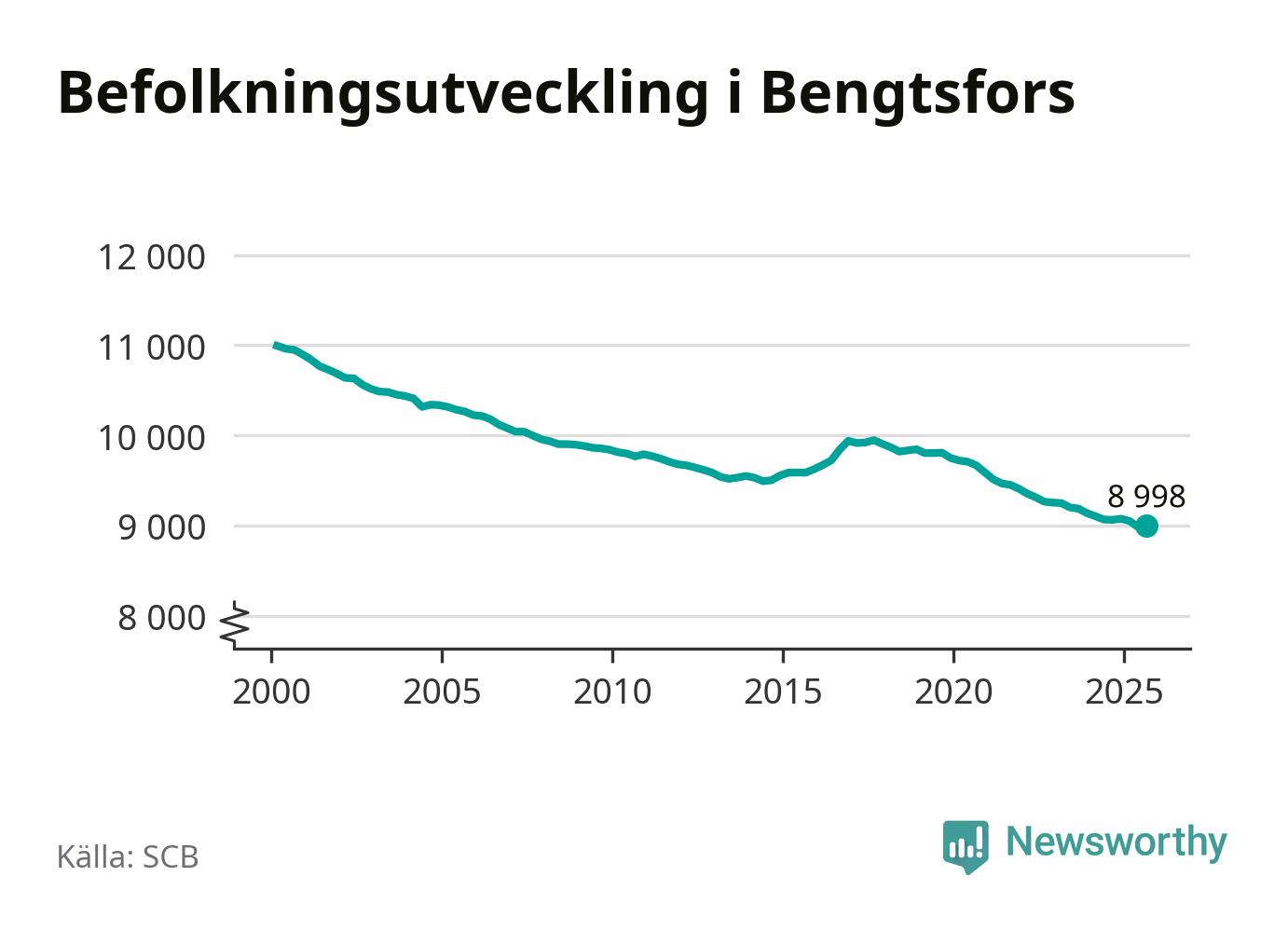 Jämfört med för ett år sedan har befolkningen i Bengtsfors minskat med knappt 70 personer – vilket motsvarar en nedgång på 0,7 procent. Sedan millennieskiftet har folkmängden minskat med runt 2 000 personer, eller 18 procent. Det är den största minskningen i Västra Götaland under den perioden.
