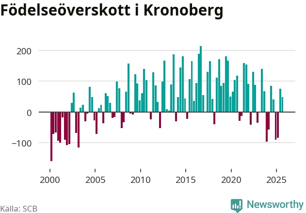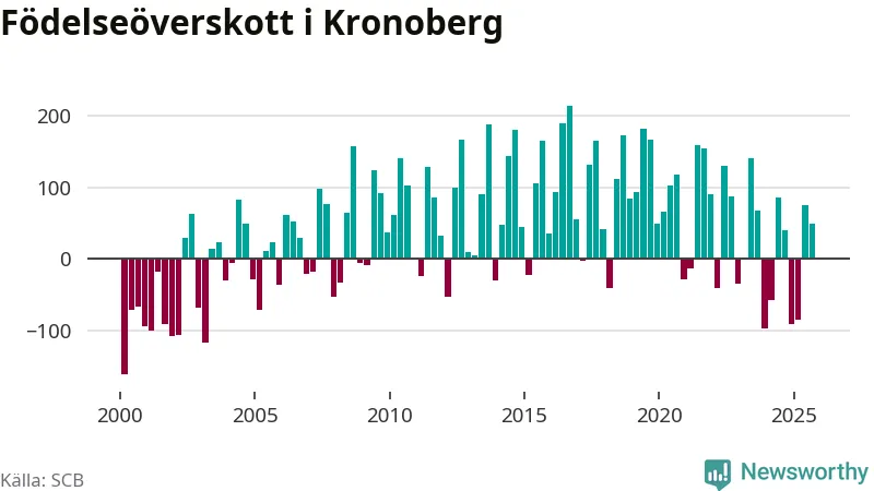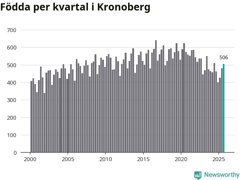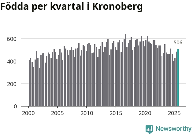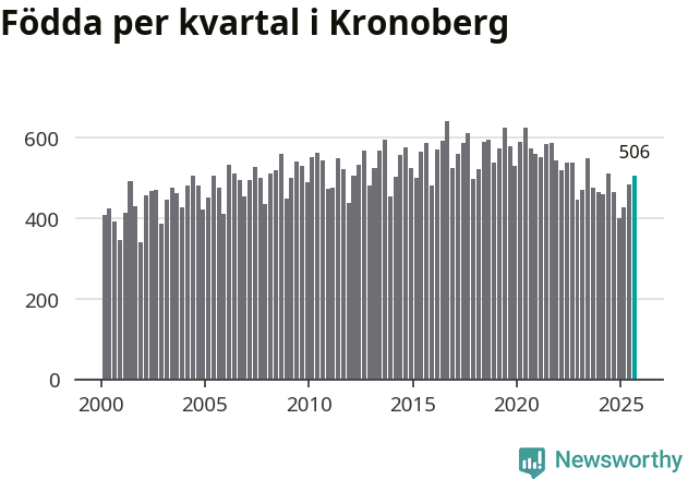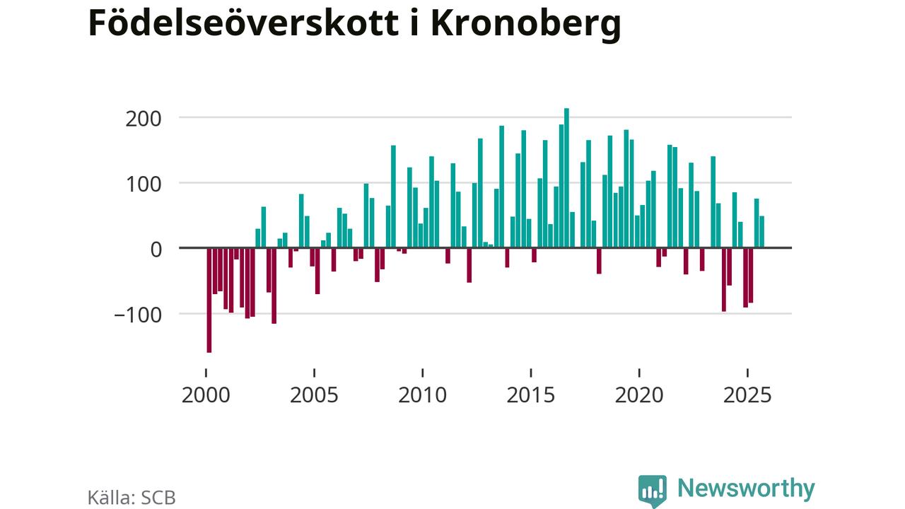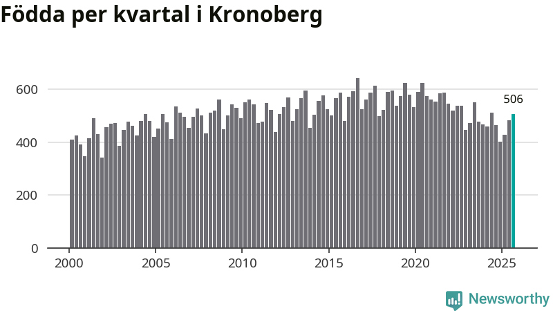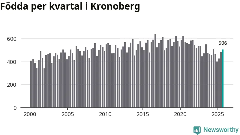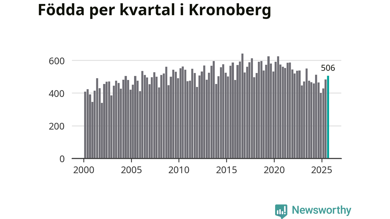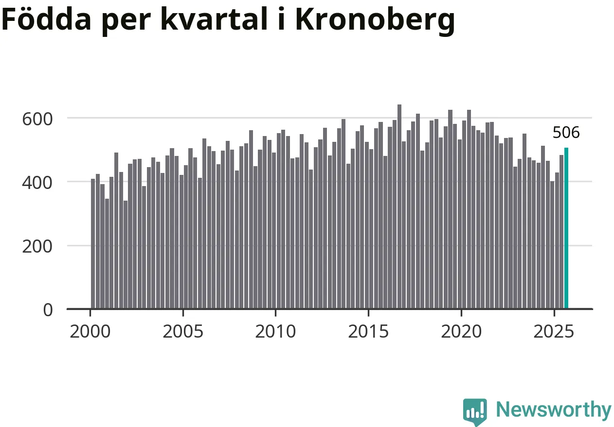 Enligt SCB:s siffror föddes 506 barn i Kronoberg under det senaste kvartalet. Samtidigt avled 457 personer. Kronoberg hade alltså ett positivt födelsenetto, vilket länet historiskt sett oftast har haft.