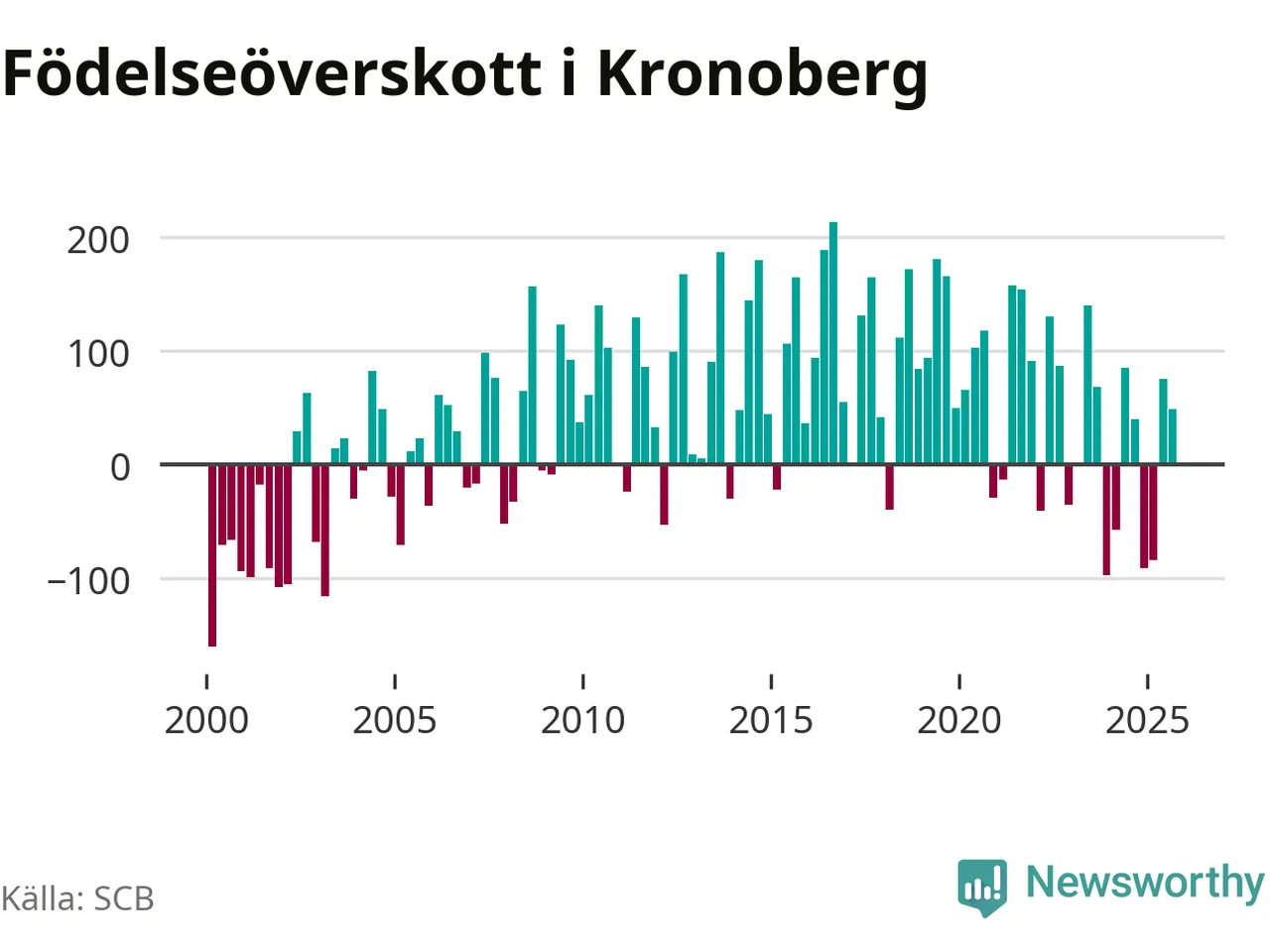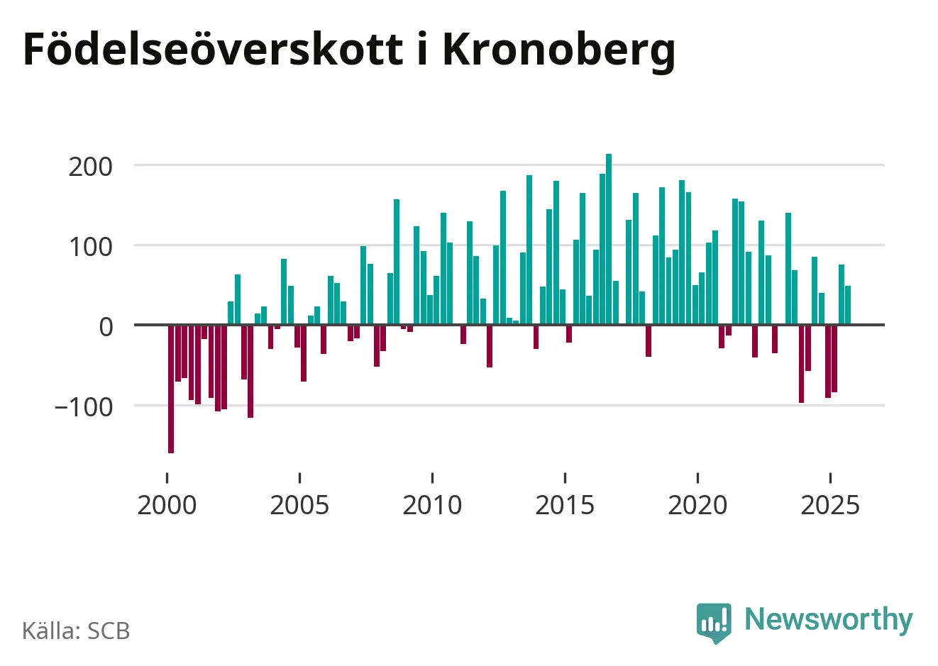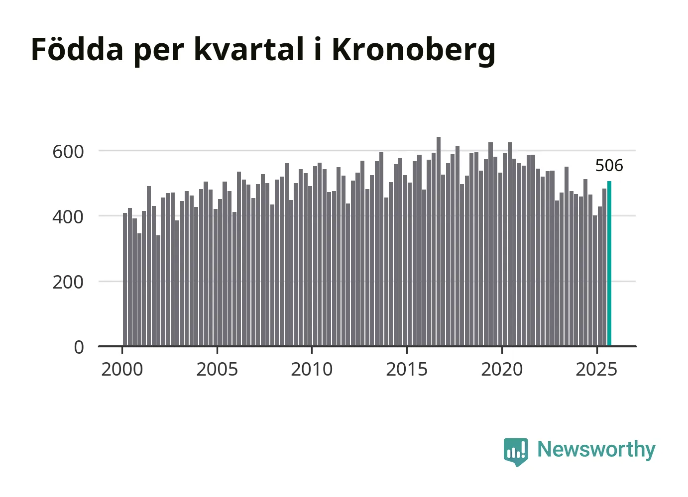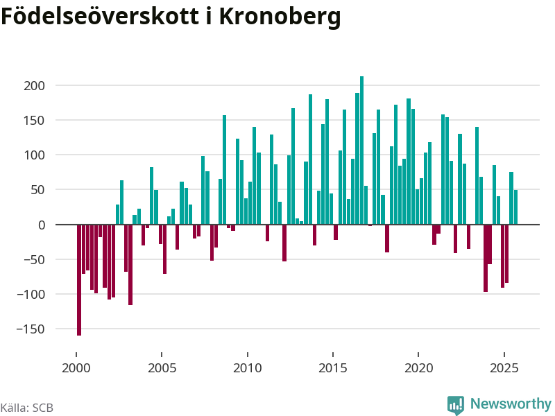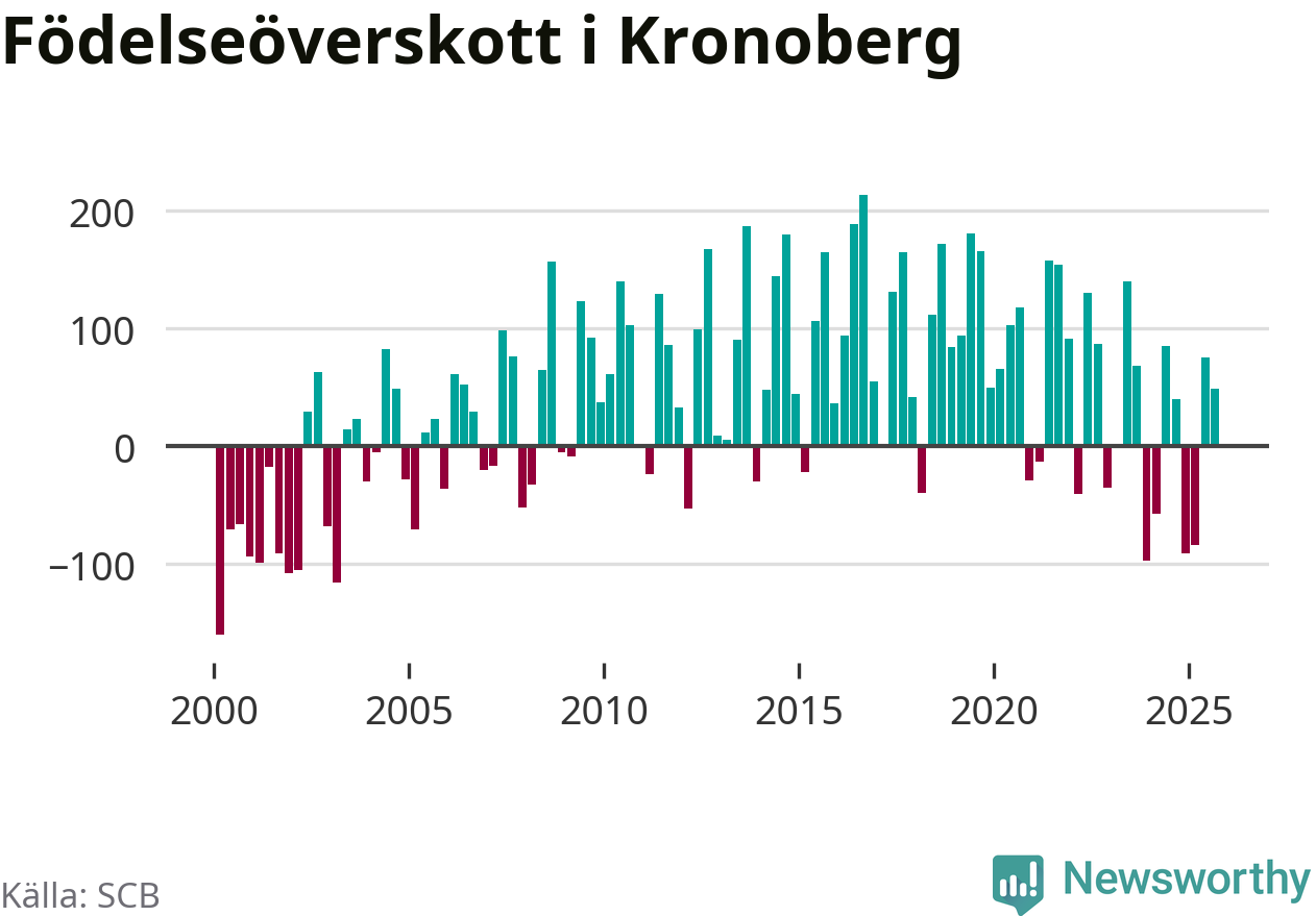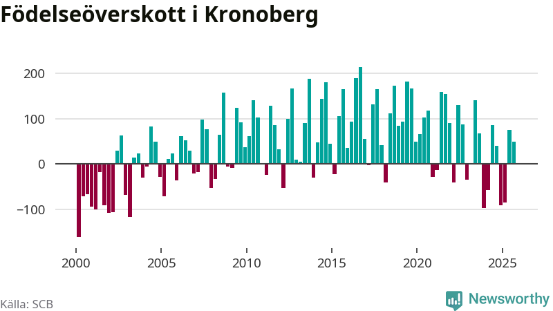 Enligt SCB:s siffror föddes 506 barn i Kronoberg under det senaste kvartalet. Samtidigt avled 457 personer. Kronoberg hade alltså ett positivt födelsenetto, vilket länet historiskt sett oftast har haft.