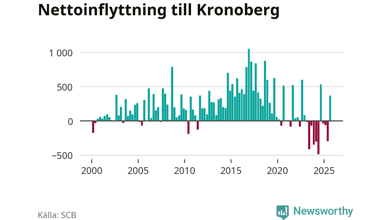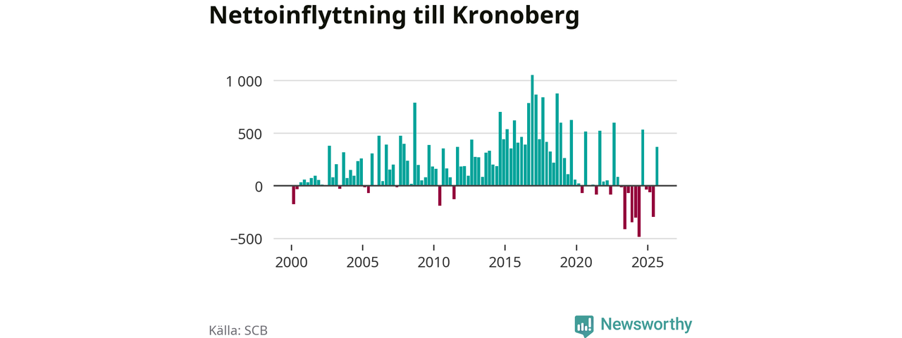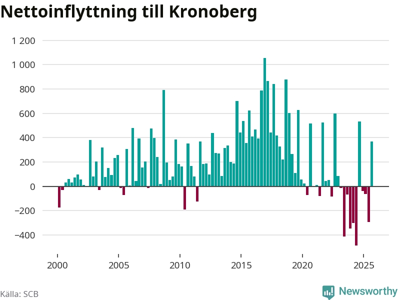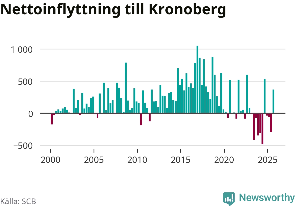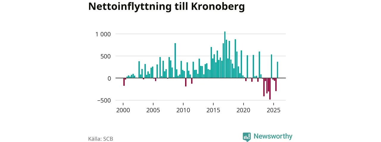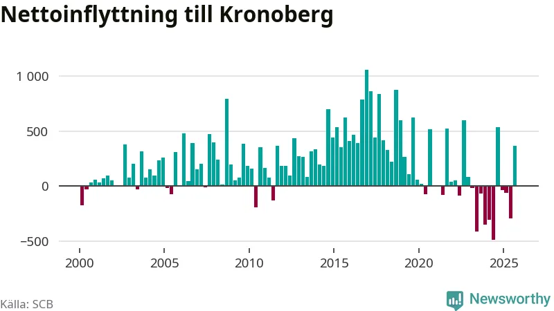 Under tredje kvartalet 2025 flyttade 3 075 personer till länet medan 2 707 personer flyttade därifrån. Det är historiskt sett en stor inflyttning under ett kvartal – men samtidigt var utflyttningen relativt stor. Sedan seklets början har Kronoberg oftast haft ett positivt flyttnetto, inklusive det senaste kvartalet.