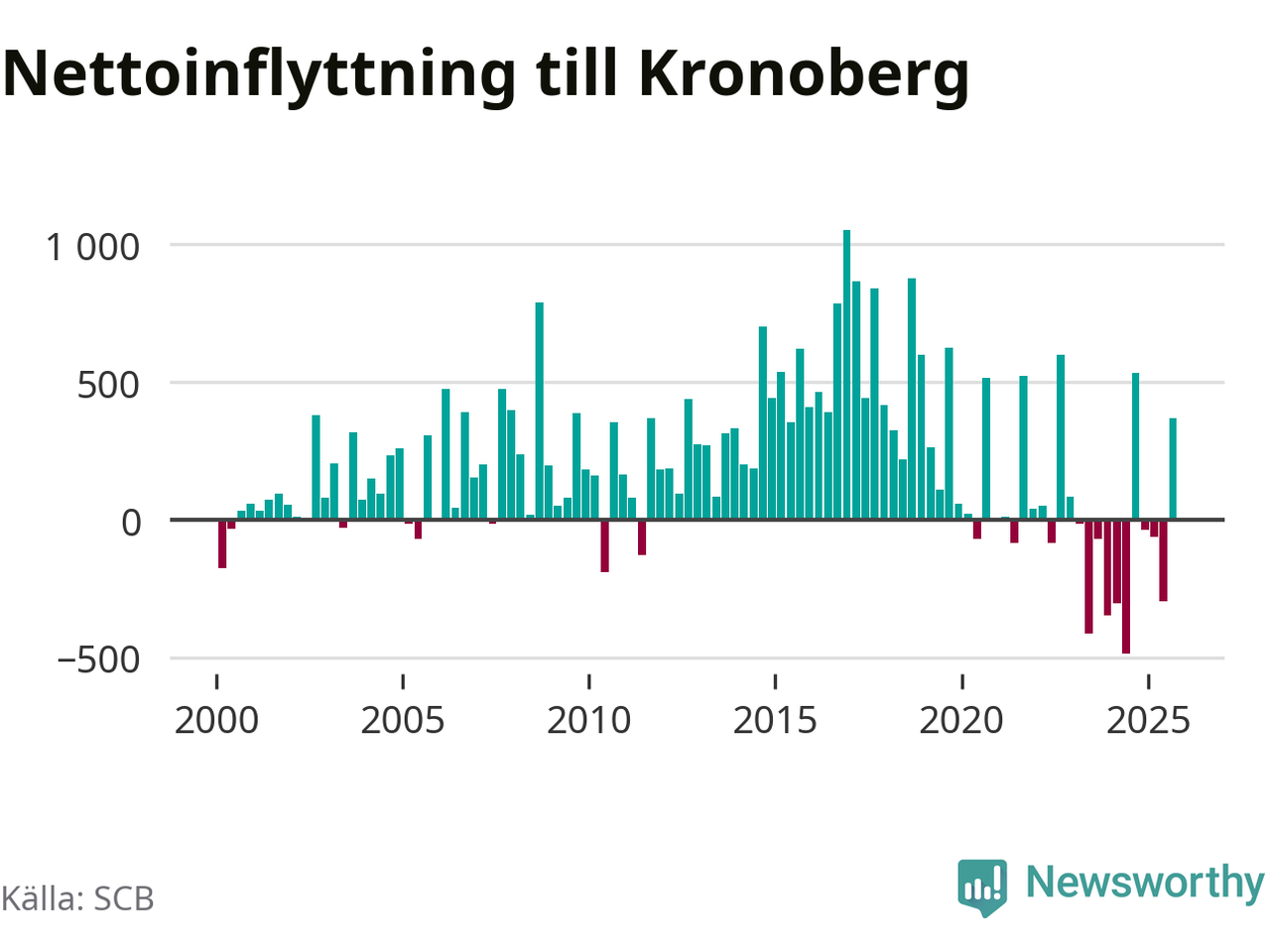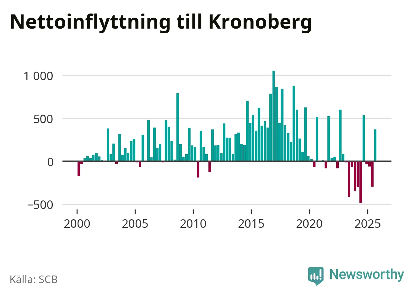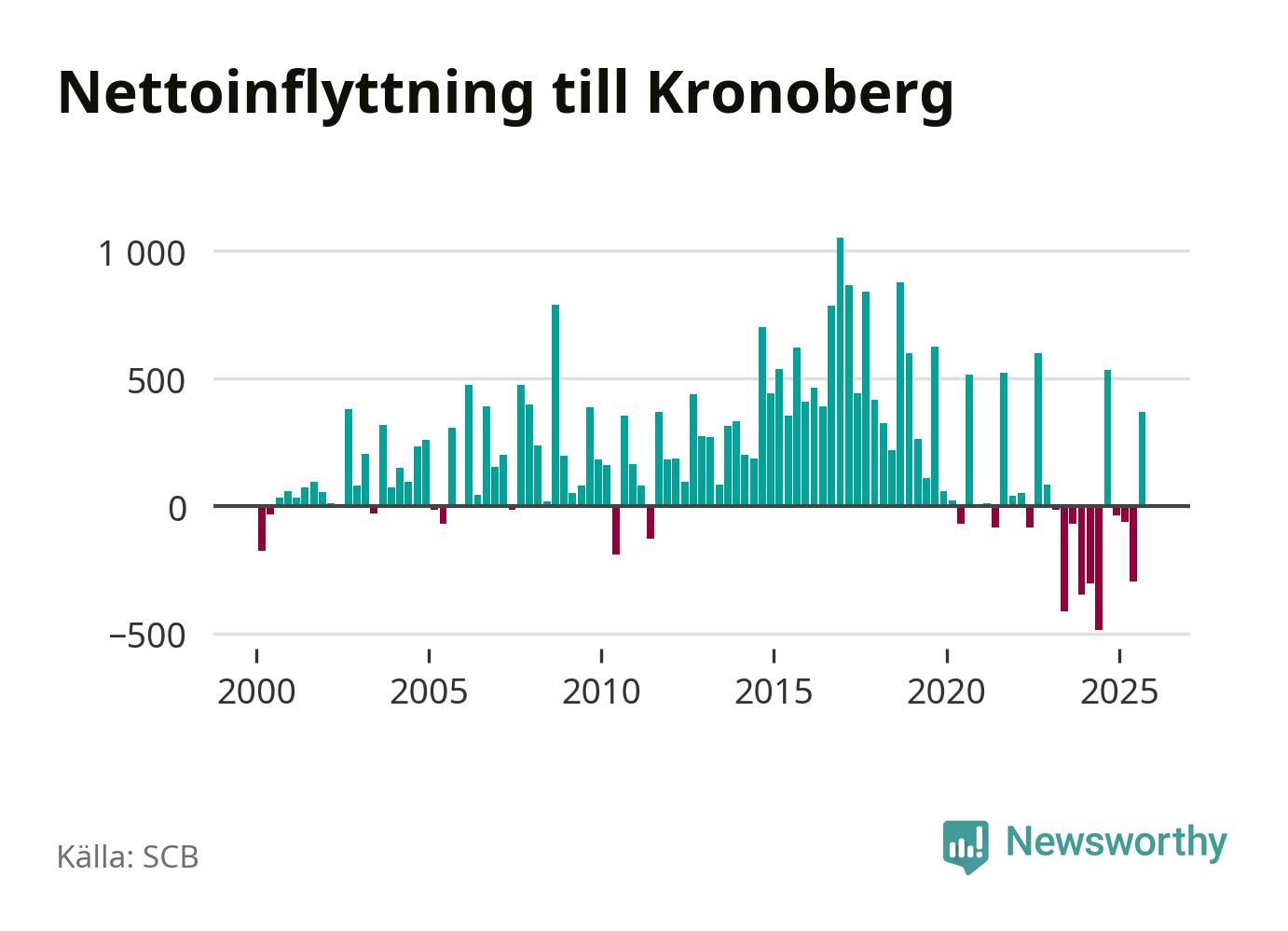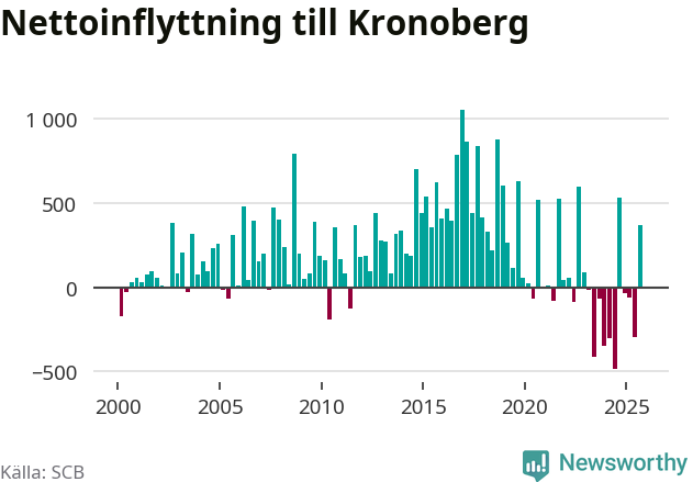 Under tredje kvartalet 2025 flyttade 3 075 personer till länet medan 2 707 personer flyttade därifrån. Det är historiskt sett en stor inflyttning under ett kvartal – men samtidigt var utflyttningen relativt stor. Sedan seklets början har Kronoberg oftast haft ett positivt flyttnetto, inklusive det senaste kvartalet.