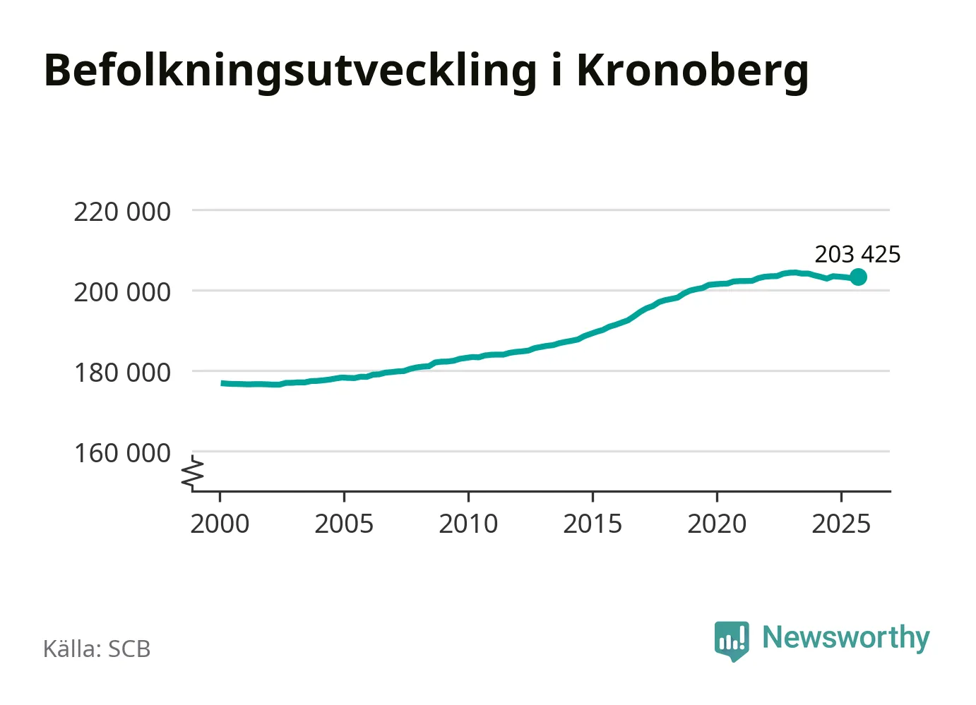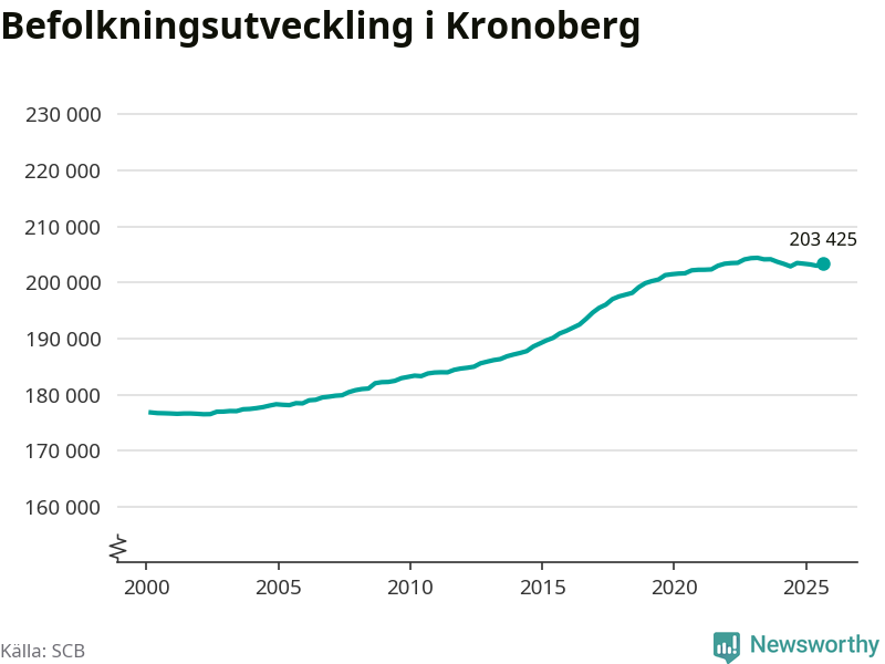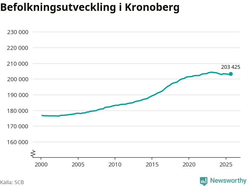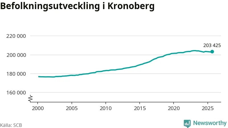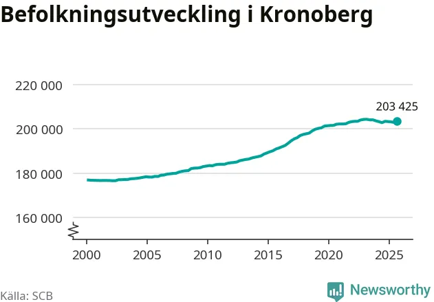 Jämfört med för ett år sedan har befolkningen i Kronoberg minskat med ungefär 50 personer. Sedan millennieskiftet har folkmängden ökat med runt 26 600 personer, eller 15 procent.
