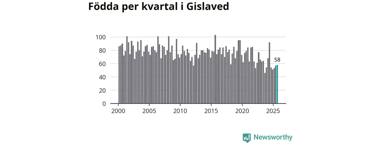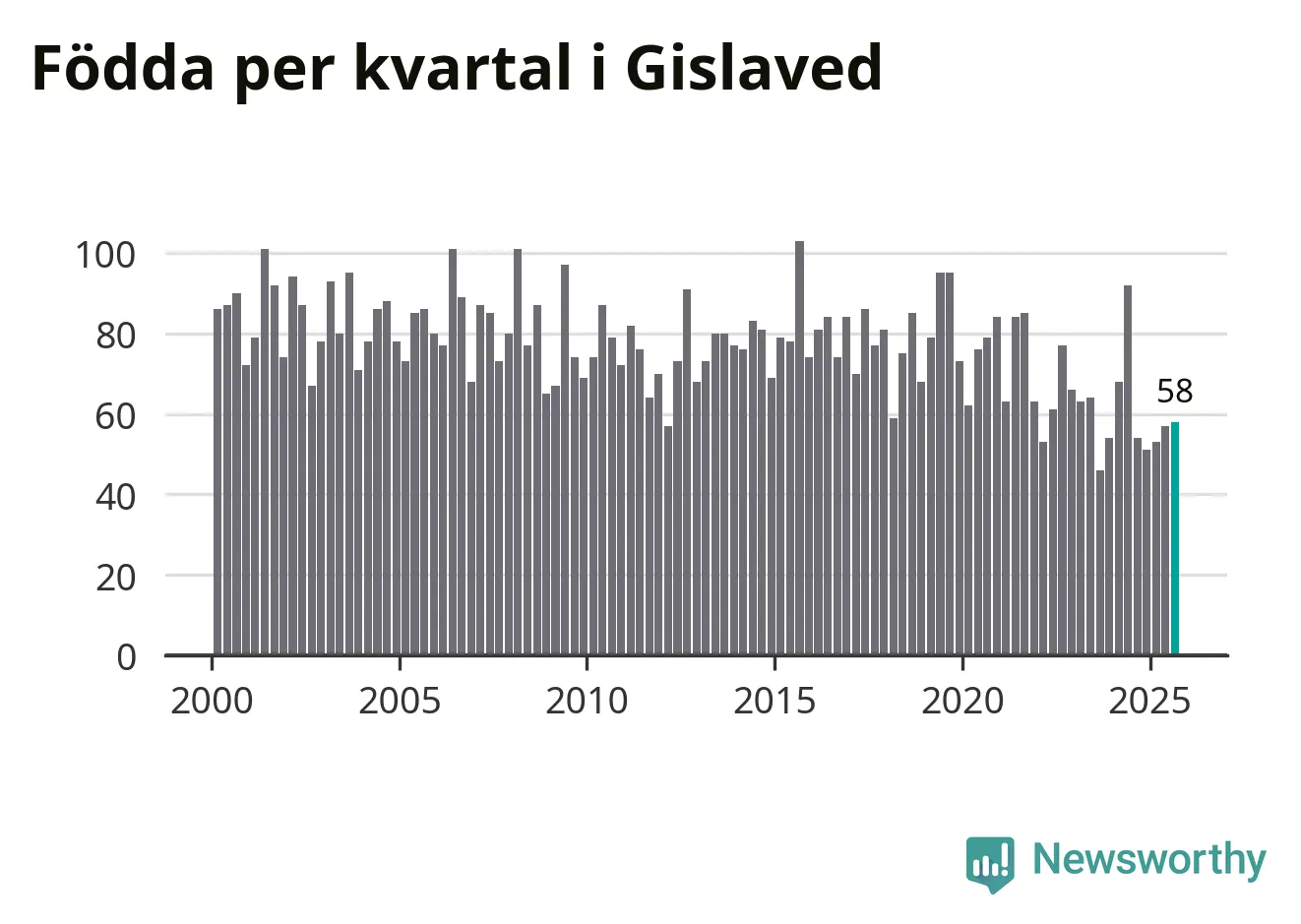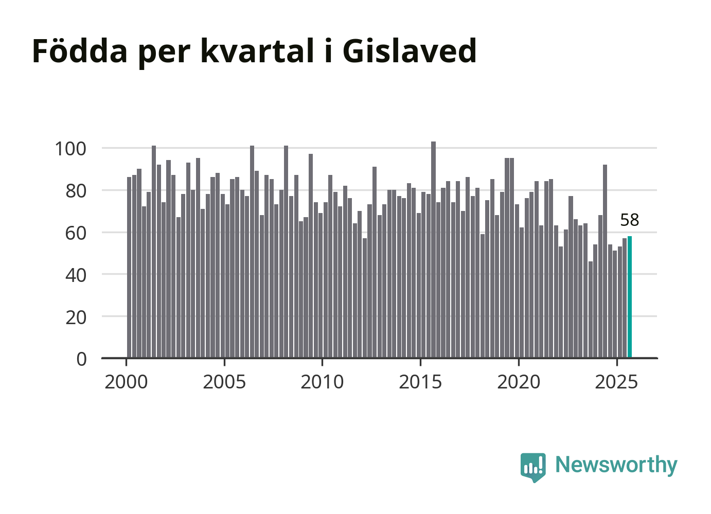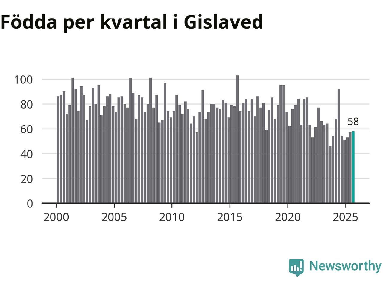 Enligt SCB:s siffror föddes 58 barn i Gislaved under det senaste kvartalet. Samtidigt avled relativt få – 59 personer. Skillnaden mellan antal födda och döda är så liten att det inte går att säga om det beror på något annat än SCB:s röjandeskydd. Kommunen har historiskt sett haft ungefär lika många kvartal med positivt födelsenetto som negativt.