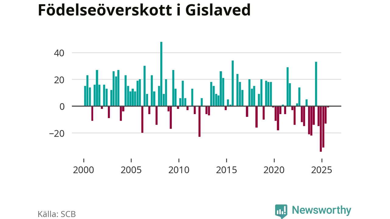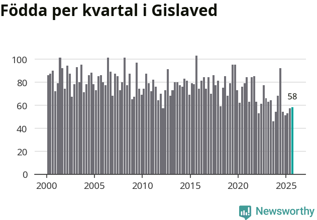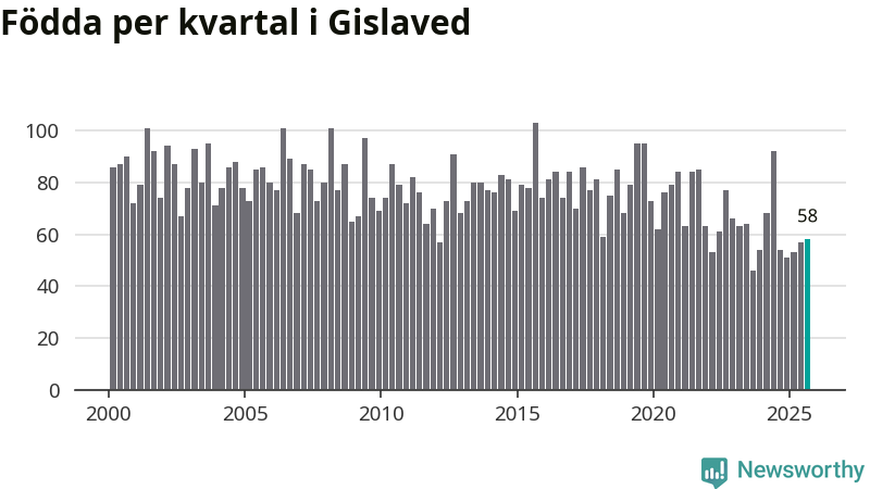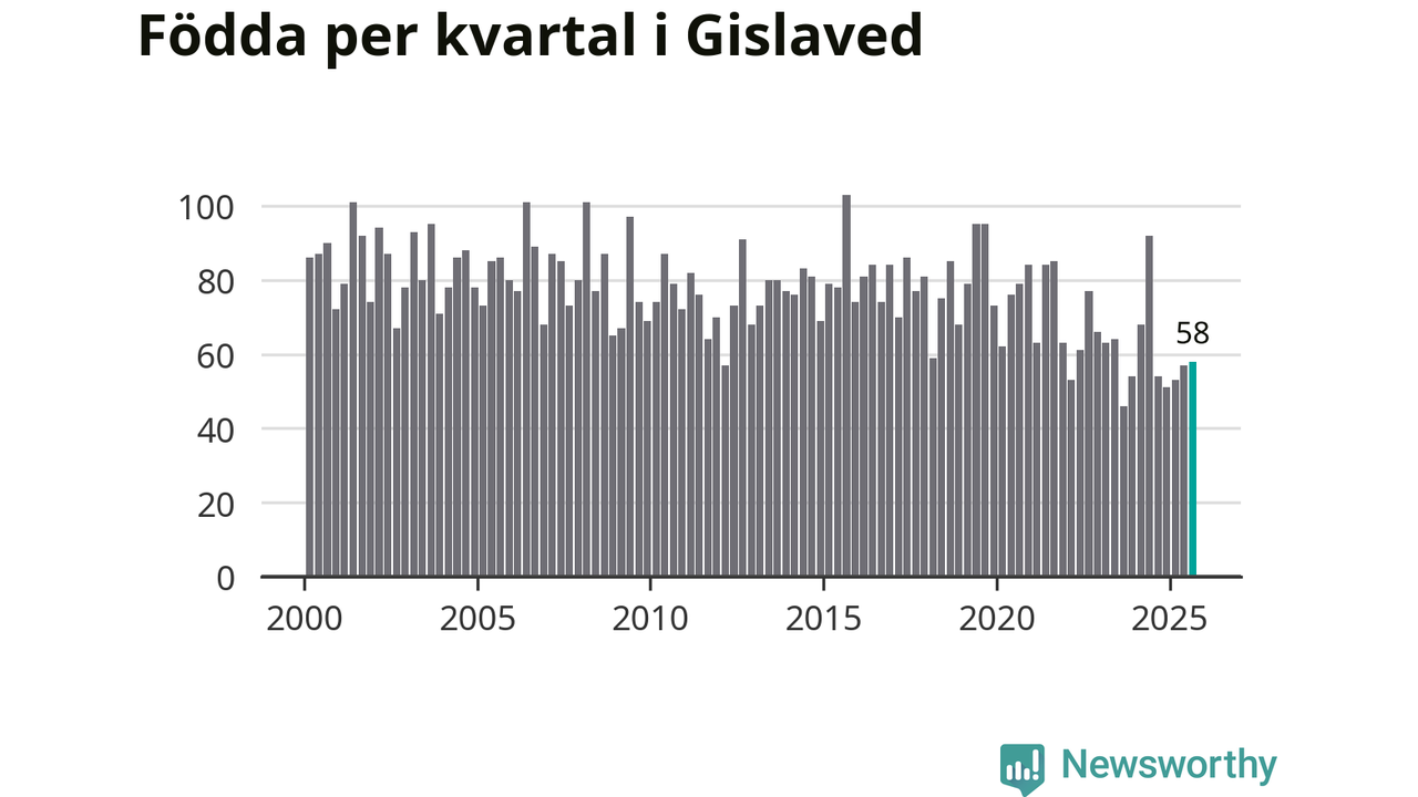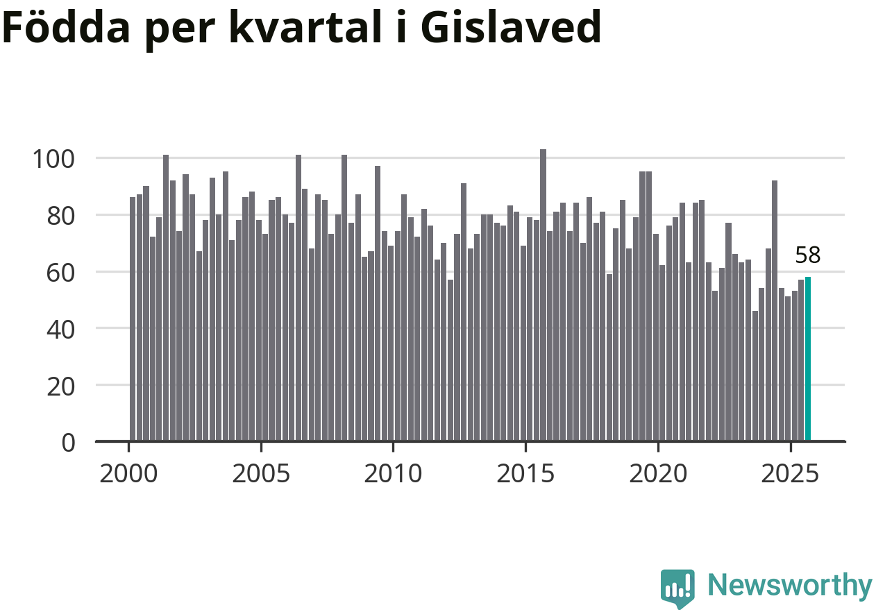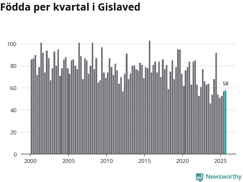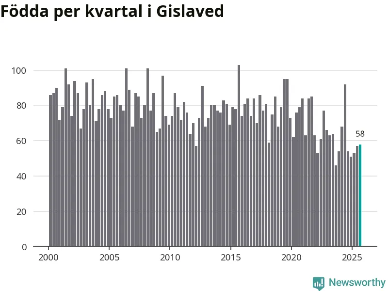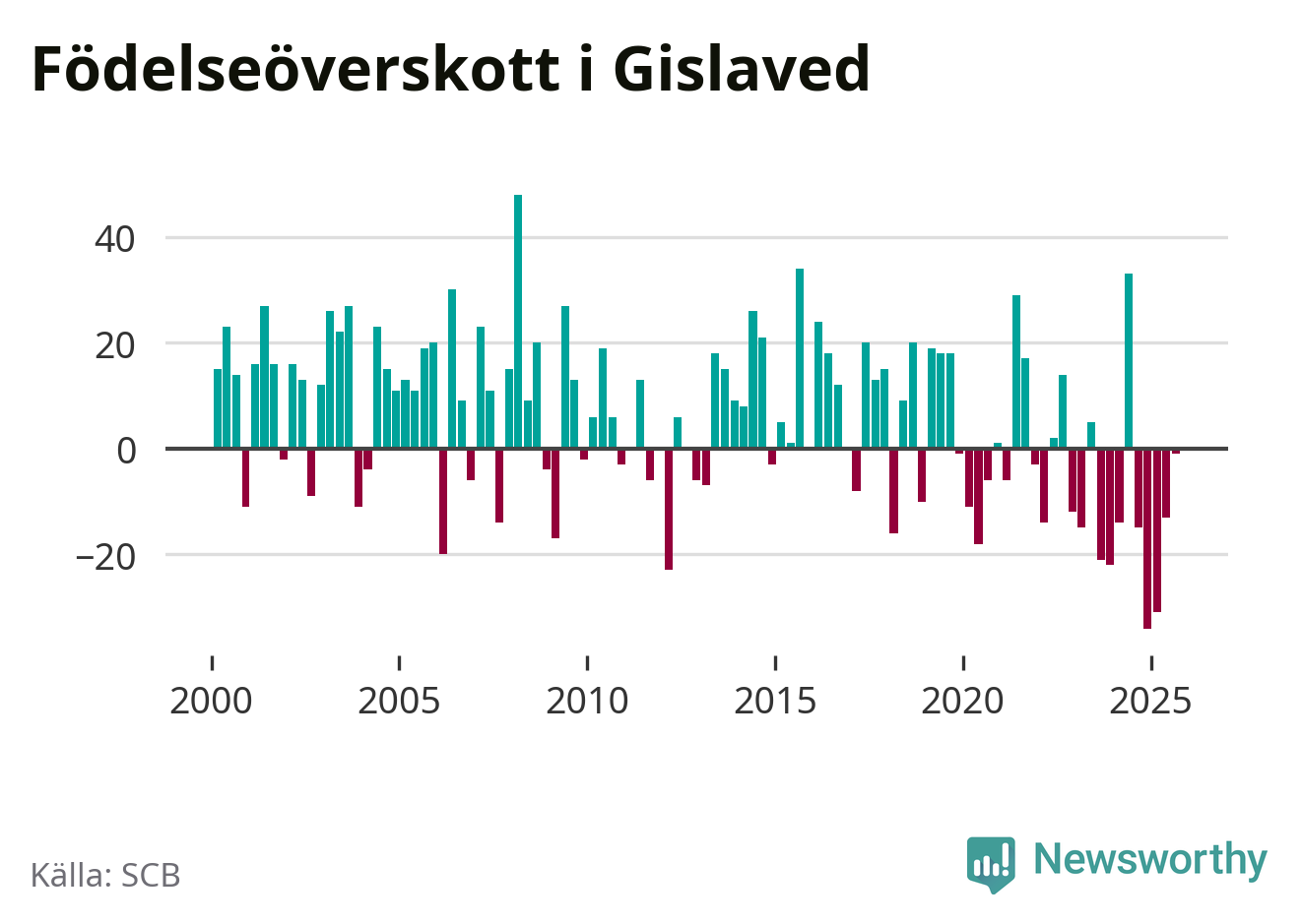 Enligt SCB:s siffror föddes 58 barn i Gislaved under det senaste kvartalet. Samtidigt avled relativt få – 59 personer. Skillnaden mellan antal födda och döda är så liten att det inte går att säga om det beror på något annat än SCB:s röjandeskydd. Kommunen har historiskt sett haft ungefär lika många kvartal med positivt födelsenetto som negativt.