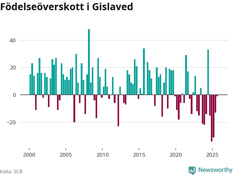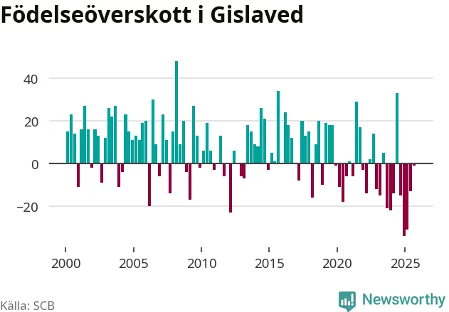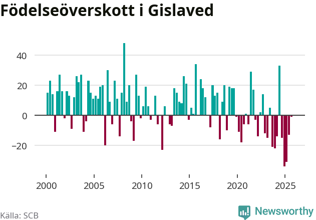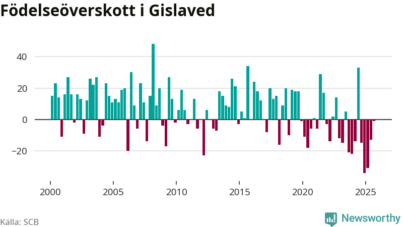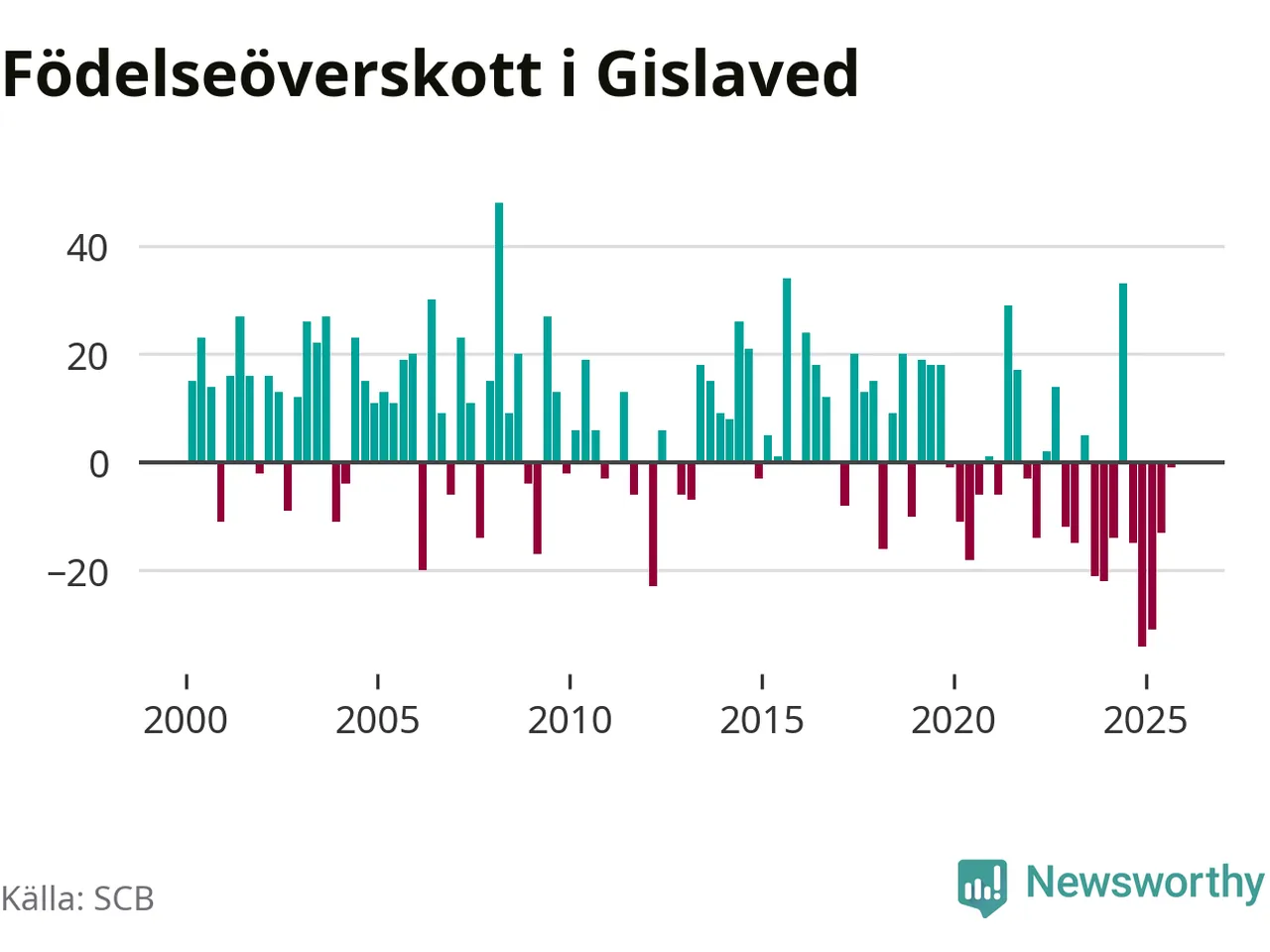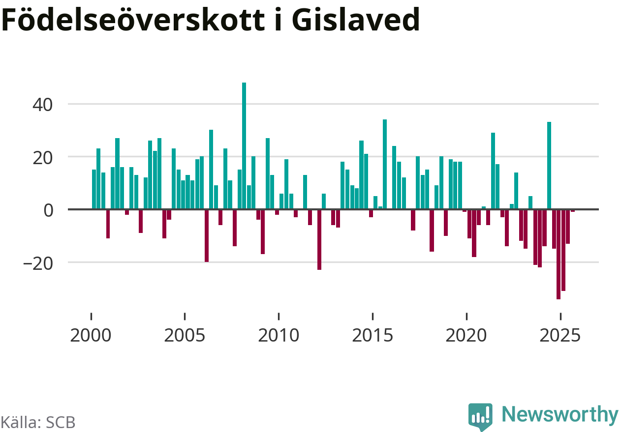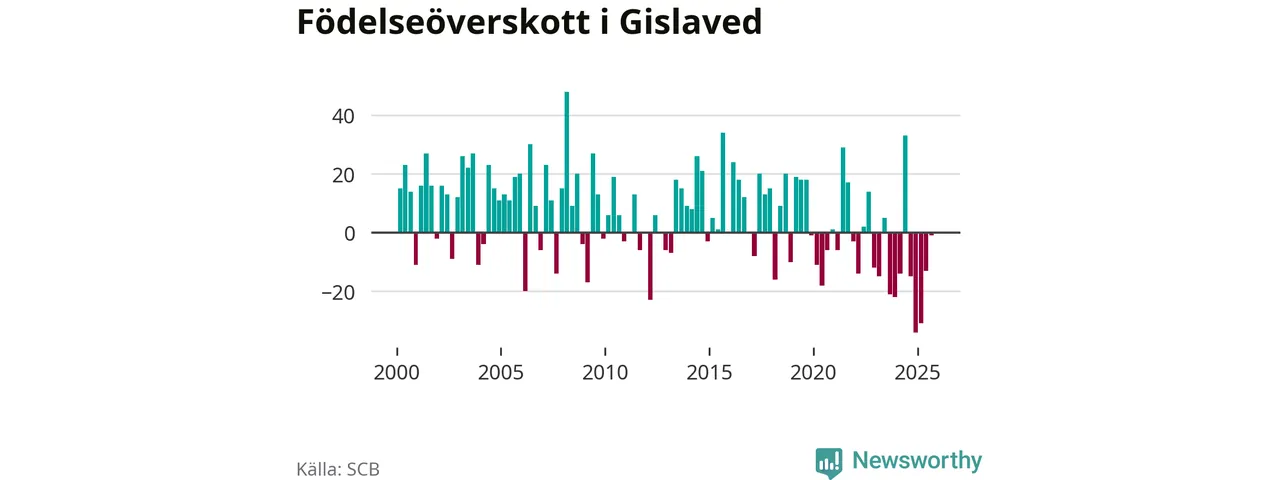 Enligt SCB:s siffror föddes 58 barn i Gislaved under det senaste kvartalet. Samtidigt avled relativt få – 59 personer. Skillnaden mellan antal födda och döda är så liten att det inte går att säga om det beror på något annat än SCB:s röjandeskydd. Kommunen har historiskt sett haft ungefär lika många kvartal med positivt födelsenetto som negativt.