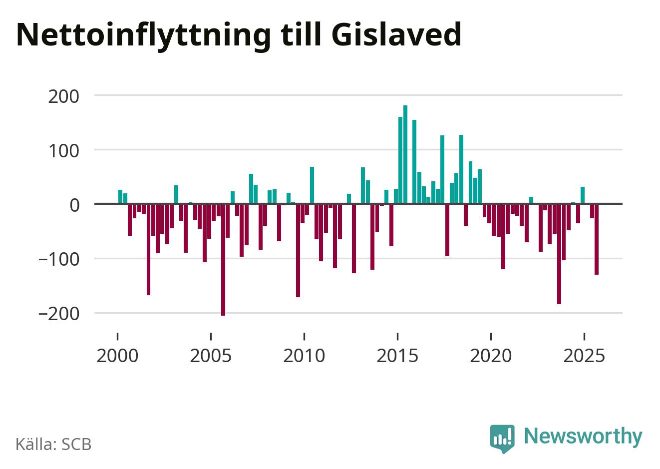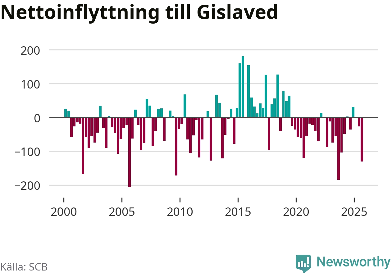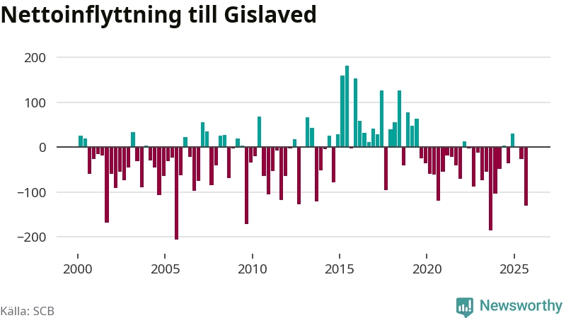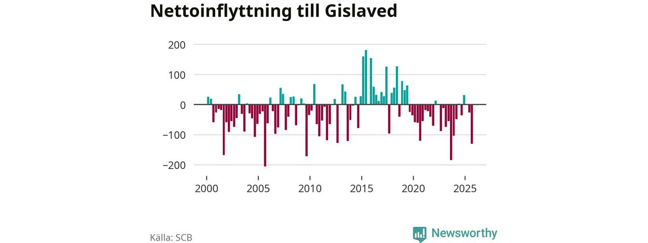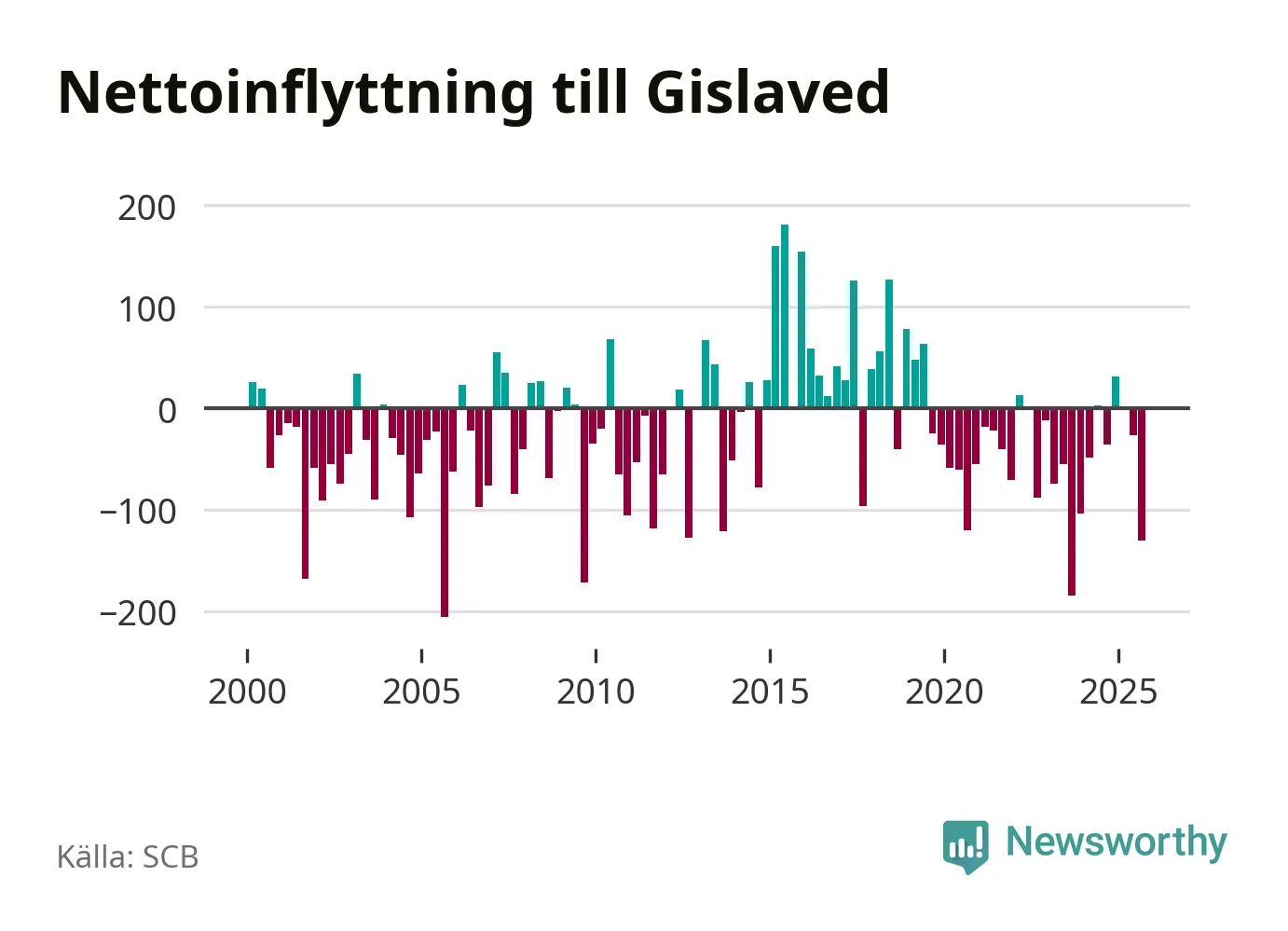 Under tredje kvartalet 2025 flyttade 297 personer till kommunen medan 427 personer flyttade därifrån. Sedan seklets början har Gislaved oftast haft ett negativt flyttnetto.