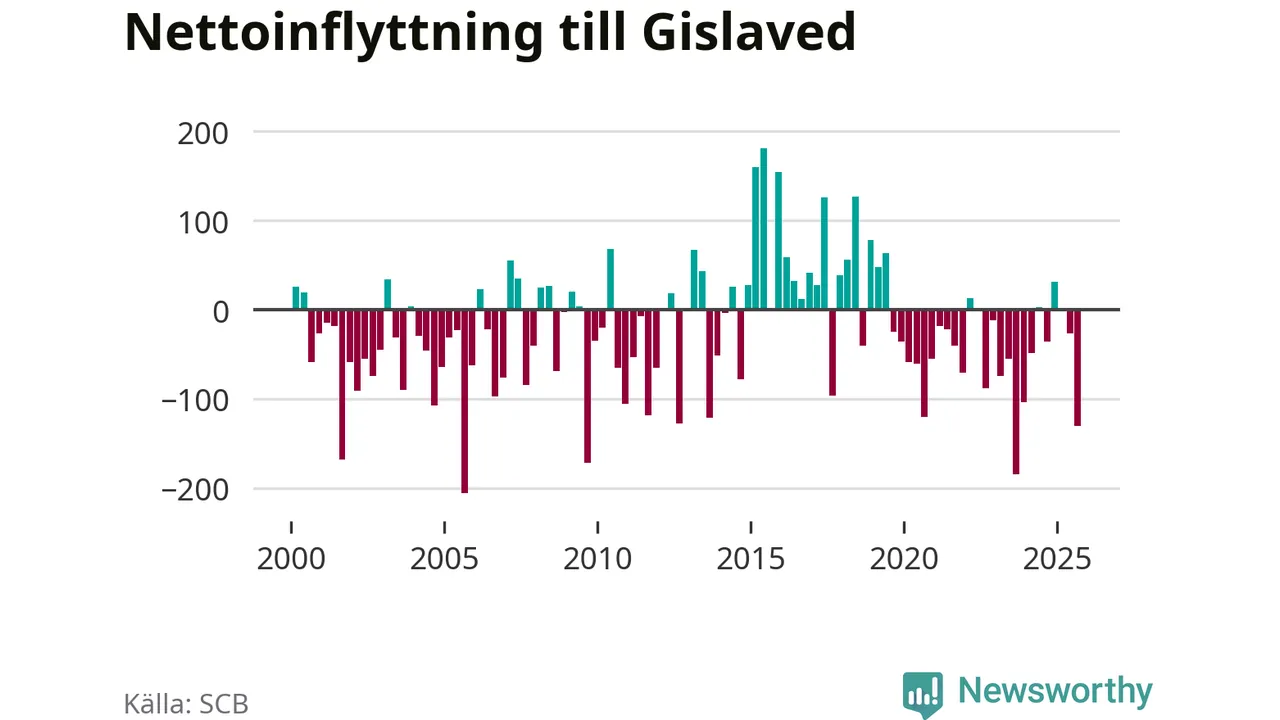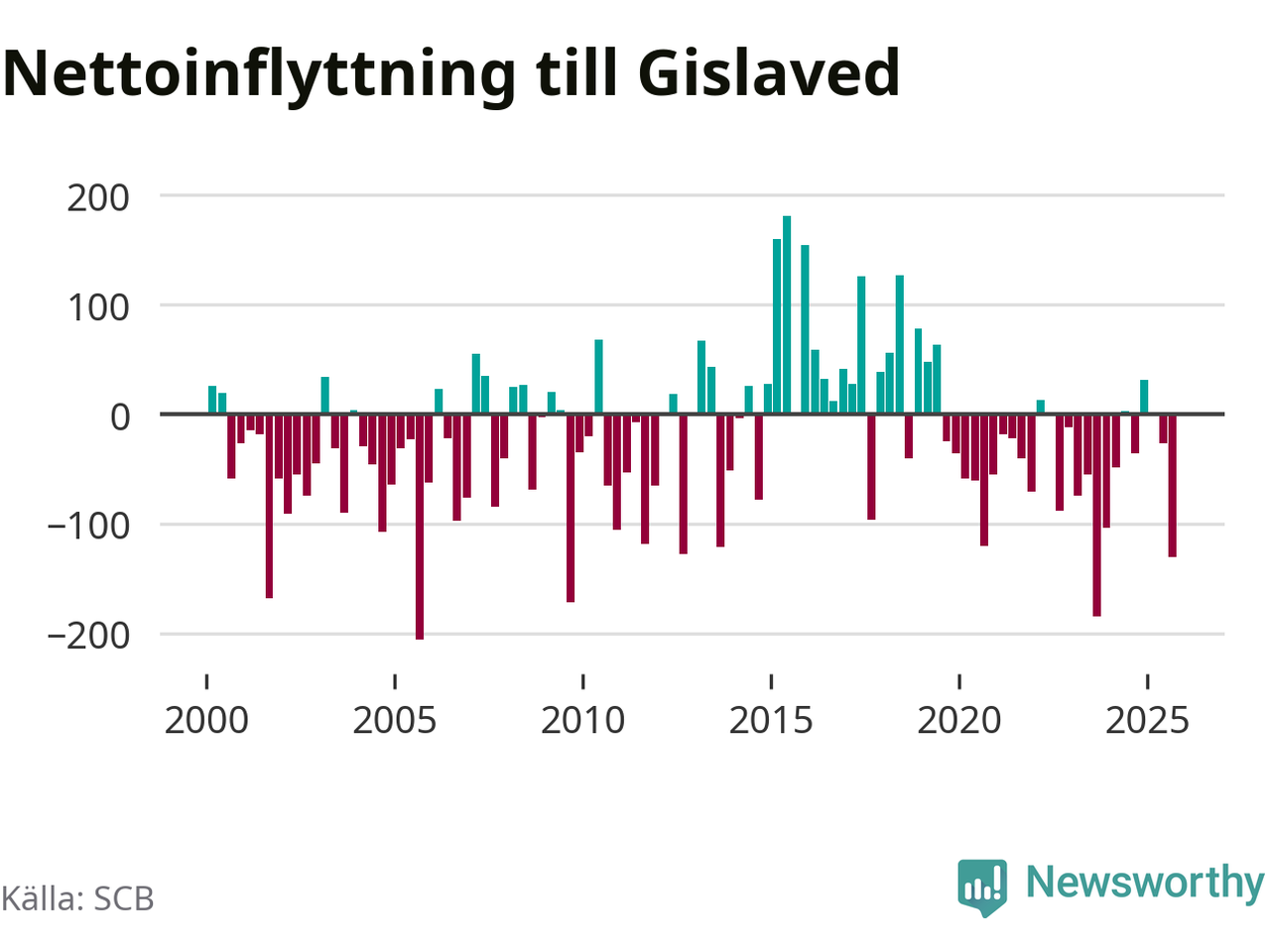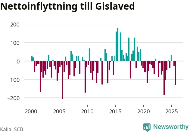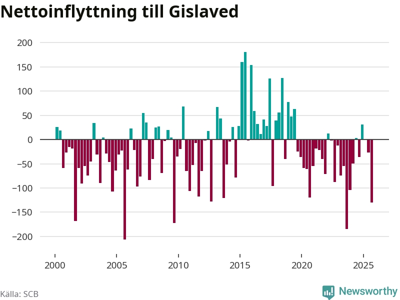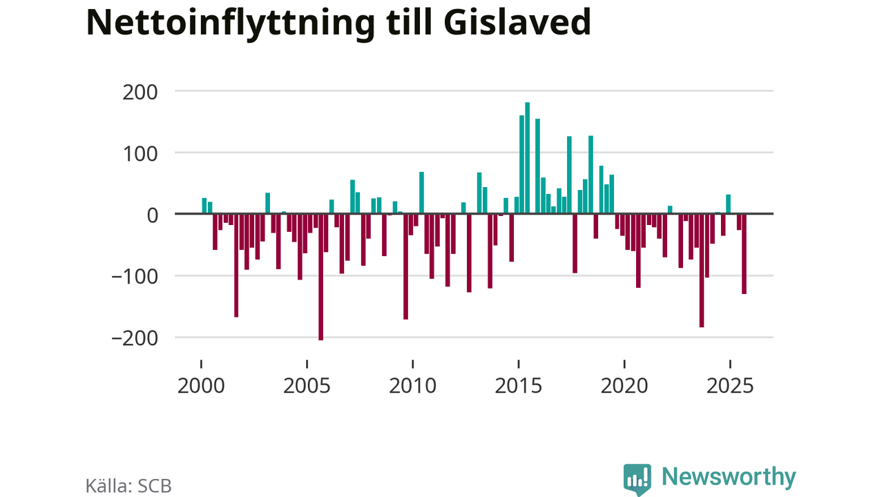 Under tredje kvartalet 2025 flyttade 297 personer till kommunen medan 427 personer flyttade därifrån. Sedan seklets början har Gislaved oftast haft ett negativt flyttnetto.