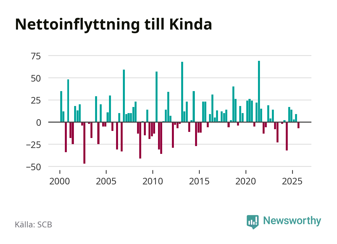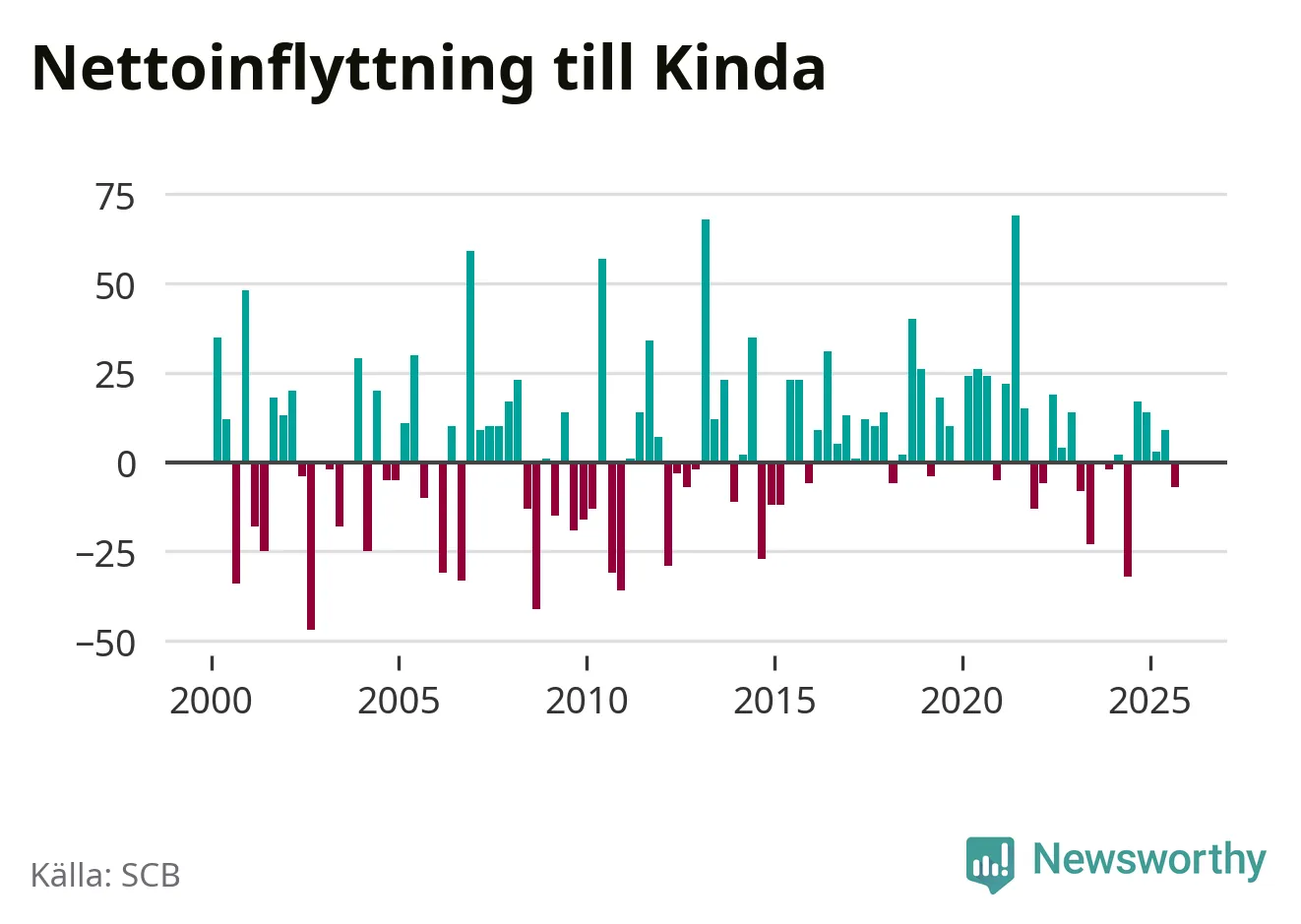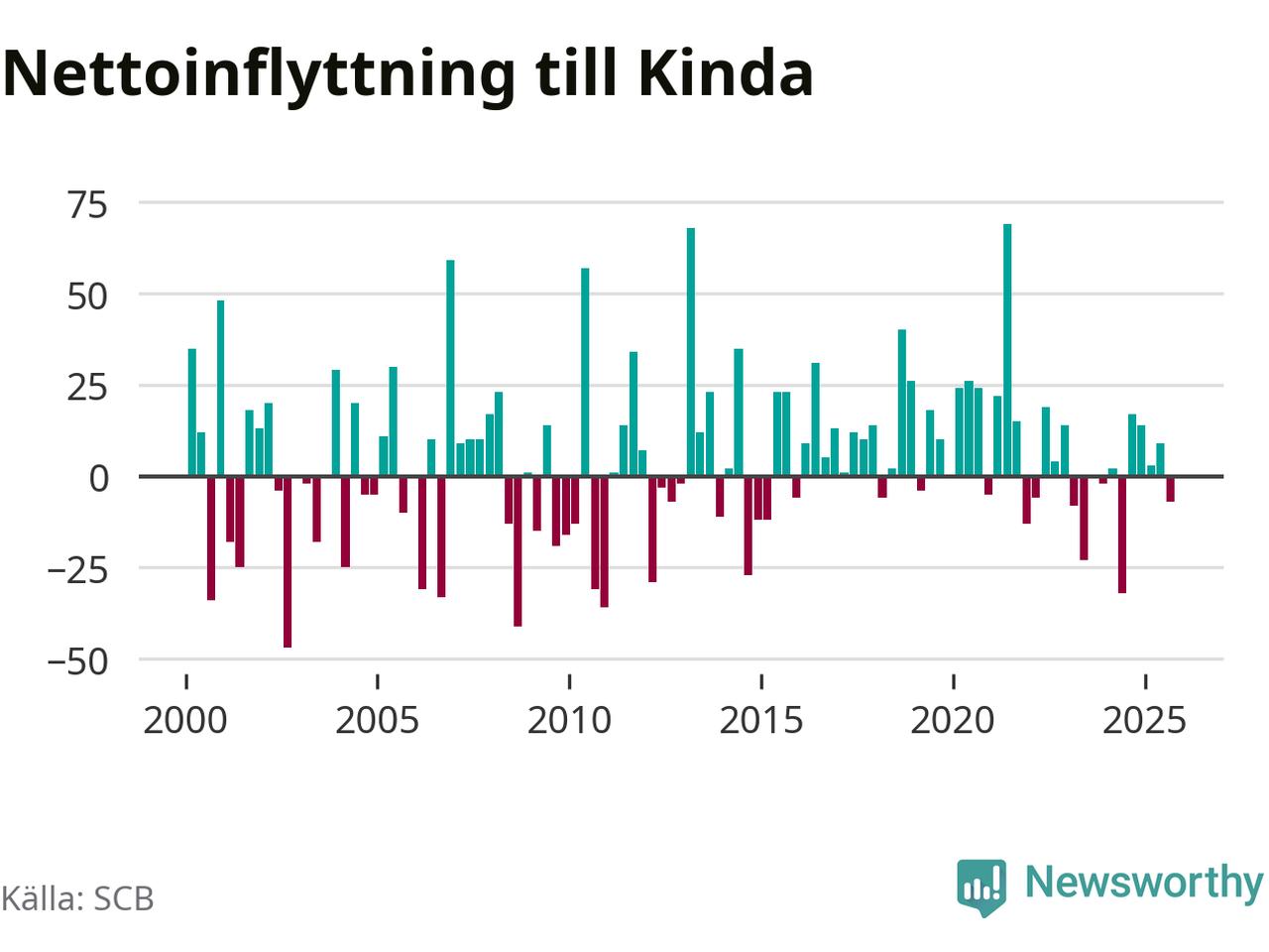 Under tredje kvartalet 2025 flyttade 136 personer till kommunen medan 143 personer flyttade därifrån. Skillnaden mellan antalet in- och utflyttade är så liten att den lika gärna kan bero på SCB:s slumpmässiga brus. Sedan seklets början har Kinda oftast haft ett positivt flyttnetto.