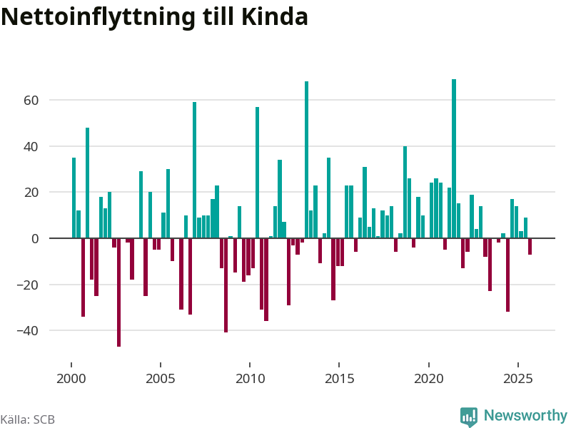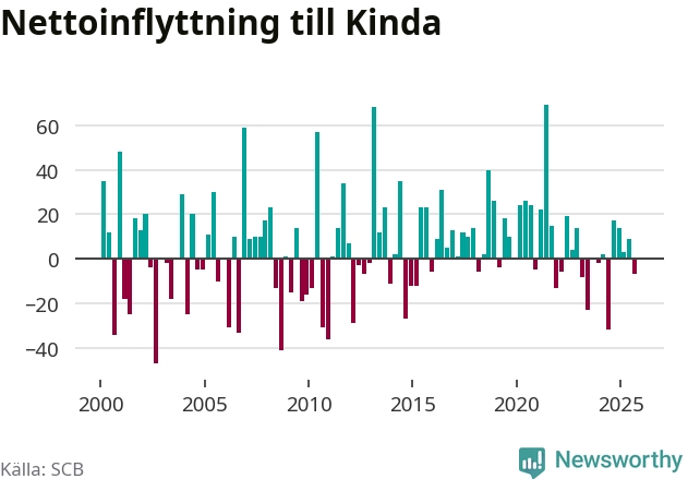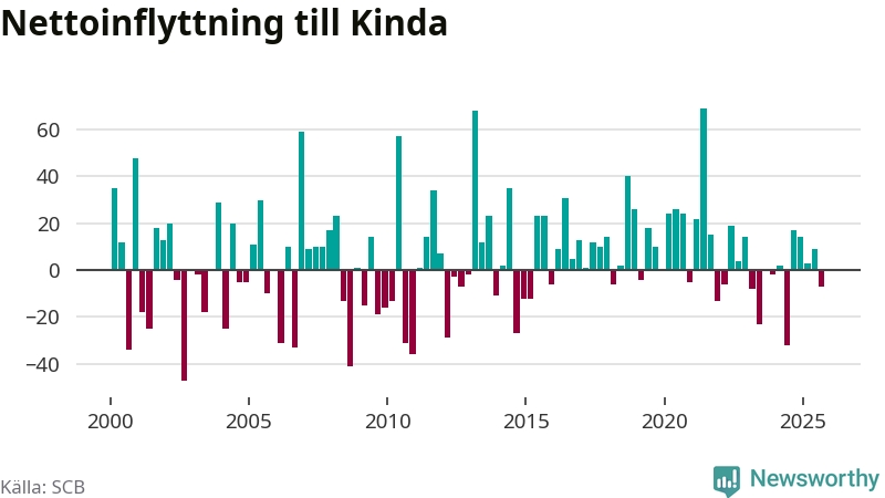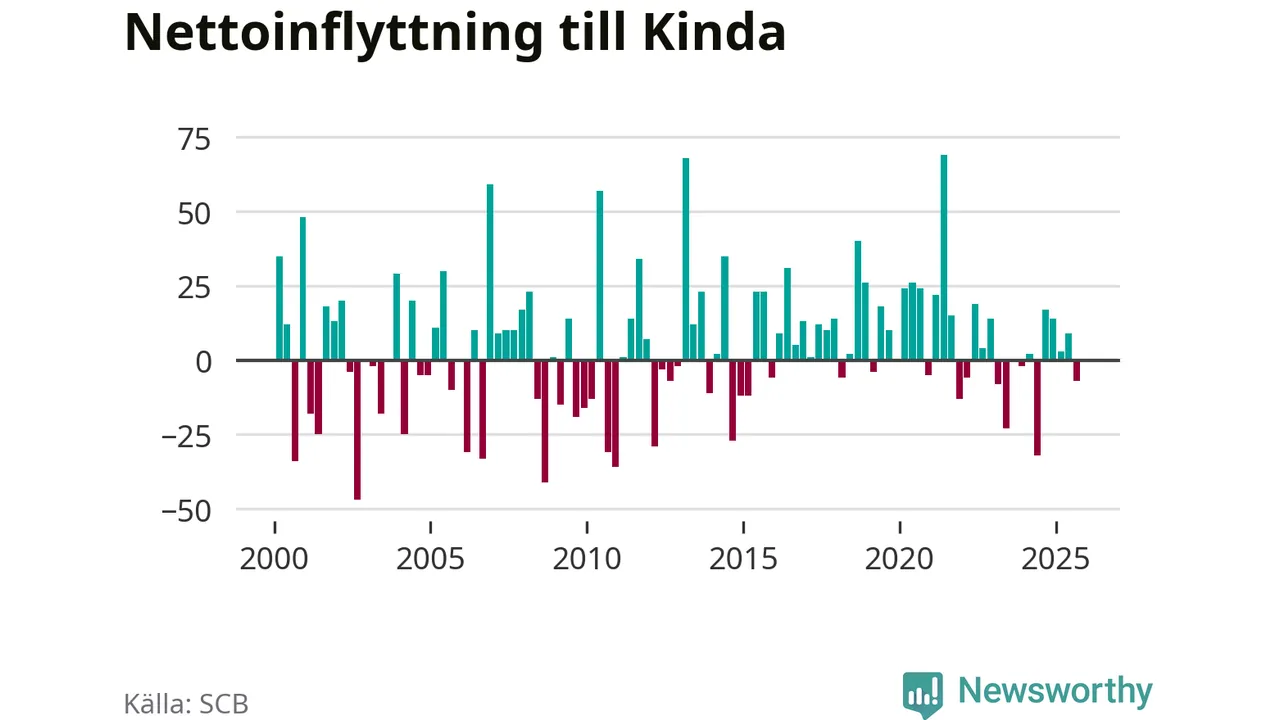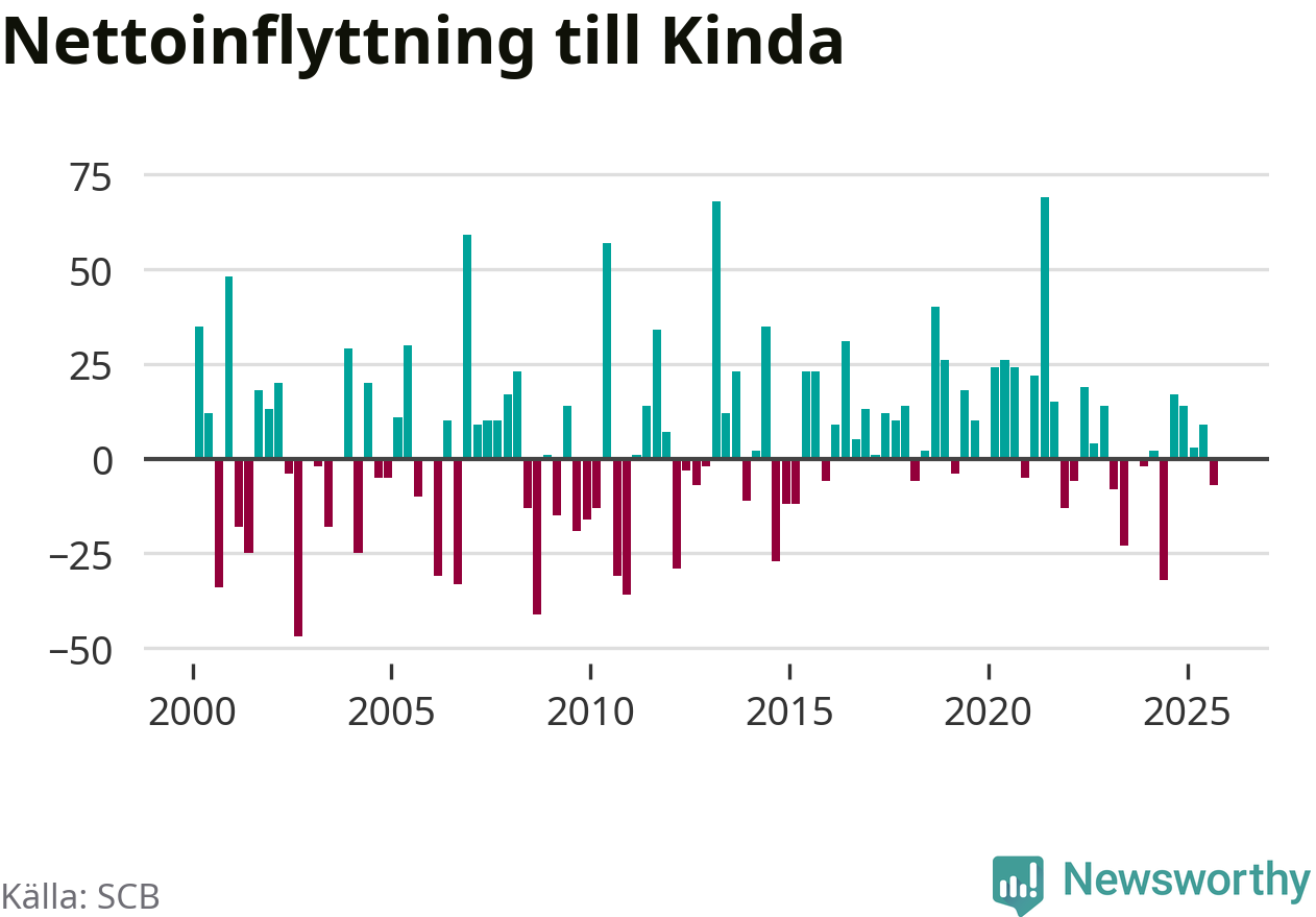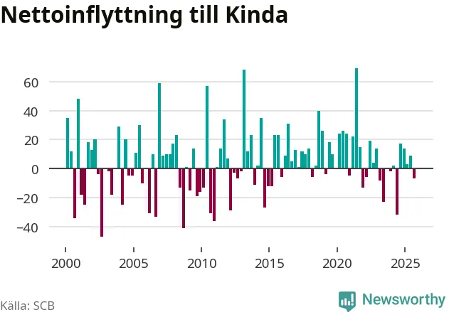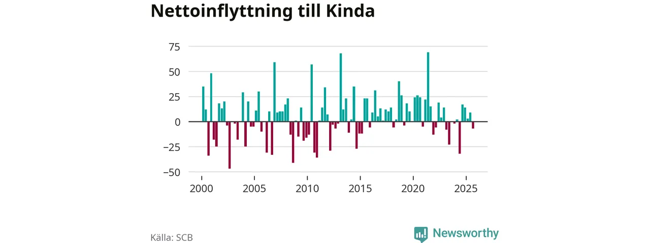 Under tredje kvartalet 2025 flyttade 136 personer till kommunen medan 143 personer flyttade därifrån. Skillnaden mellan antalet in- och utflyttade är så liten att den lika gärna kan bero på SCB:s slumpmässiga brus. Sedan seklets början har Kinda oftast haft ett positivt flyttnetto.