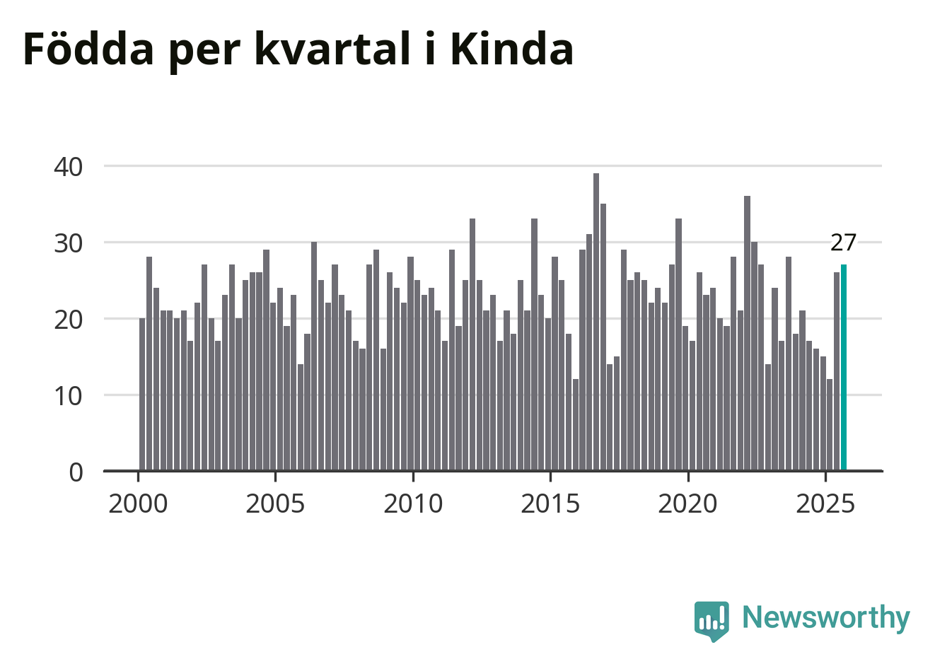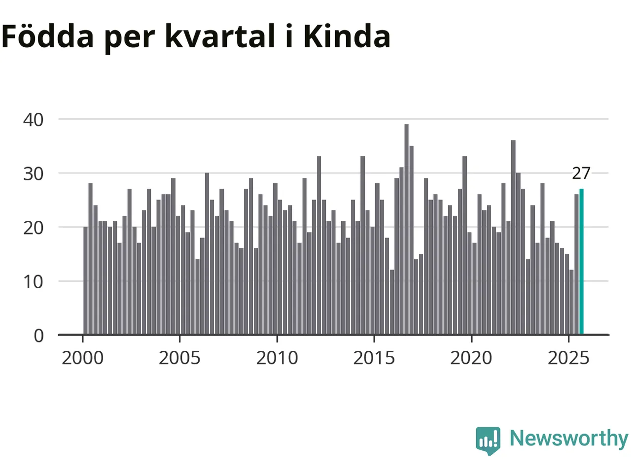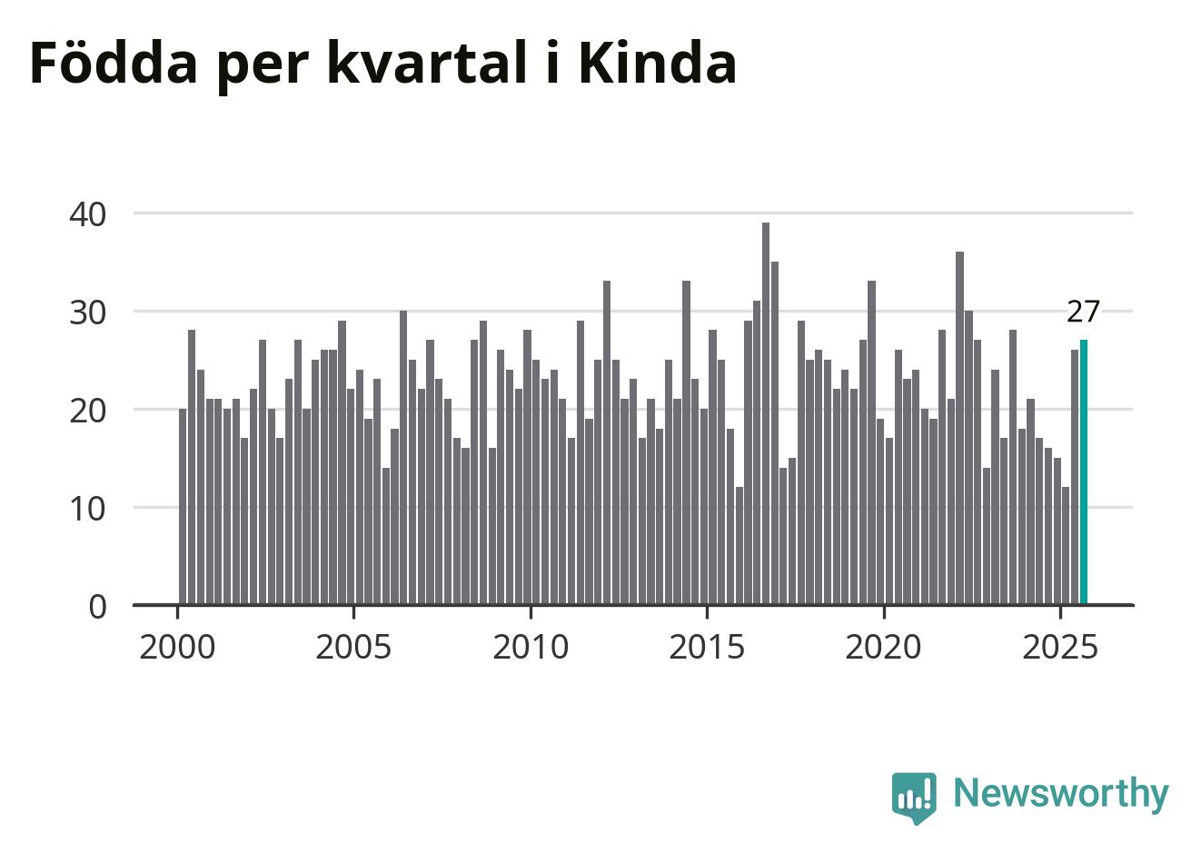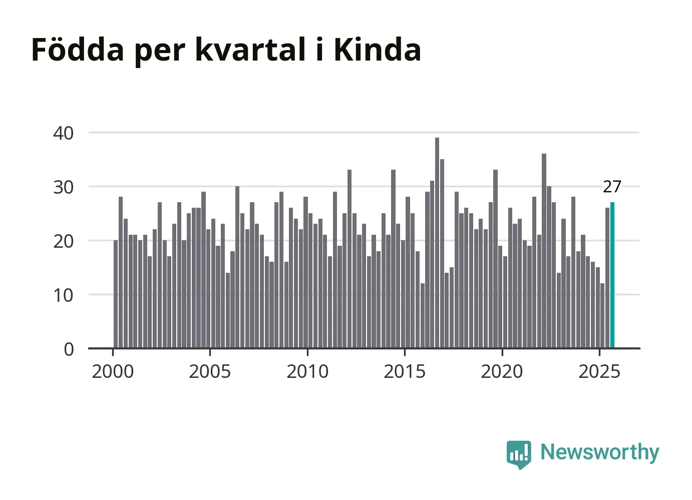 Enligt SCB:s siffror föddes 27 barn i Kinda under det senaste kvartalet. Samtidigt avled 33 personer. Skillnaden mellan antal födda och döda är så liten att det inte går att säga om det beror på något annat än SCB:s röjandeskydd. Kommunen har oftast haft negativt födelsenetto tidigare.