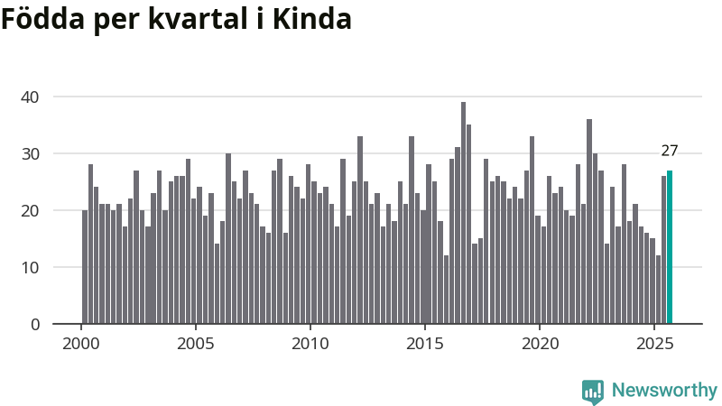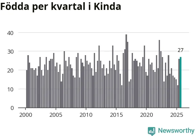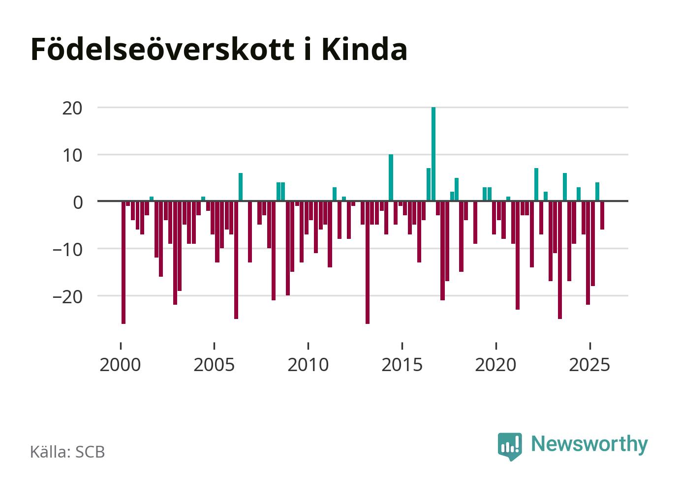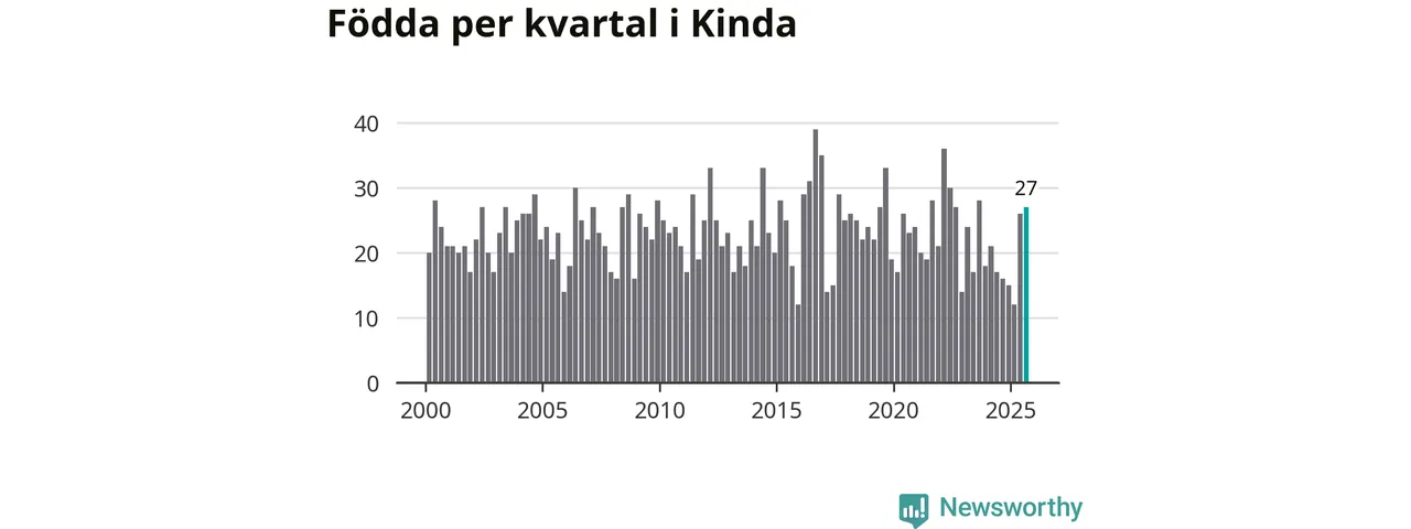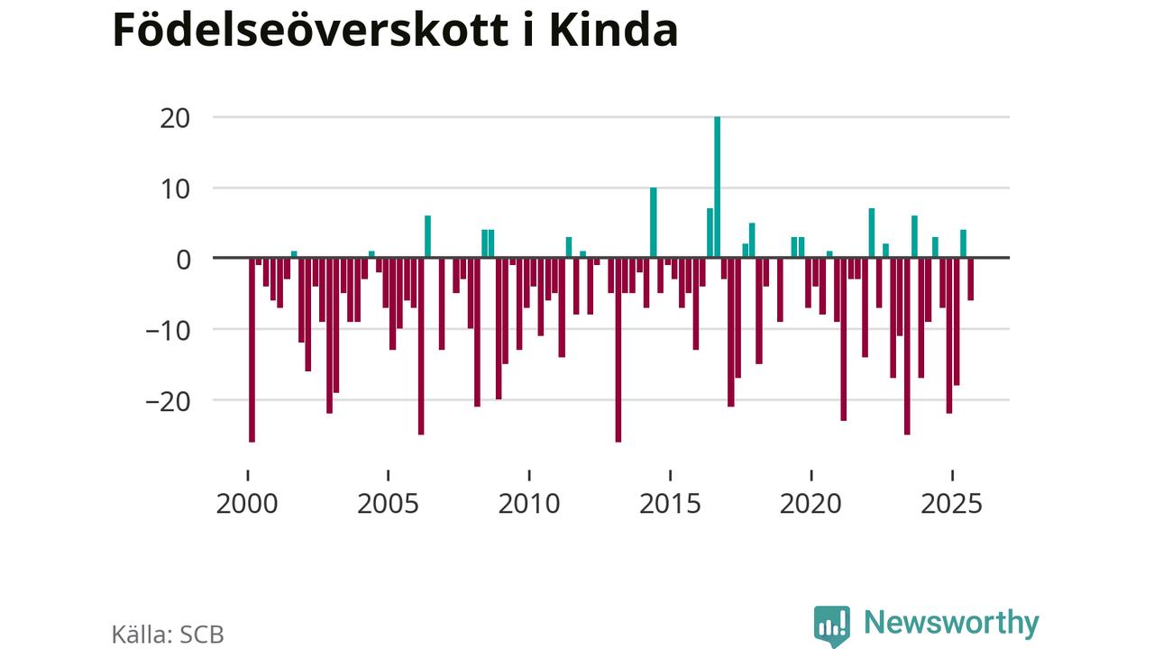 Enligt SCB:s siffror föddes 27 barn i Kinda under det senaste kvartalet. Samtidigt avled 33 personer. Skillnaden mellan antal födda och döda är så liten att det inte går att säga om det beror på något annat än SCB:s röjandeskydd. Kommunen har oftast haft negativt födelsenetto tidigare.