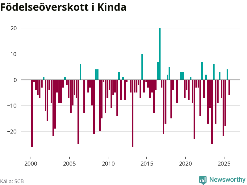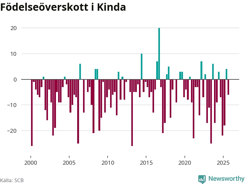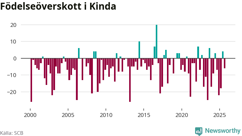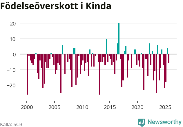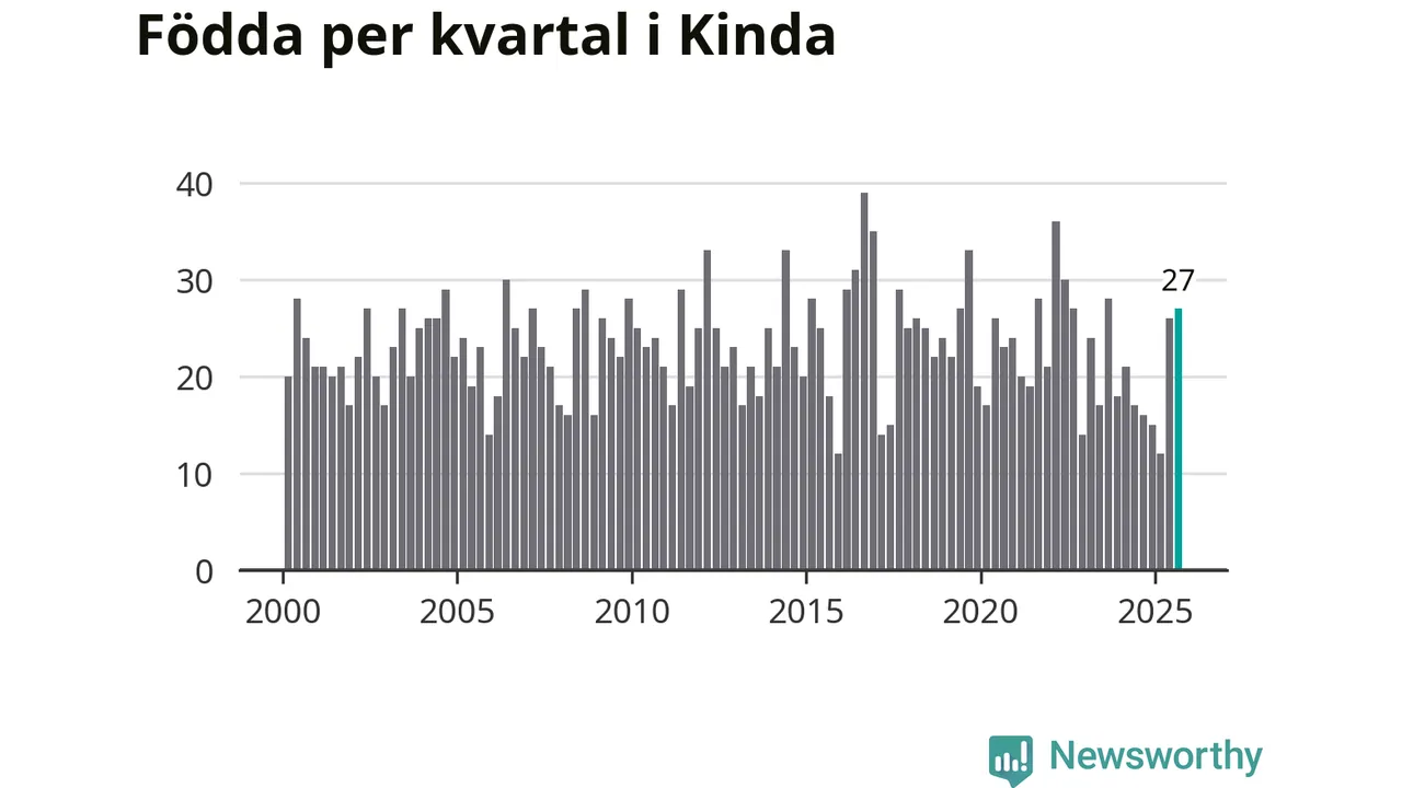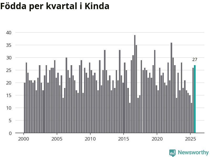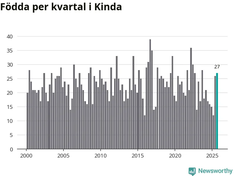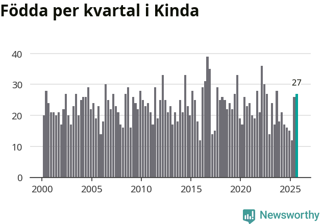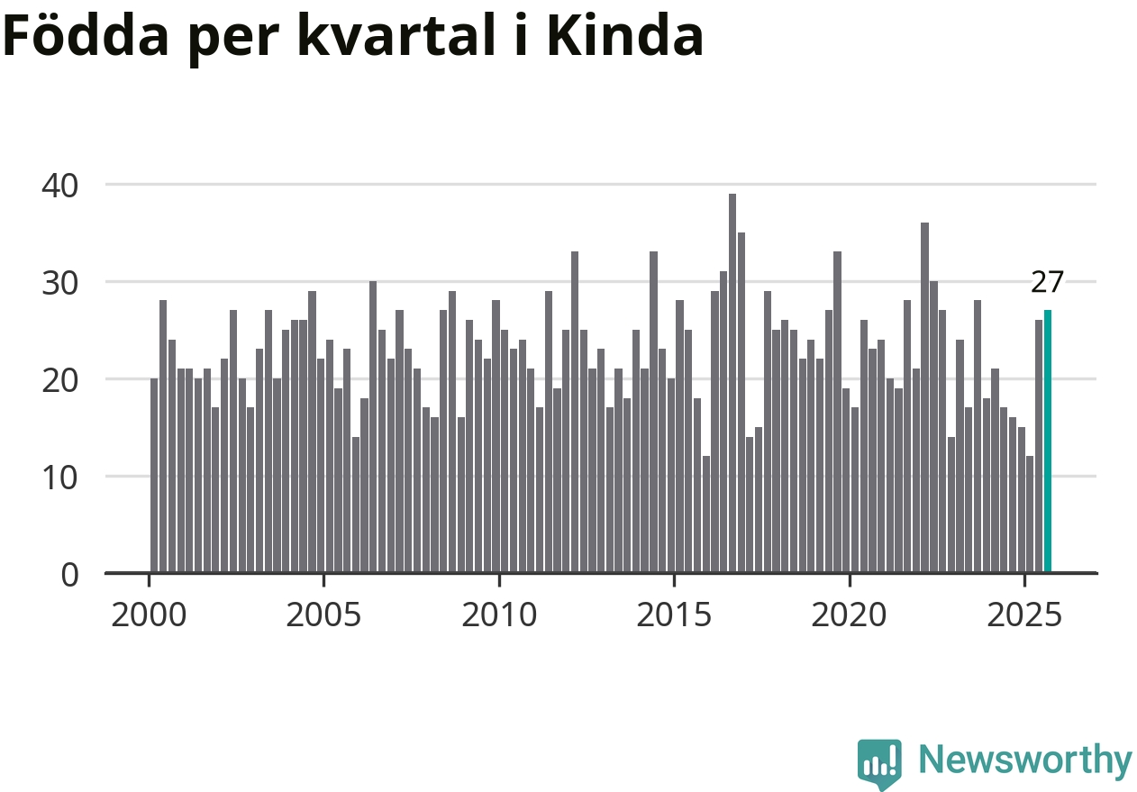 Enligt SCB:s siffror föddes 27 barn i Kinda under det senaste kvartalet. Samtidigt avled 33 personer. Skillnaden mellan antal födda och döda är så liten att det inte går att säga om det beror på något annat än SCB:s röjandeskydd. Kommunen har oftast haft negativt födelsenetto tidigare.