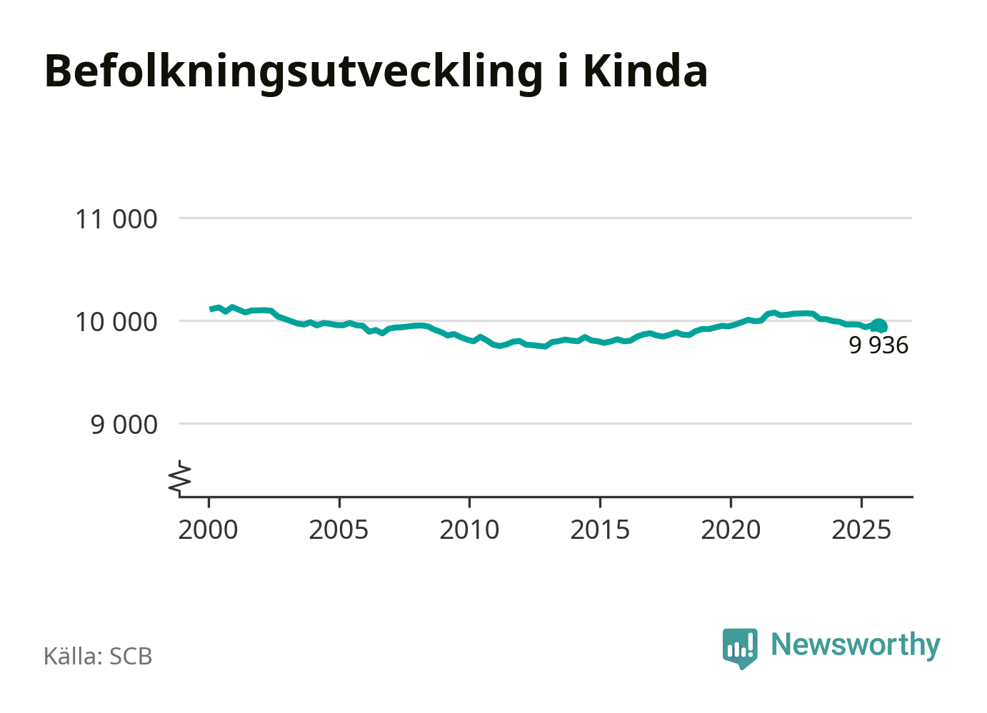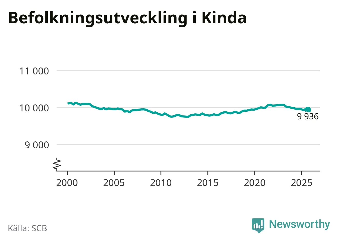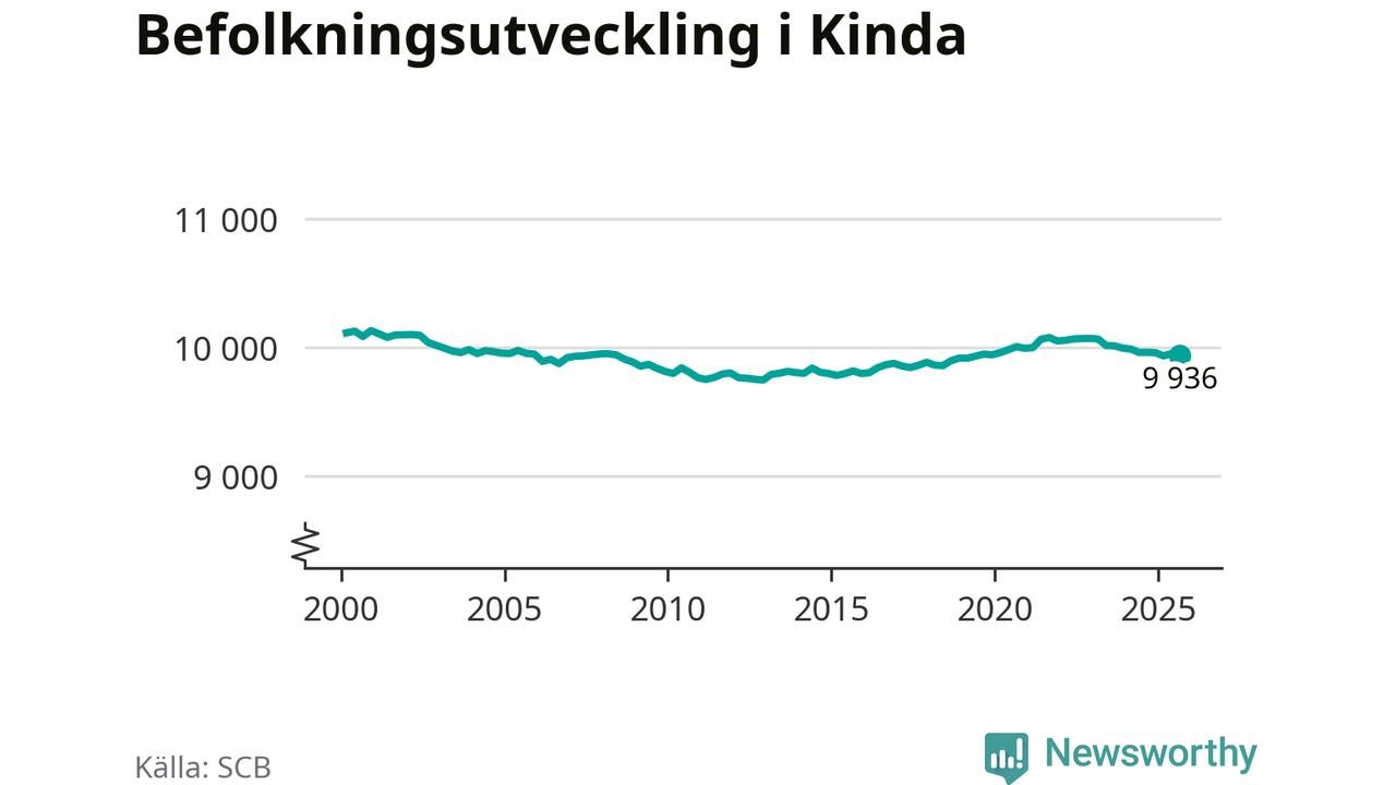 Befolkningen minskade i Kinda kommun under det tredje kvartalet 2025. Den 30 september bodde enligt SCB:s senaste siffror 9 936 personer i kommunen, vilket är 16 färre än i slutet av andra kvartalet.