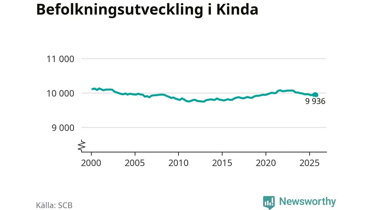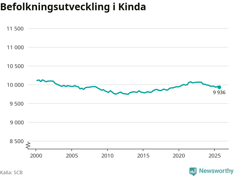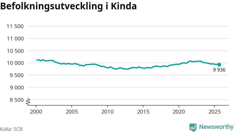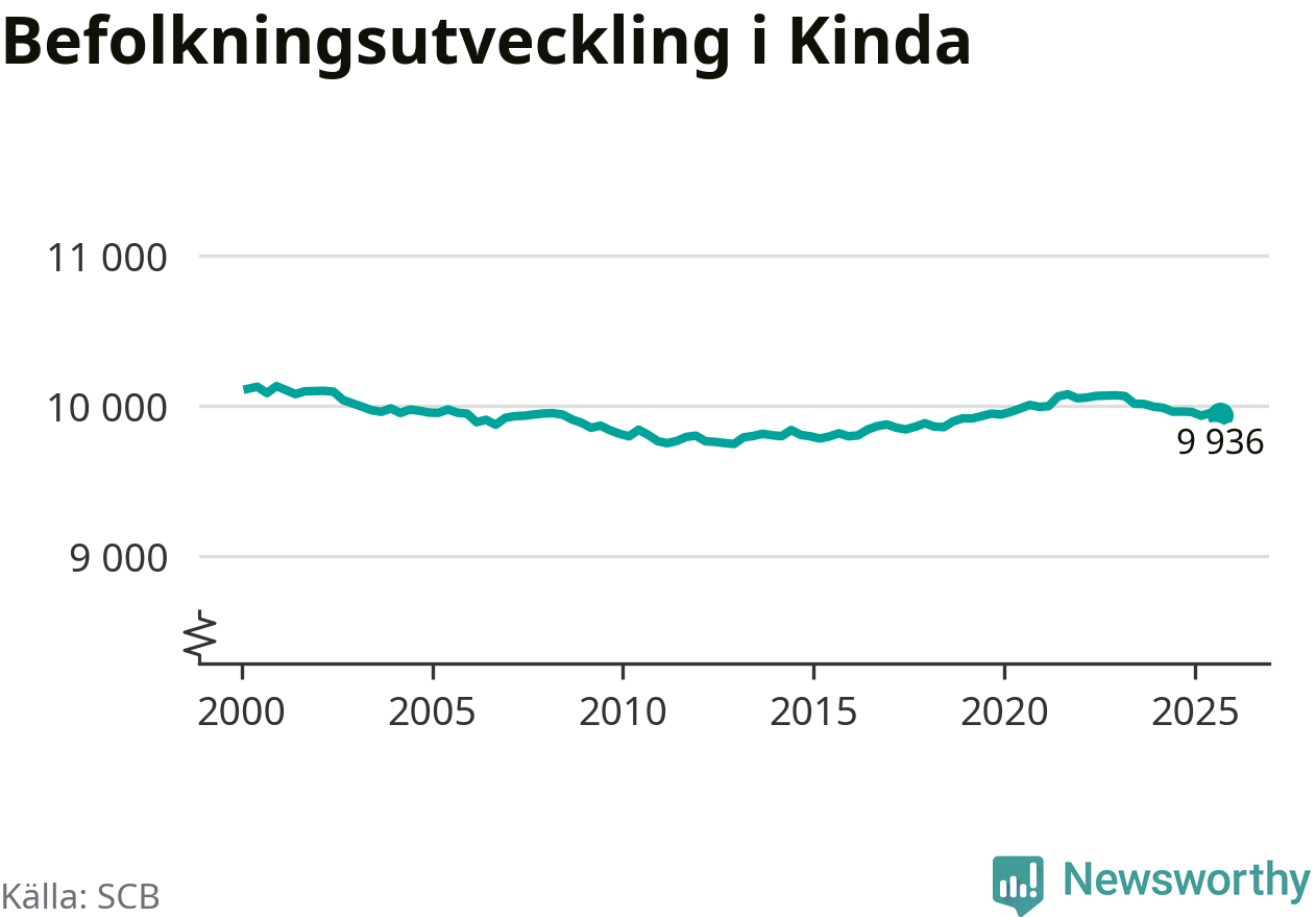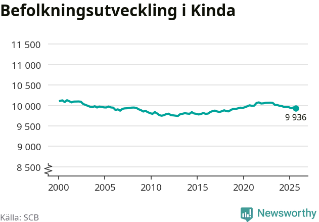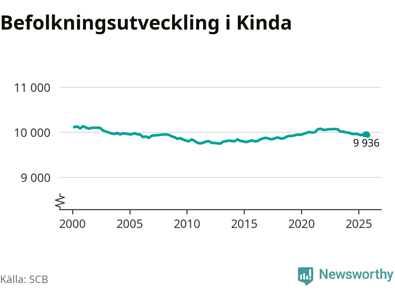 Befolkningen minskade i Kinda kommun under det tredje kvartalet 2025. Den 30 september bodde enligt SCB:s senaste siffror 9 936 personer i kommunen, vilket är 16 färre än i slutet av andra kvartalet.