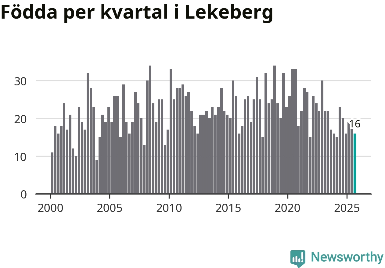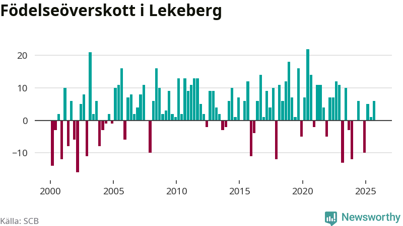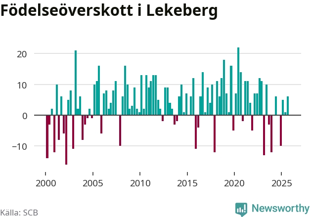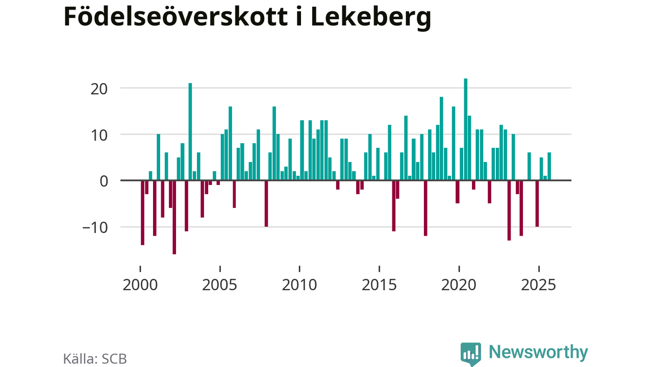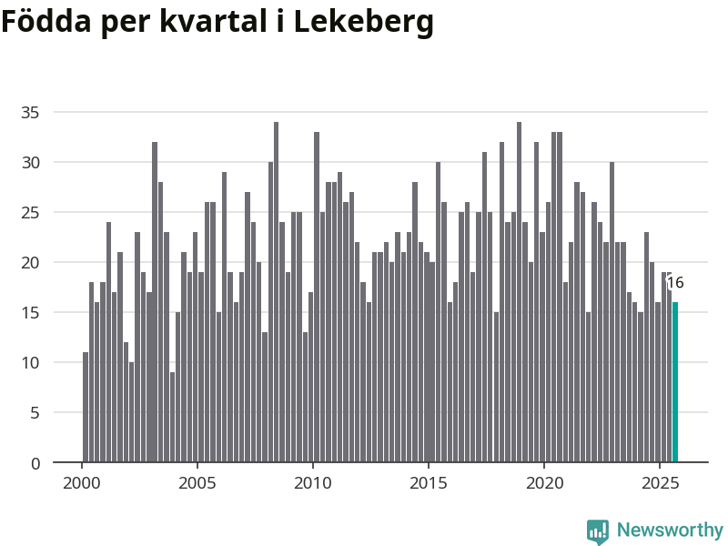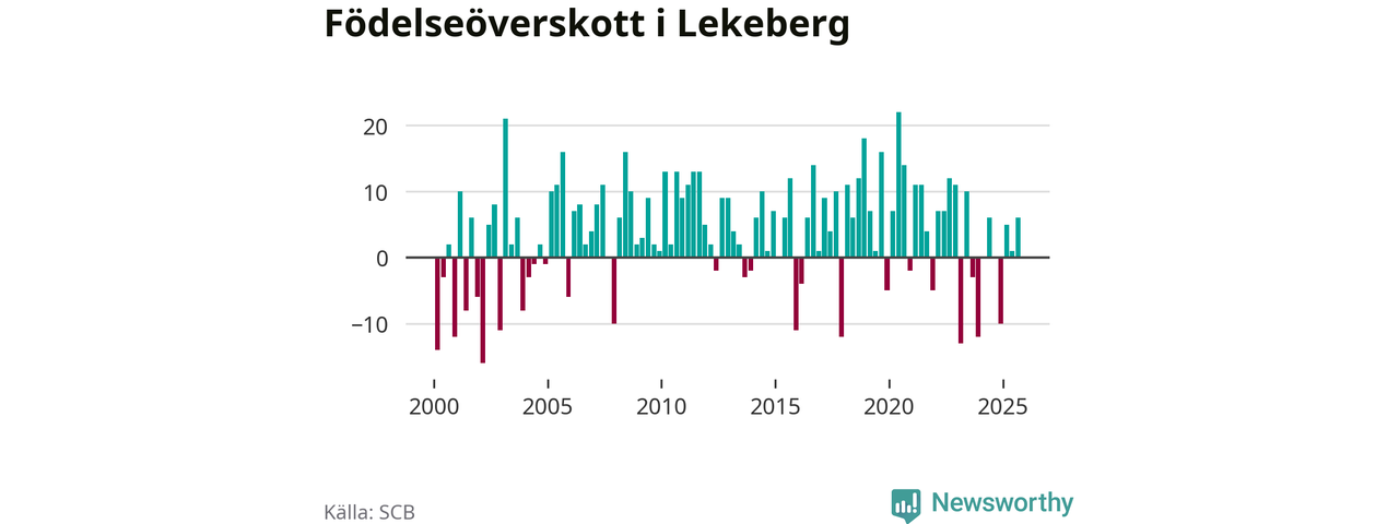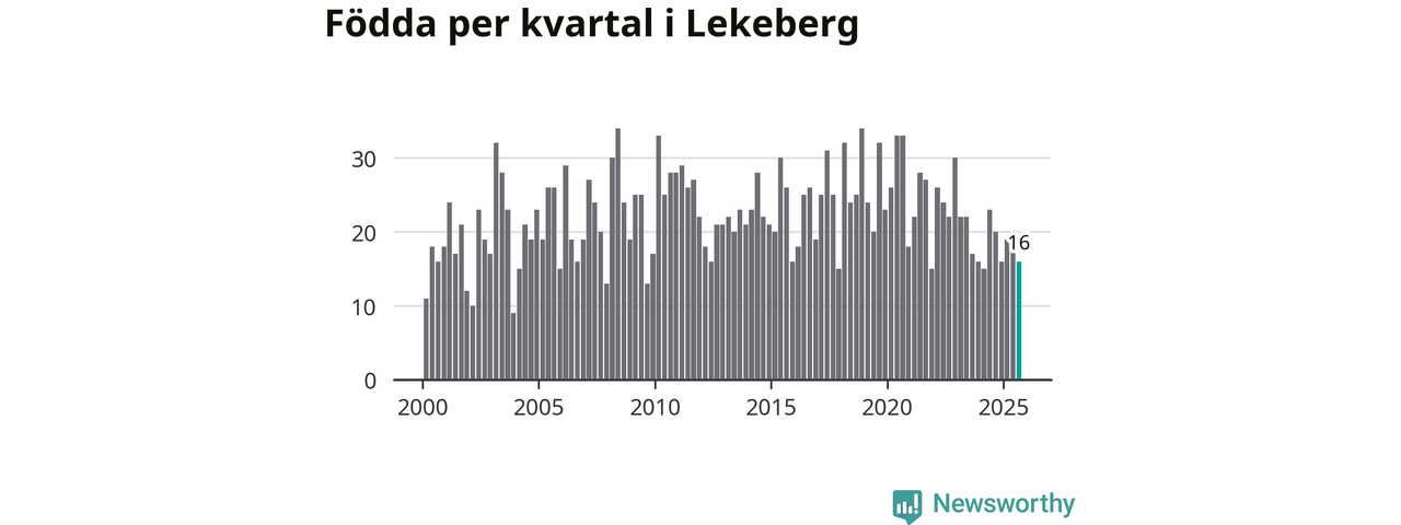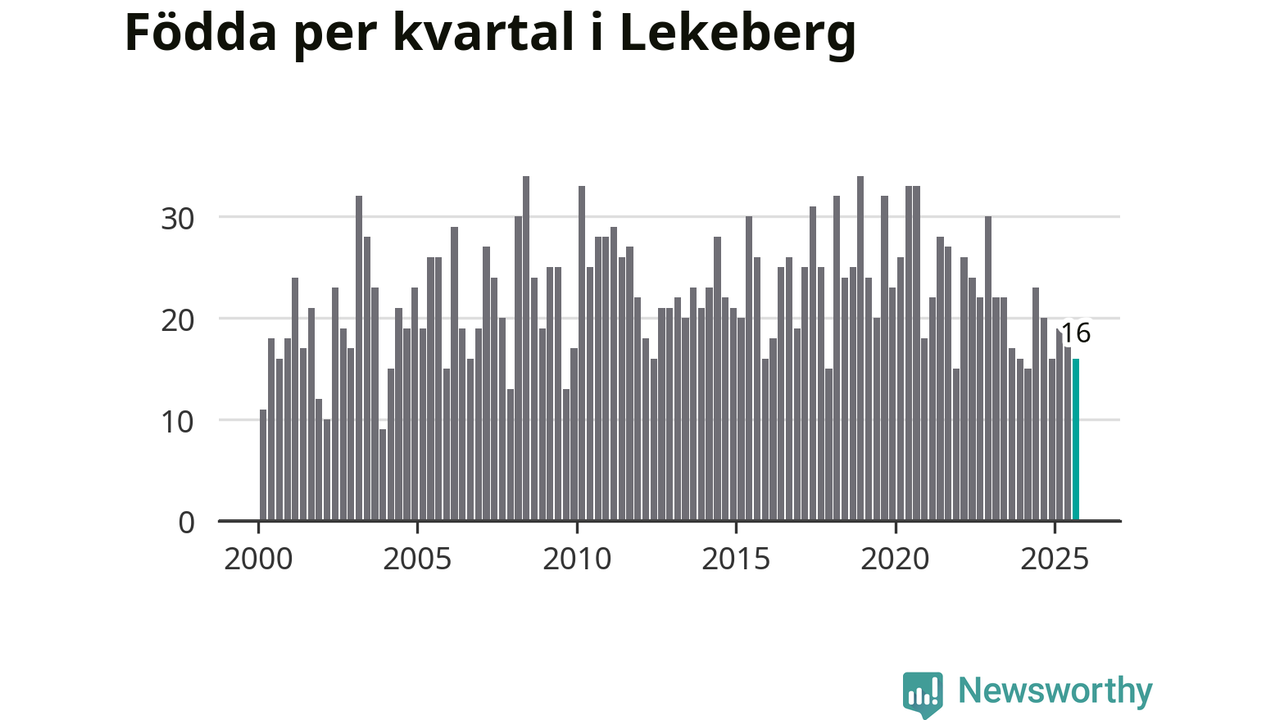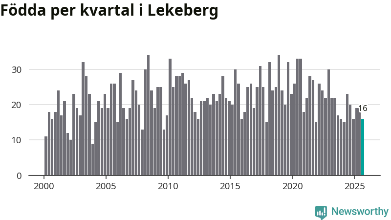Enligt SCB:s siffror föddes 16 barn i Lekeberg under det senaste kvartalet. Samtidigt avled relativt få – tio personer. Skillnaden mellan antal födda och döda är så liten att det inte går att säga om det beror på något annat än SCB:s röjandeskydd. Kommunen har oftast haft positivt födelsenetto tidigare.