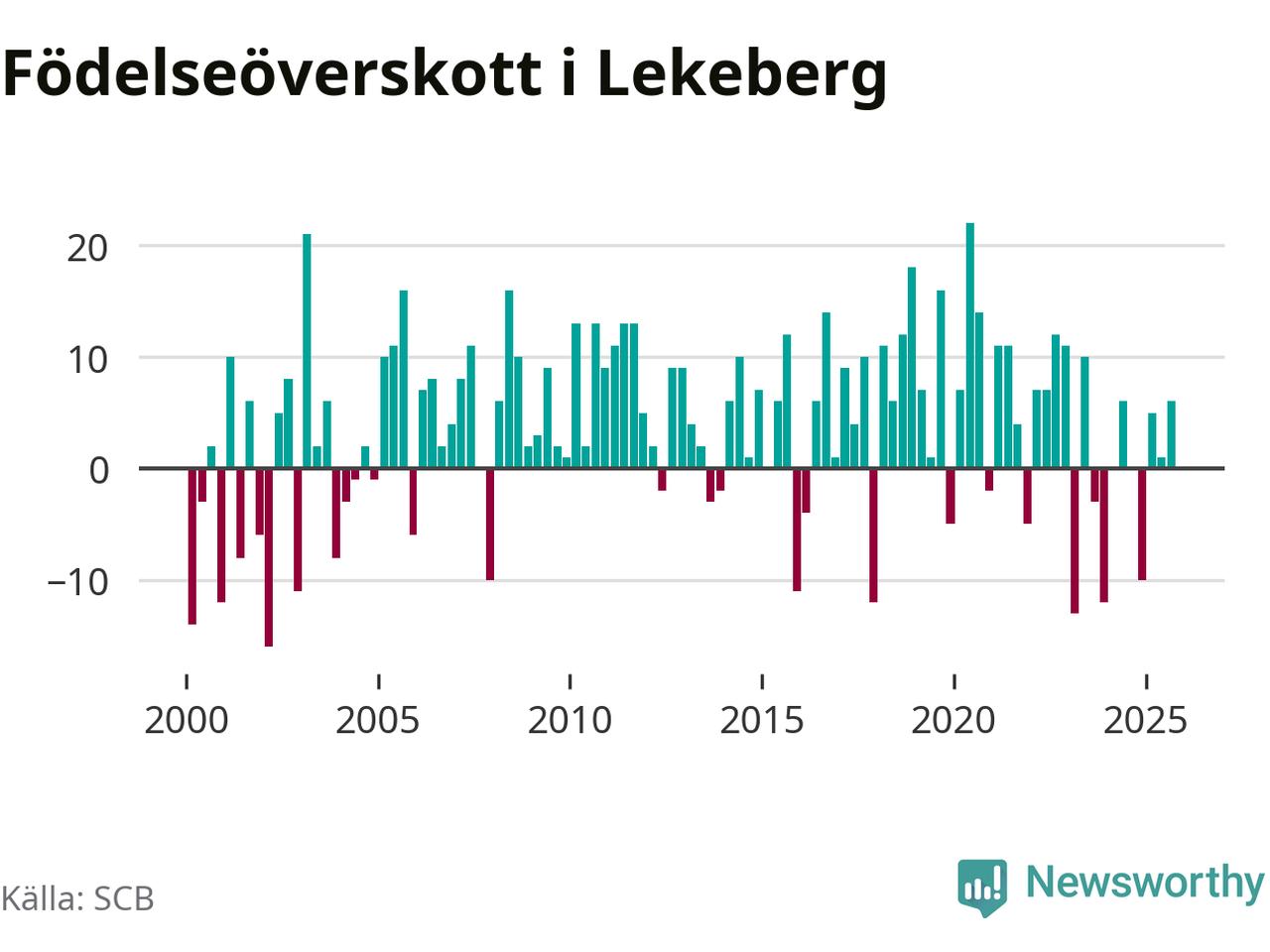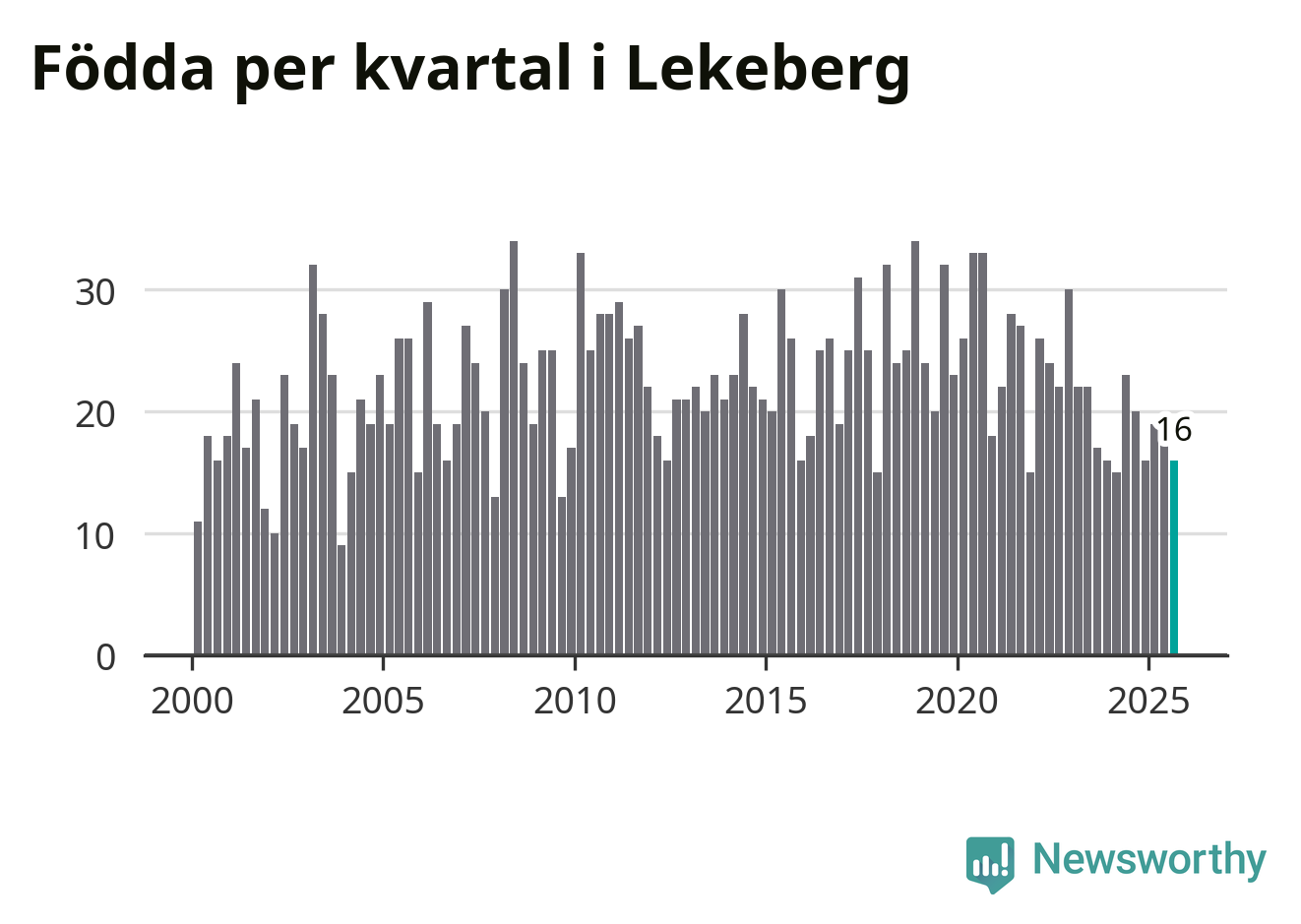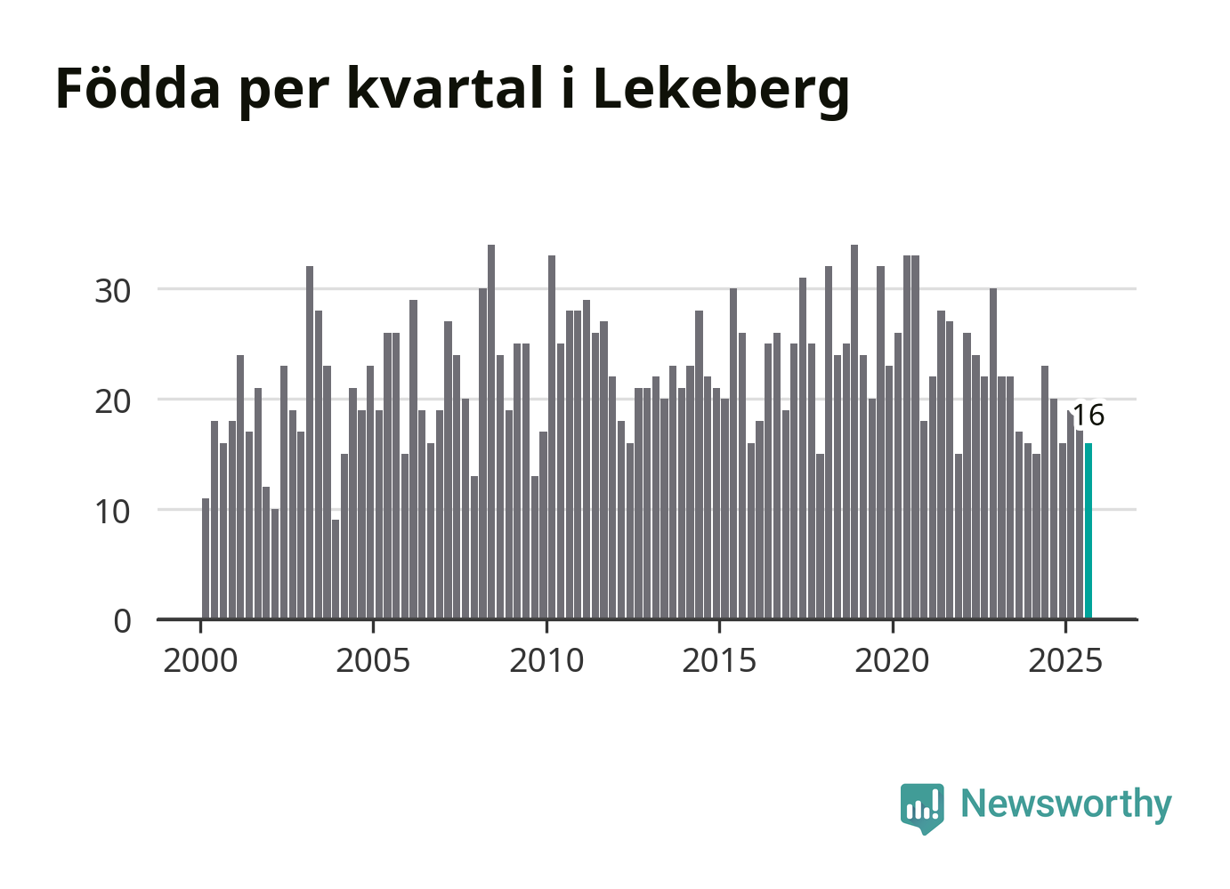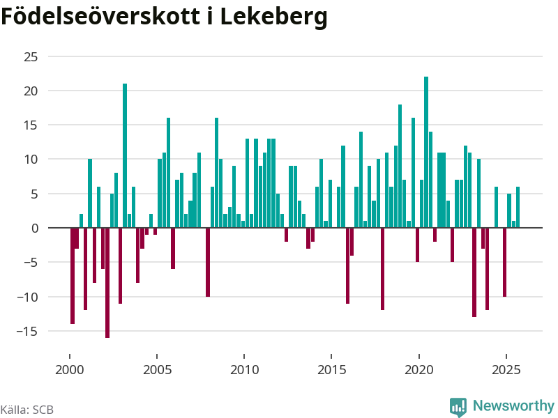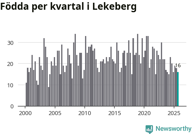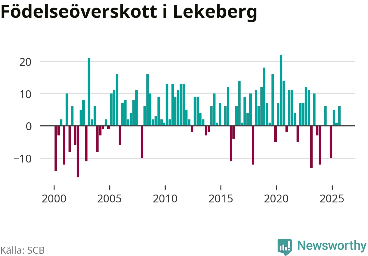 Enligt SCB:s siffror föddes 16 barn i Lekeberg under det senaste kvartalet. Samtidigt avled relativt få – tio personer. Skillnaden mellan antal födda och döda är så liten att det inte går att säga om det beror på något annat än SCB:s röjandeskydd. Kommunen har oftast haft positivt födelsenetto tidigare.