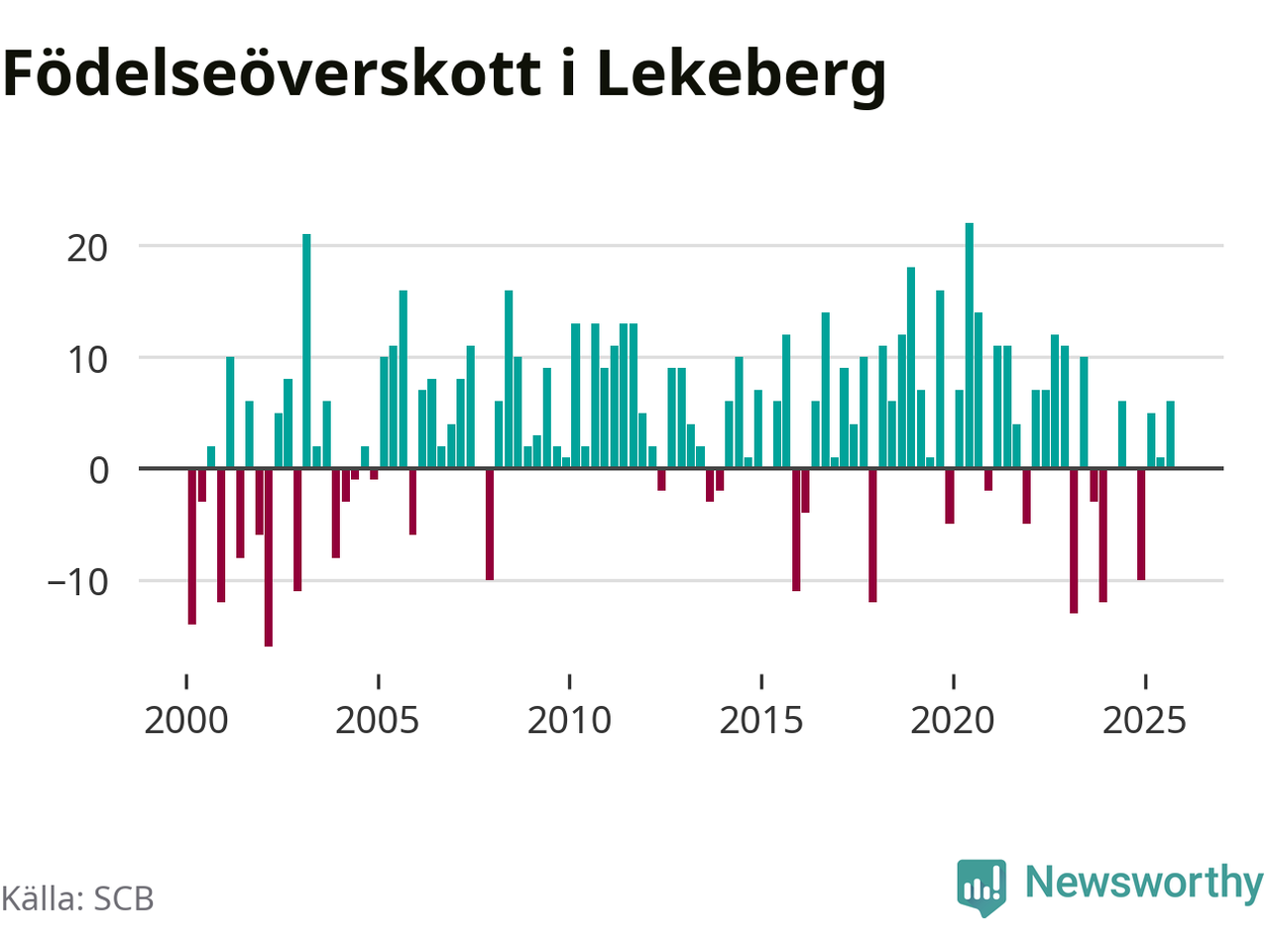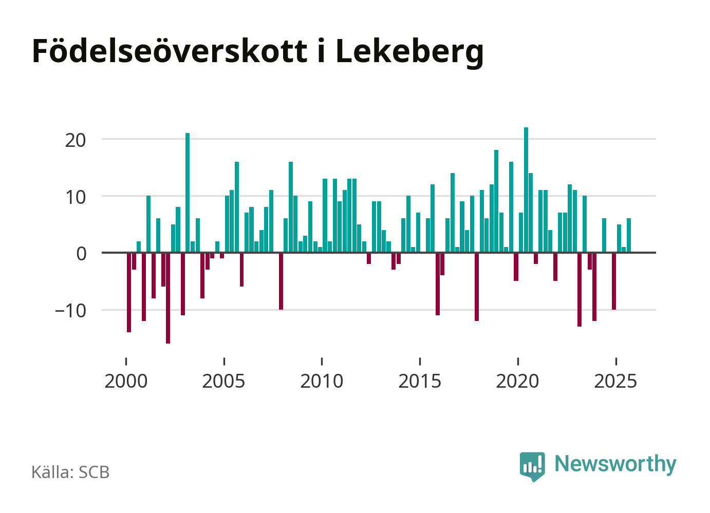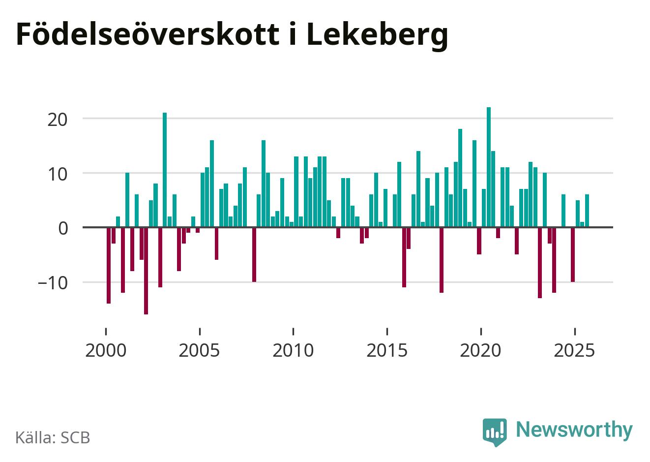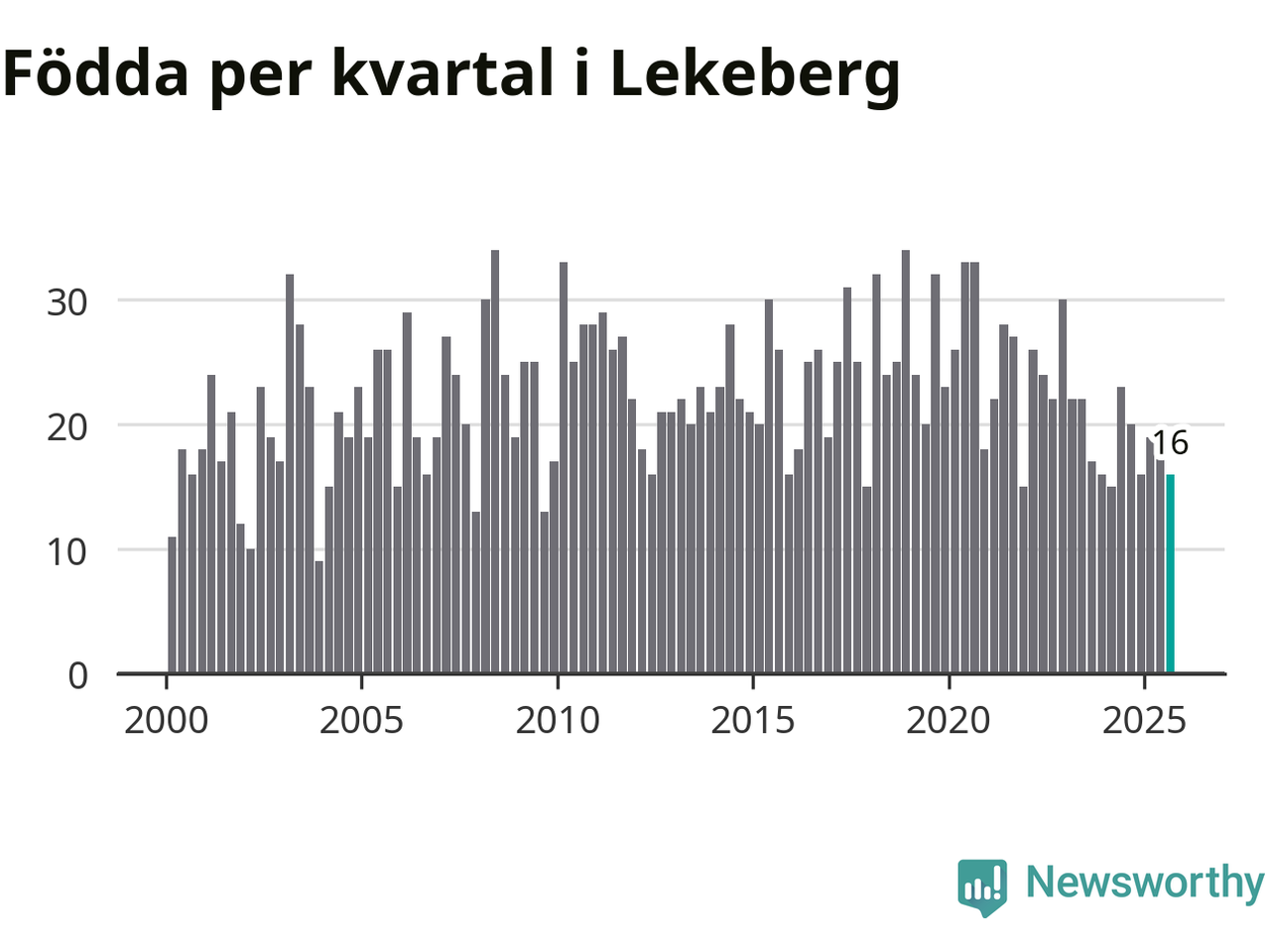 Enligt SCB:s siffror föddes 16 barn i Lekeberg under det senaste kvartalet. Samtidigt avled relativt få – tio personer. Skillnaden mellan antal födda och döda är så liten att det inte går att säga om det beror på något annat än SCB:s röjandeskydd. Kommunen har oftast haft positivt födelsenetto tidigare.