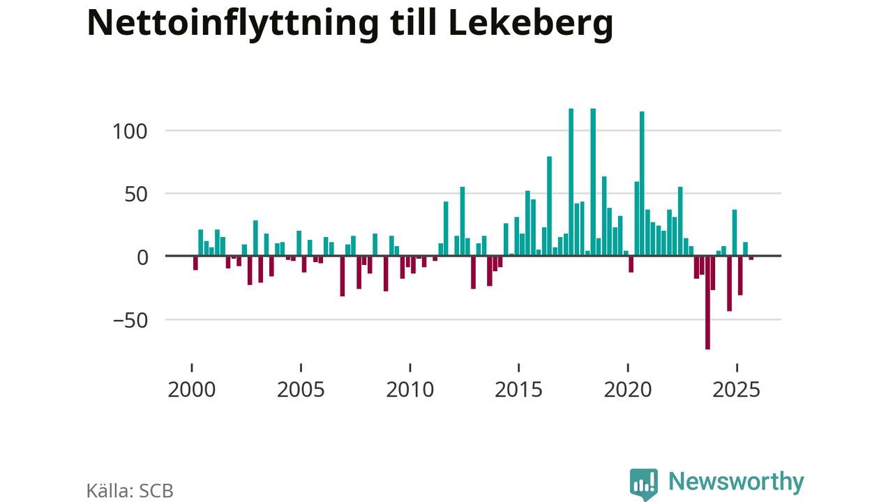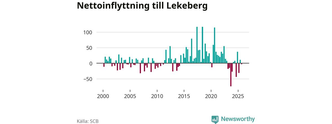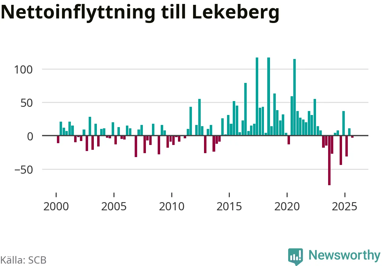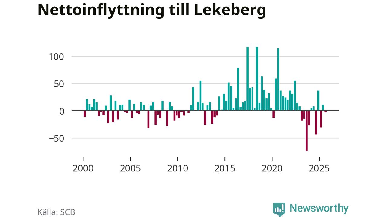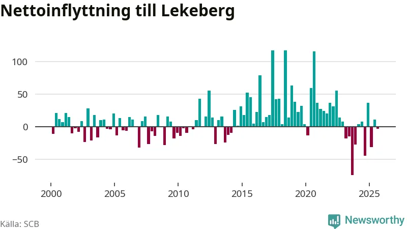 Under tredje kvartalet 2025 flyttade 123 personer till kommunen medan 126 personer flyttade därifrån. Skillnaden mellan antalet in- och utflyttade är så liten att den lika gärna kan bero på SCB:s slumpmässiga brus. Sedan seklets början har Lekeberg haft ett positivt flyttnetto under nästan alla kvartal.