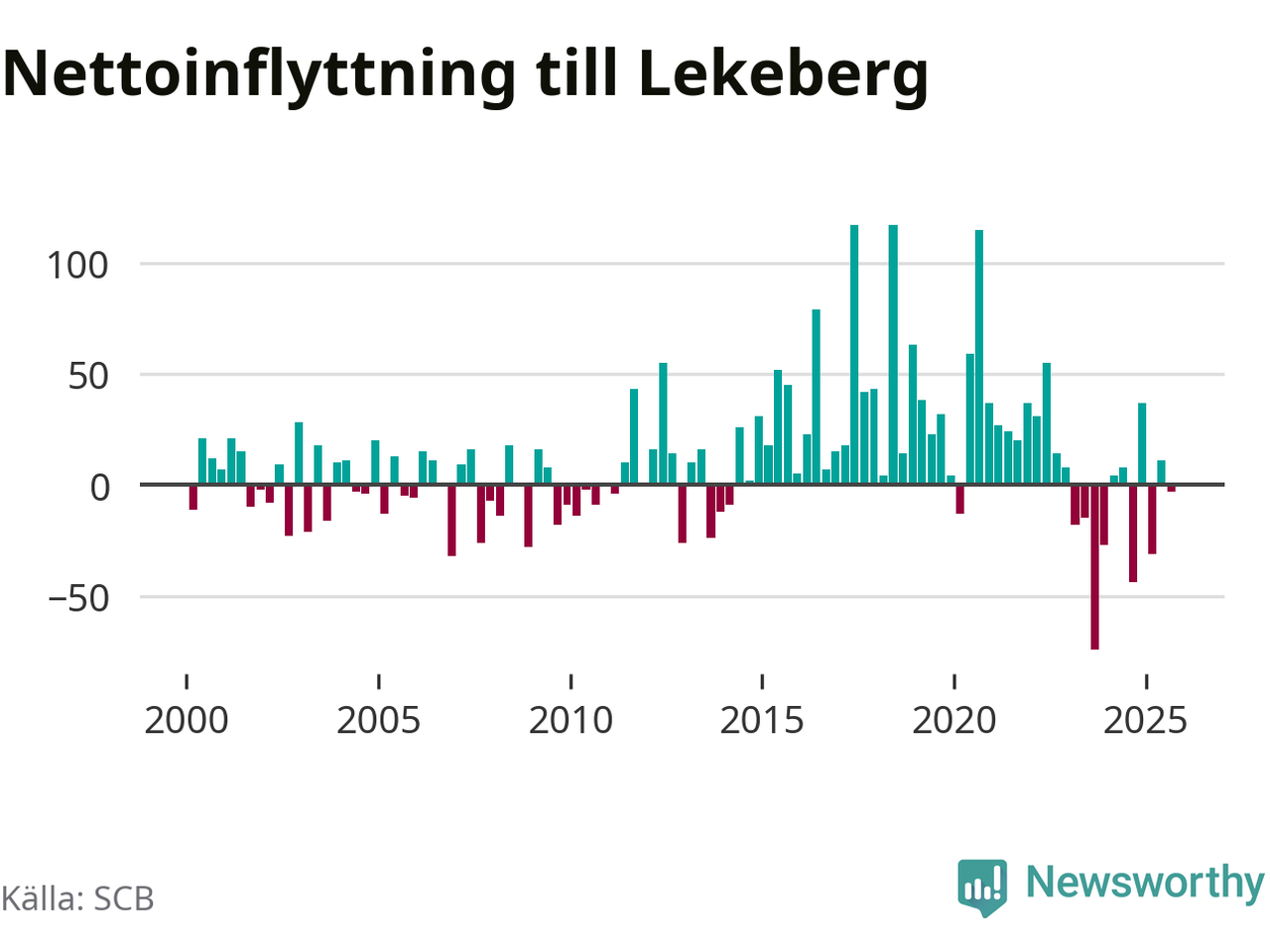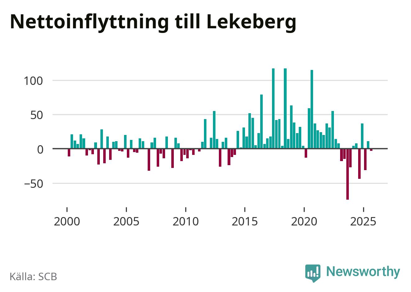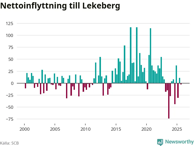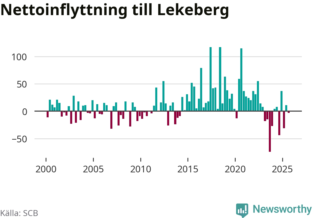 Under tredje kvartalet 2025 flyttade 123 personer till kommunen medan 126 personer flyttade därifrån. Skillnaden mellan antalet in- och utflyttade är så liten att den lika gärna kan bero på SCB:s slumpmässiga brus. Sedan seklets början har Lekeberg haft ett positivt flyttnetto under nästan alla kvartal.