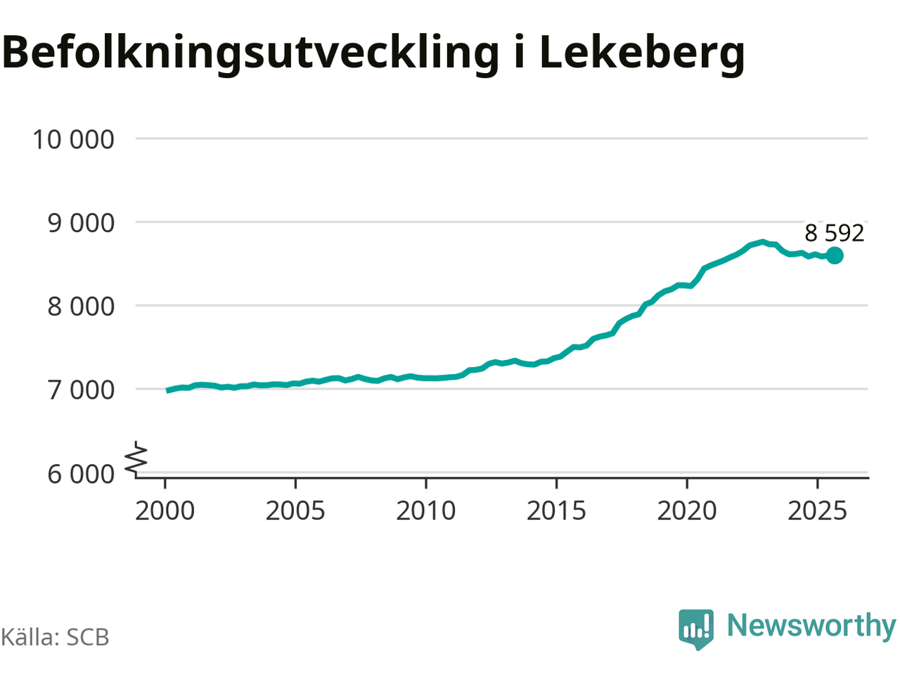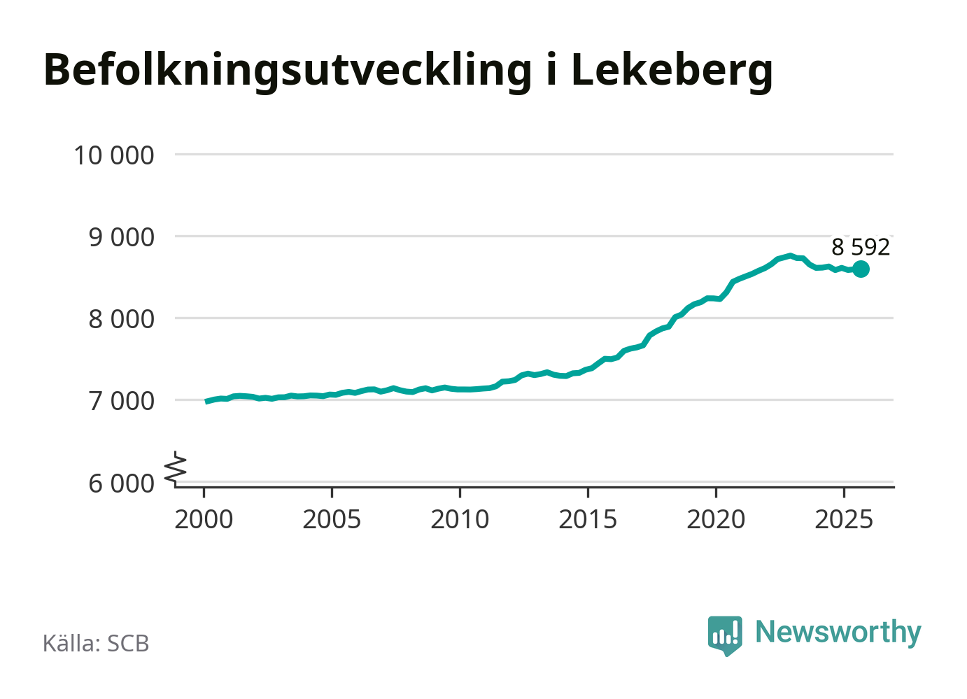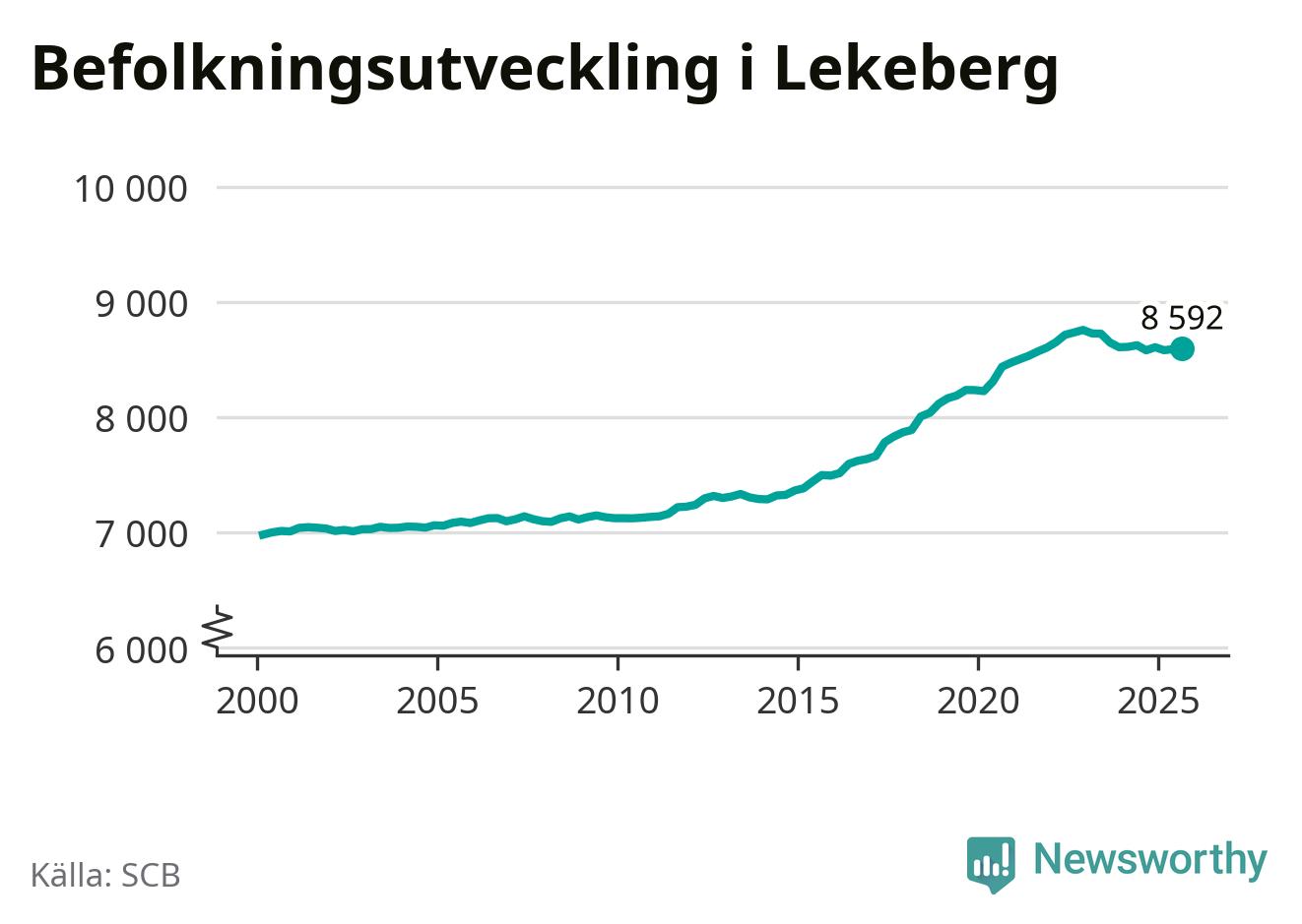 I slutet av tredje kvartalet 2025 bodde 8 592 personer i Lekebergs kommun, enligt SCB:s senaste siffror.