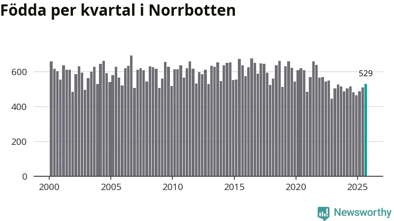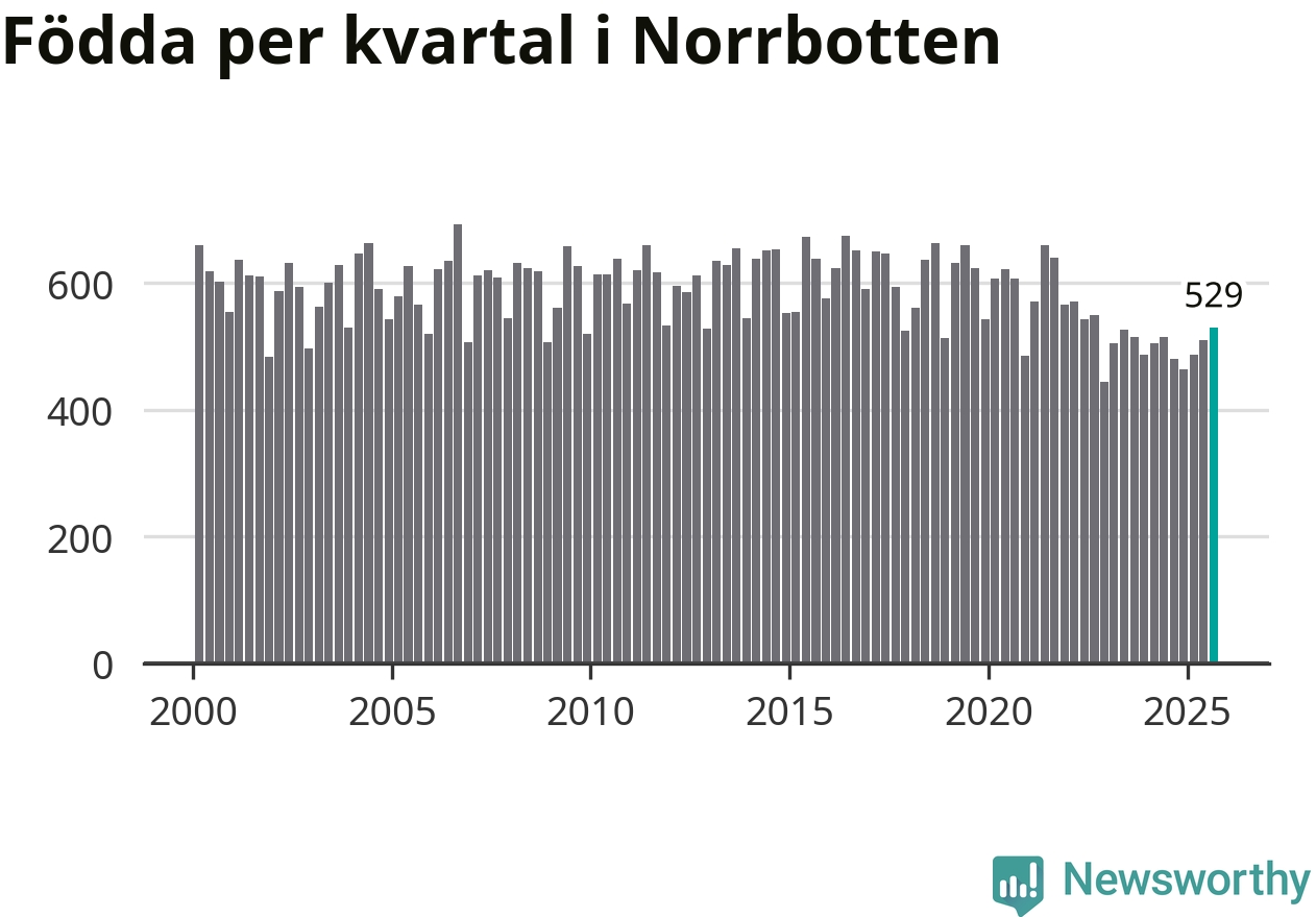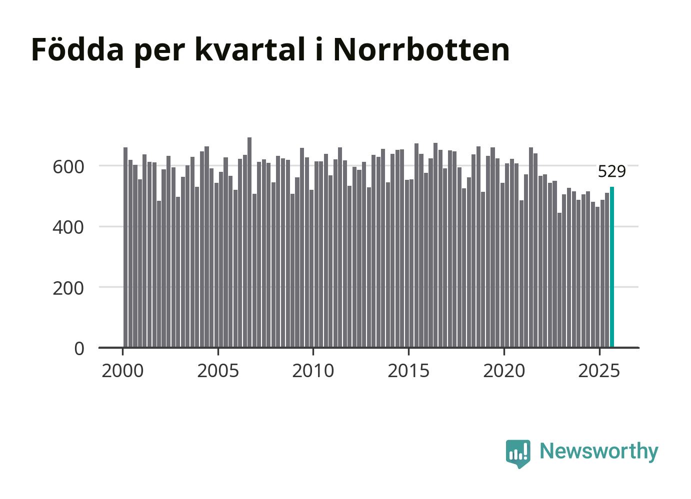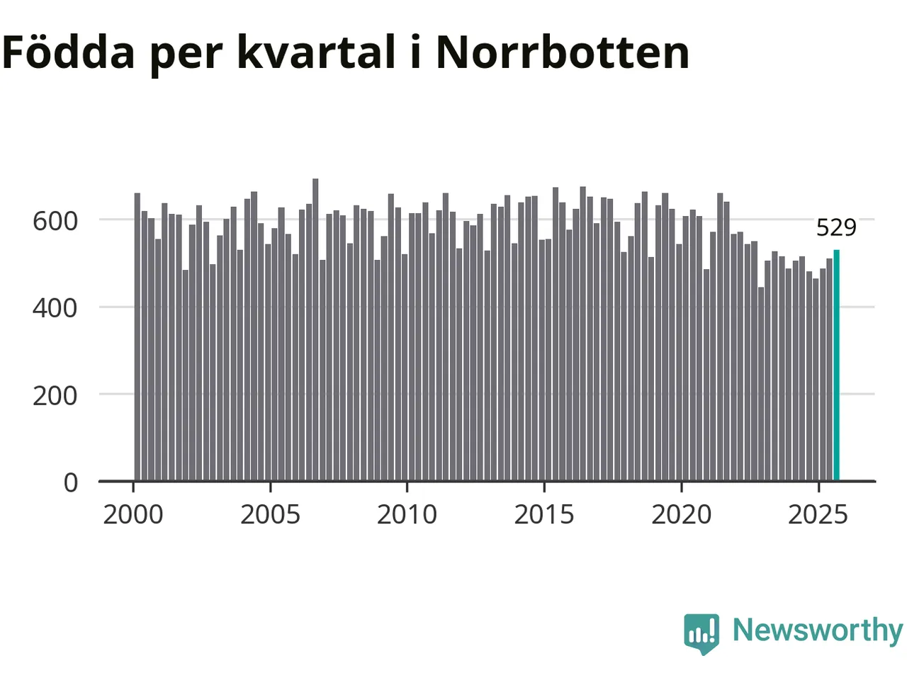 Enligt SCB:s siffror föddes 529 barn i Norrbotten under det senaste kvartalet. Samtidigt avled 695 personer. Norrbotten hade alltså ett negativt födelsenetto, vilket länet historiskt sett nästan alltid har haft.