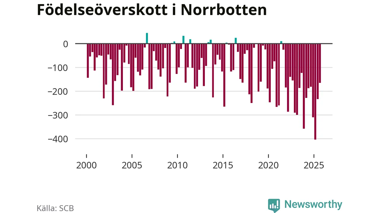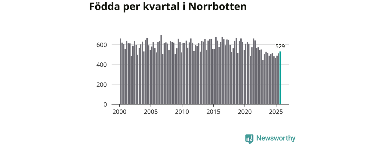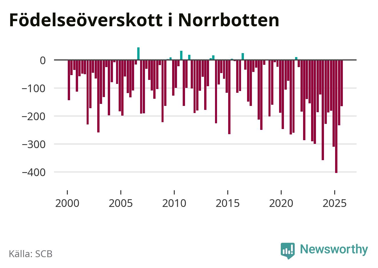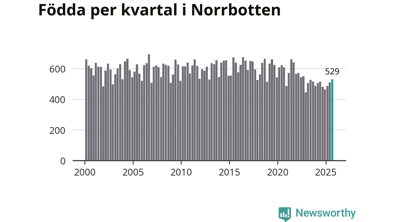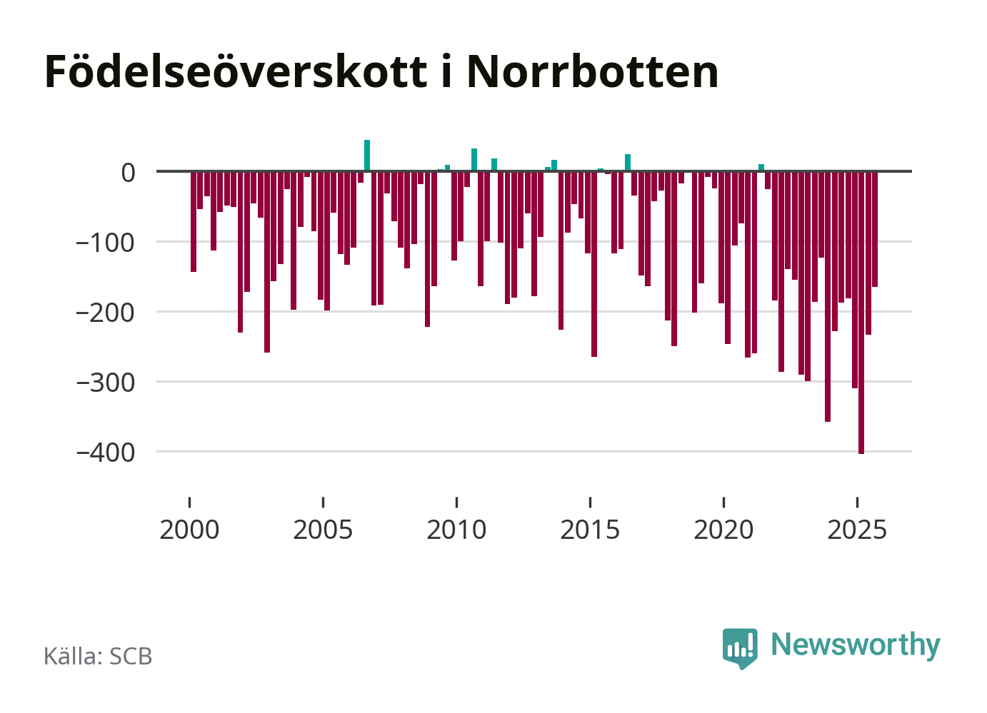 Enligt SCB:s siffror föddes 529 barn i Norrbotten under det senaste kvartalet. Samtidigt avled 695 personer. Norrbotten hade alltså ett negativt födelsenetto, vilket länet historiskt sett nästan alltid har haft.