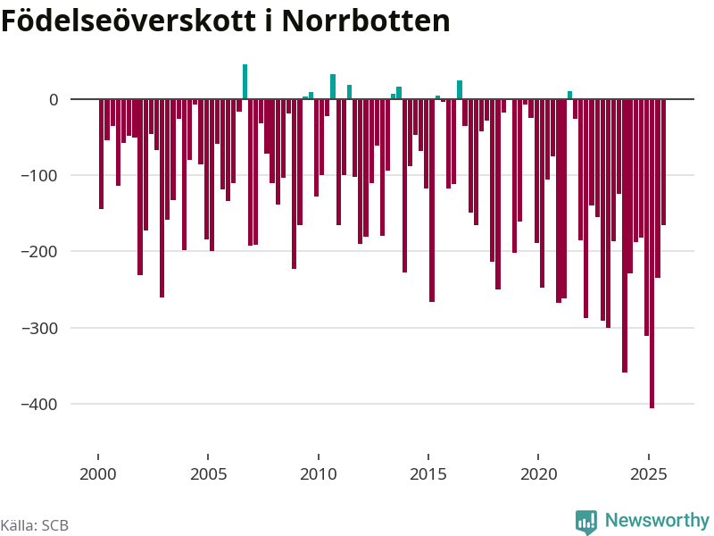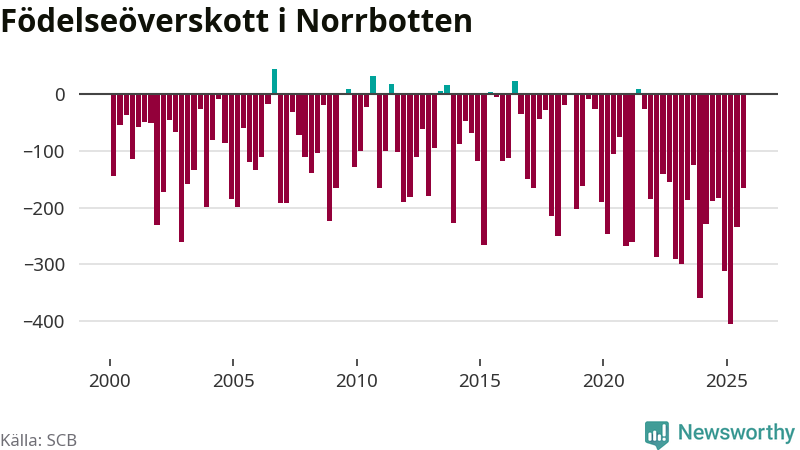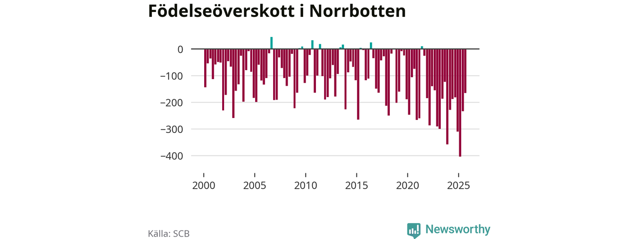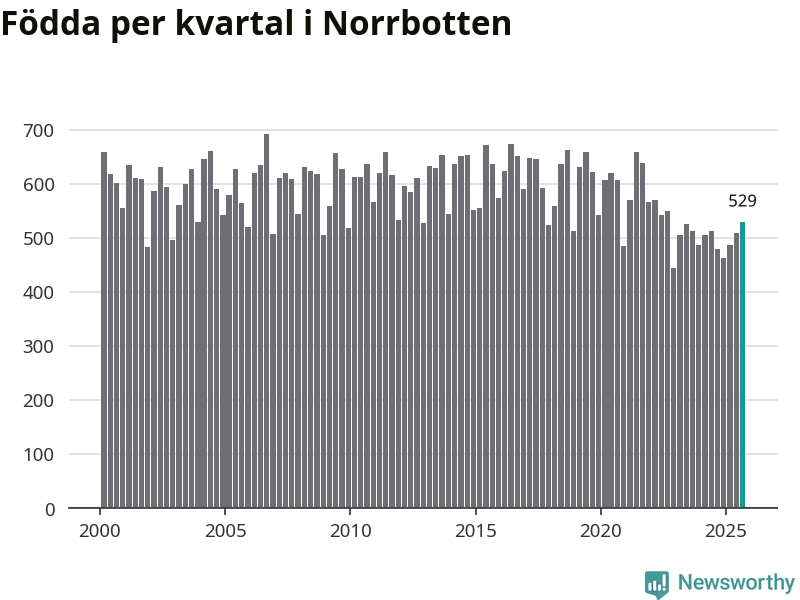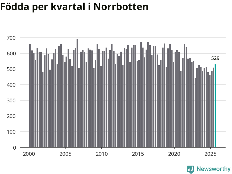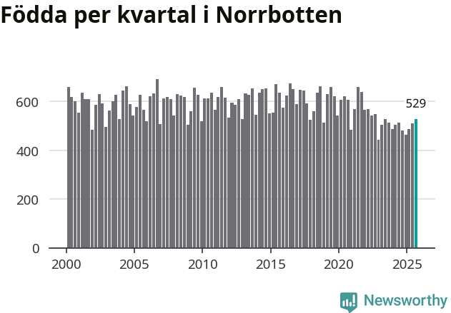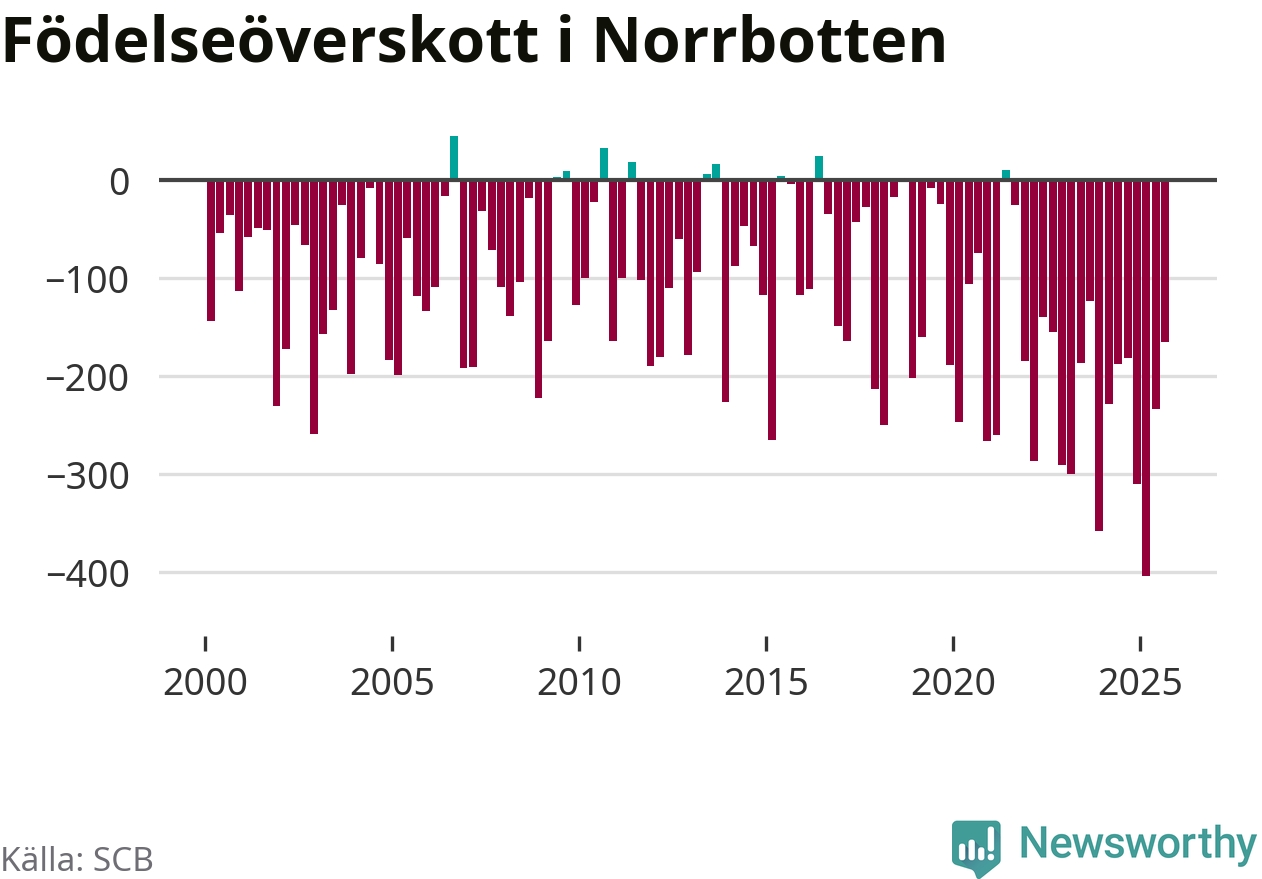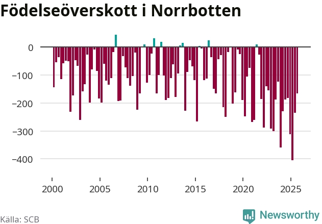 Enligt SCB:s siffror föddes 529 barn i Norrbotten under det senaste kvartalet. Samtidigt avled 695 personer. Norrbotten hade alltså ett negativt födelsenetto, vilket länet historiskt sett nästan alltid har haft.