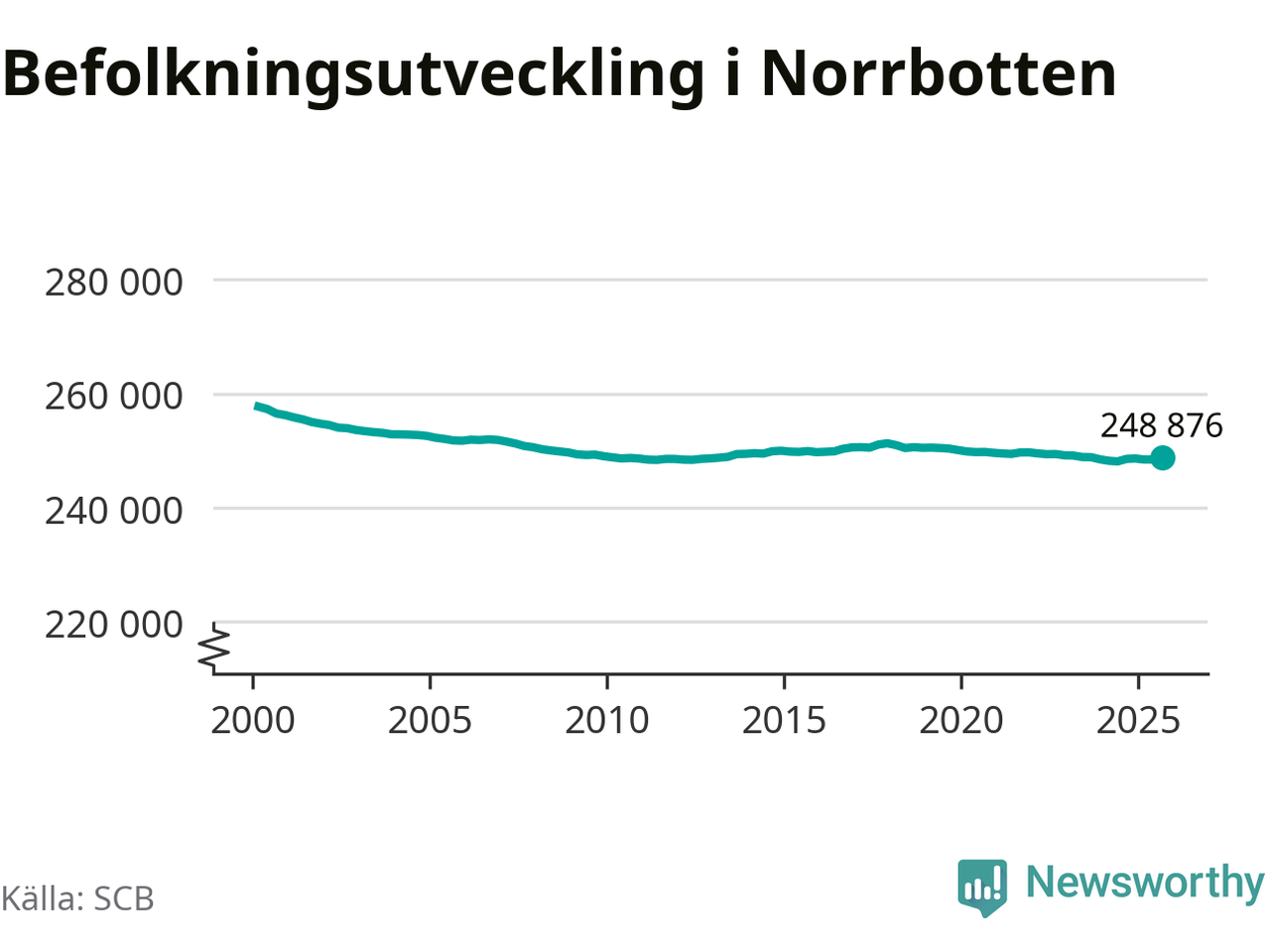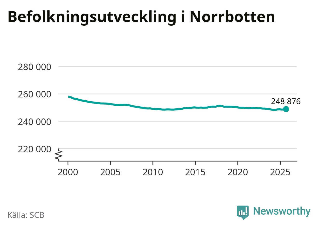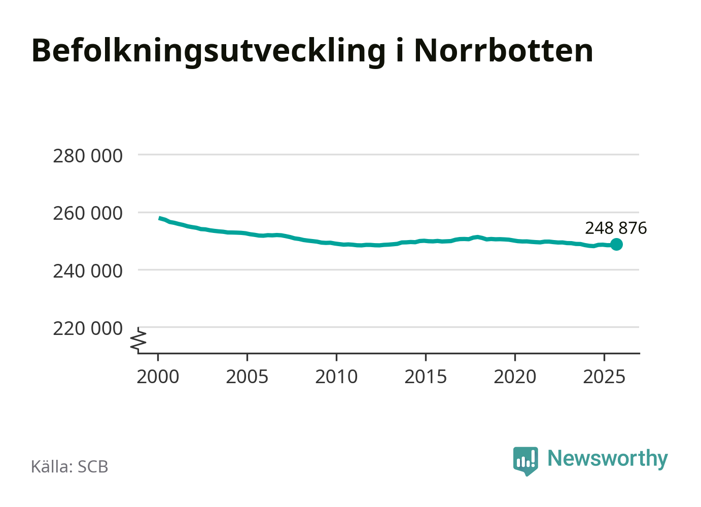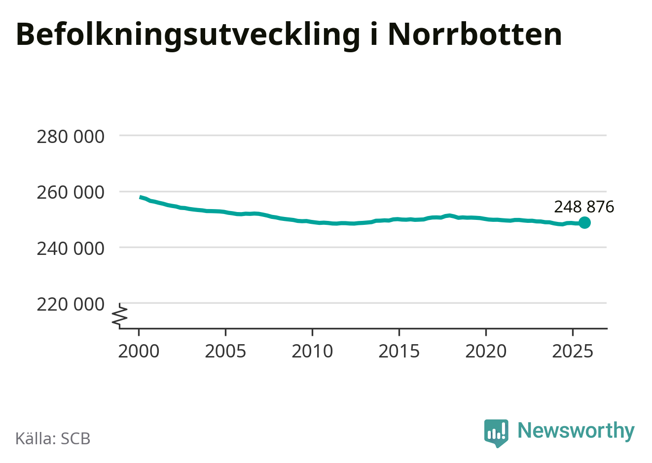 Jämfört med för ett år sedan har befolkningen i Norrbotten ökat med ungefär 320 personer. Sedan millennieskiftet har folkmängden minskat med runt 8 840 personer, eller 3 procent. Det är den största minskningen av alla län.