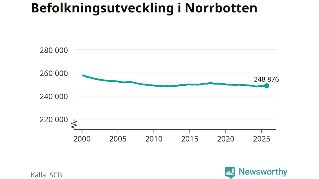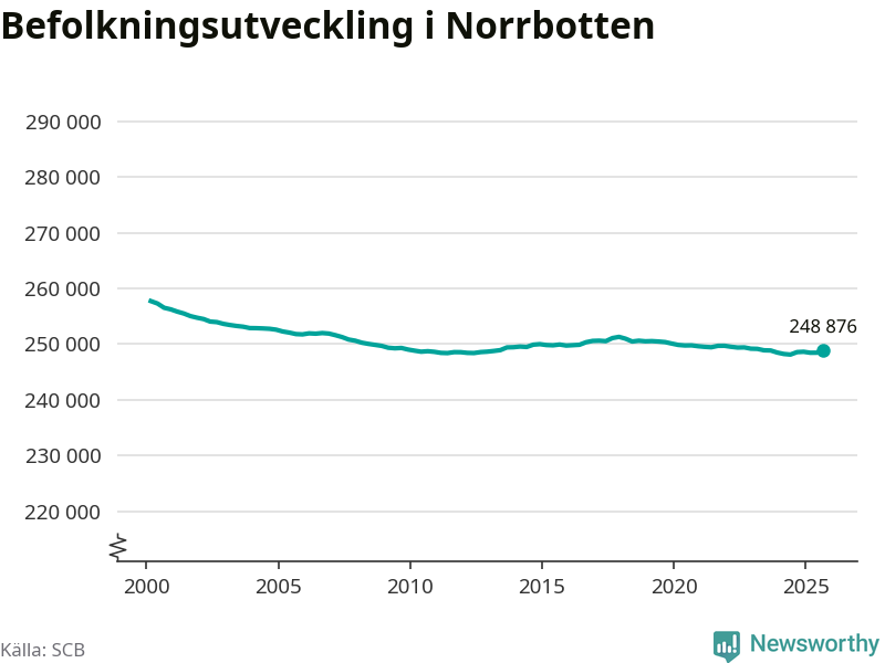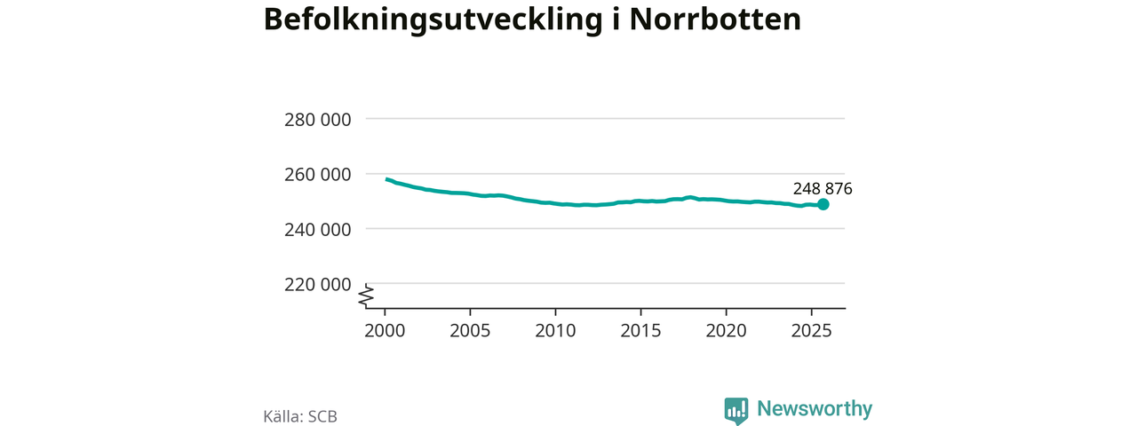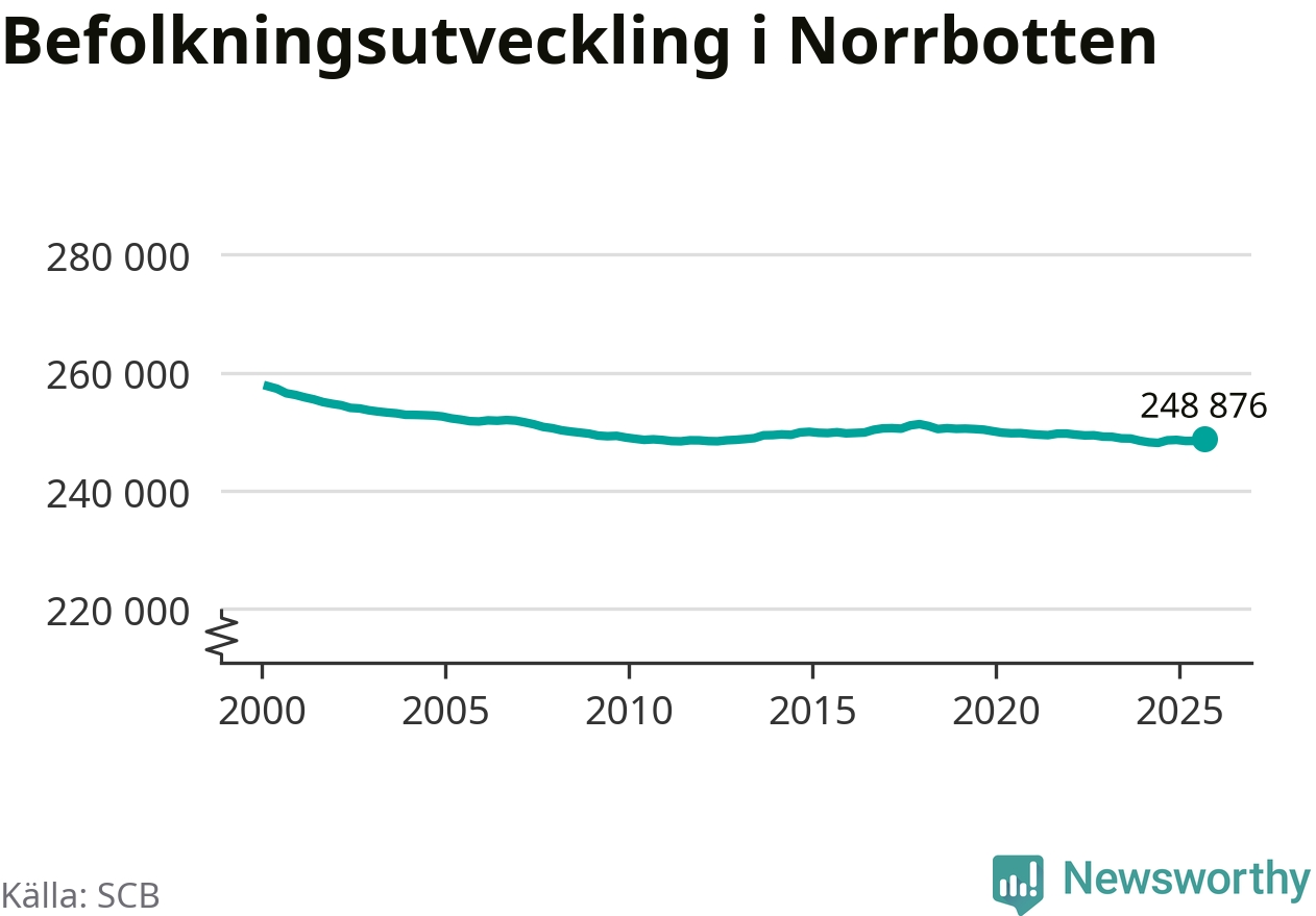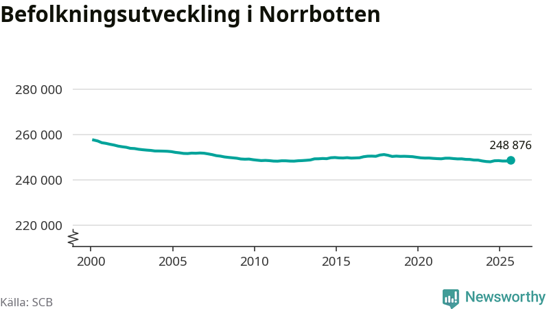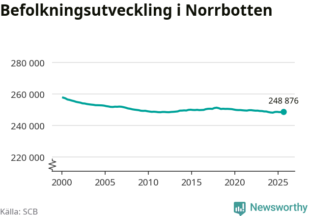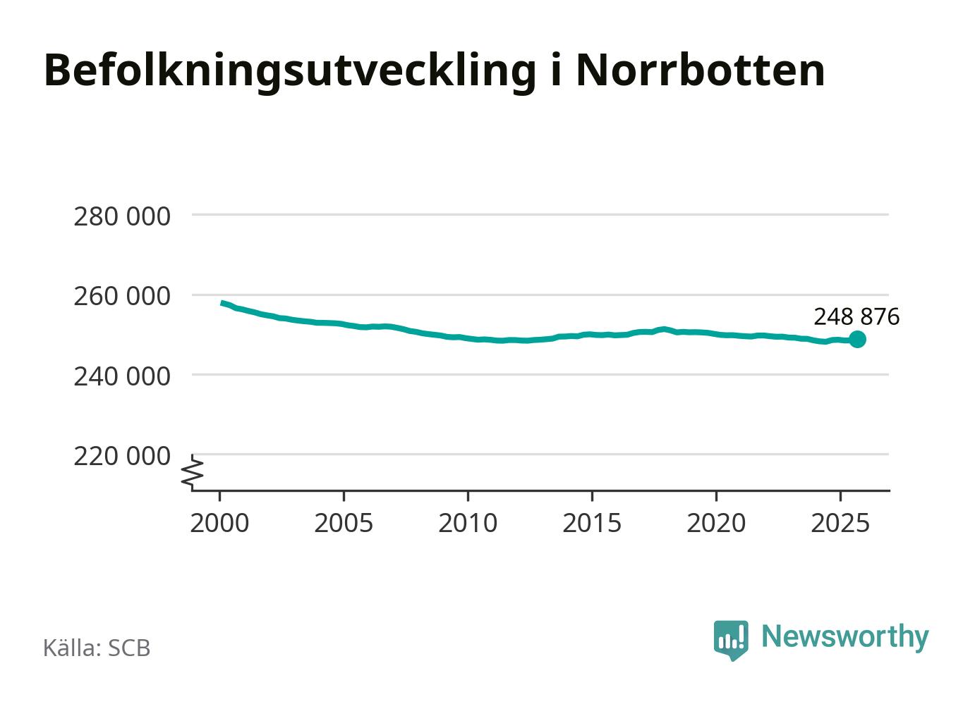 Jämfört med för ett år sedan har befolkningen i Norrbotten ökat med ungefär 320 personer. Sedan millennieskiftet har folkmängden minskat med runt 8 840 personer, eller 3 procent. Det är den största minskningen av alla län.