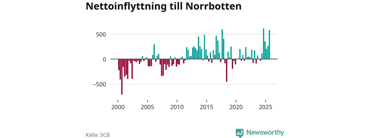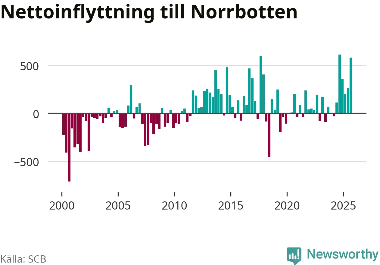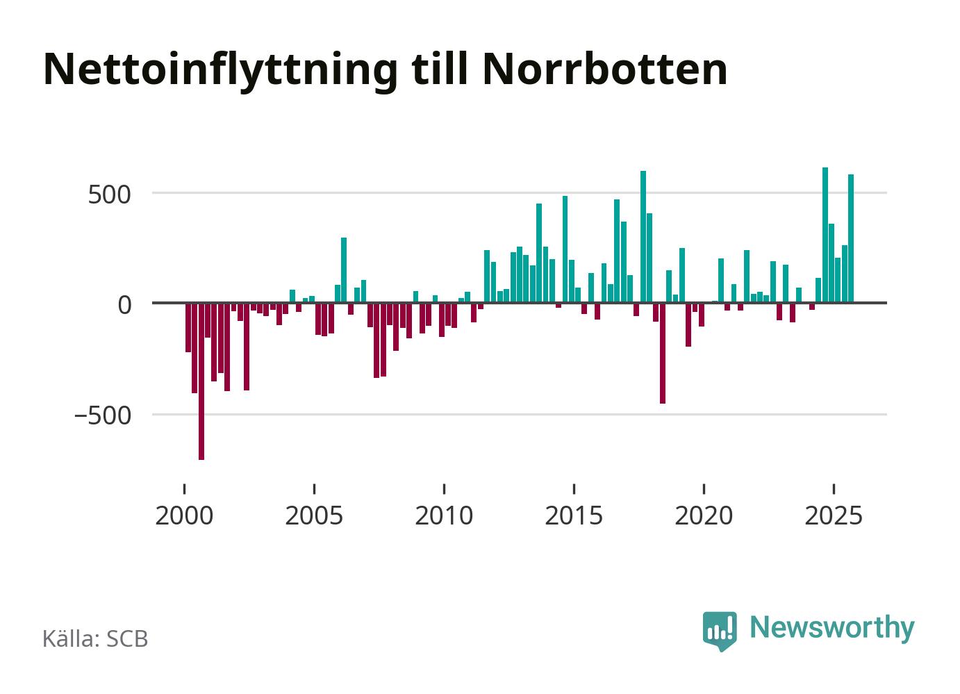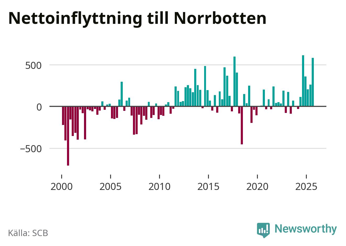 Under tredje kvartalet 2025 flyttade 2 970 personer till länet medan 2 389 personer flyttade därifrån. Det är historiskt sett en stor inflyttning under ett kvartal. Sedan seklets början har Norrbotten oftast haft ett positivt flyttnetto, inklusive det senaste kvartalet.