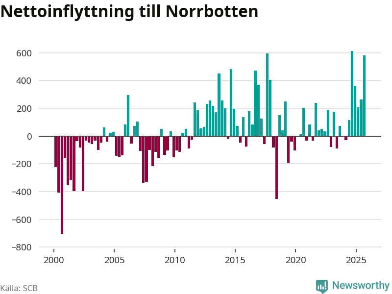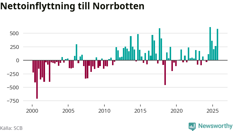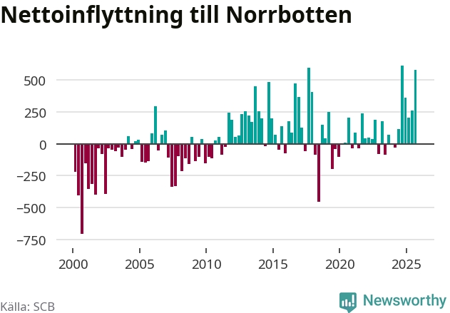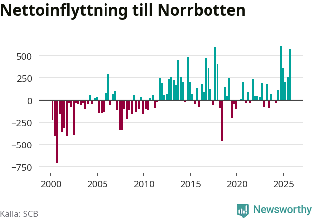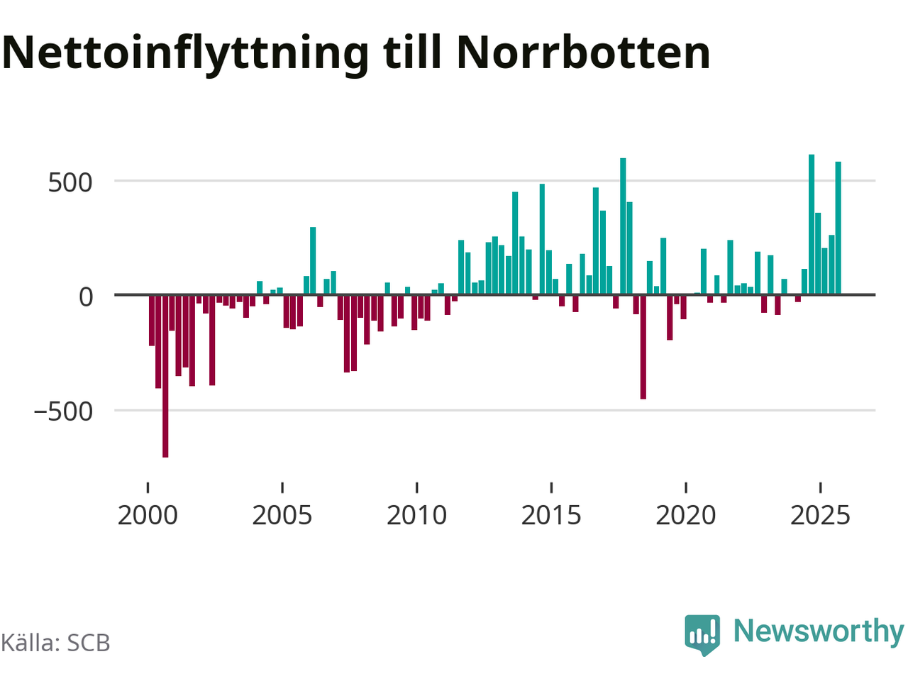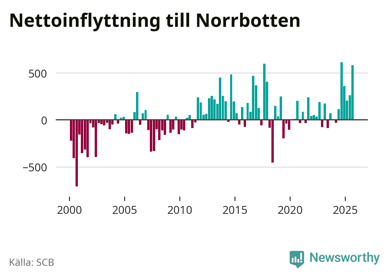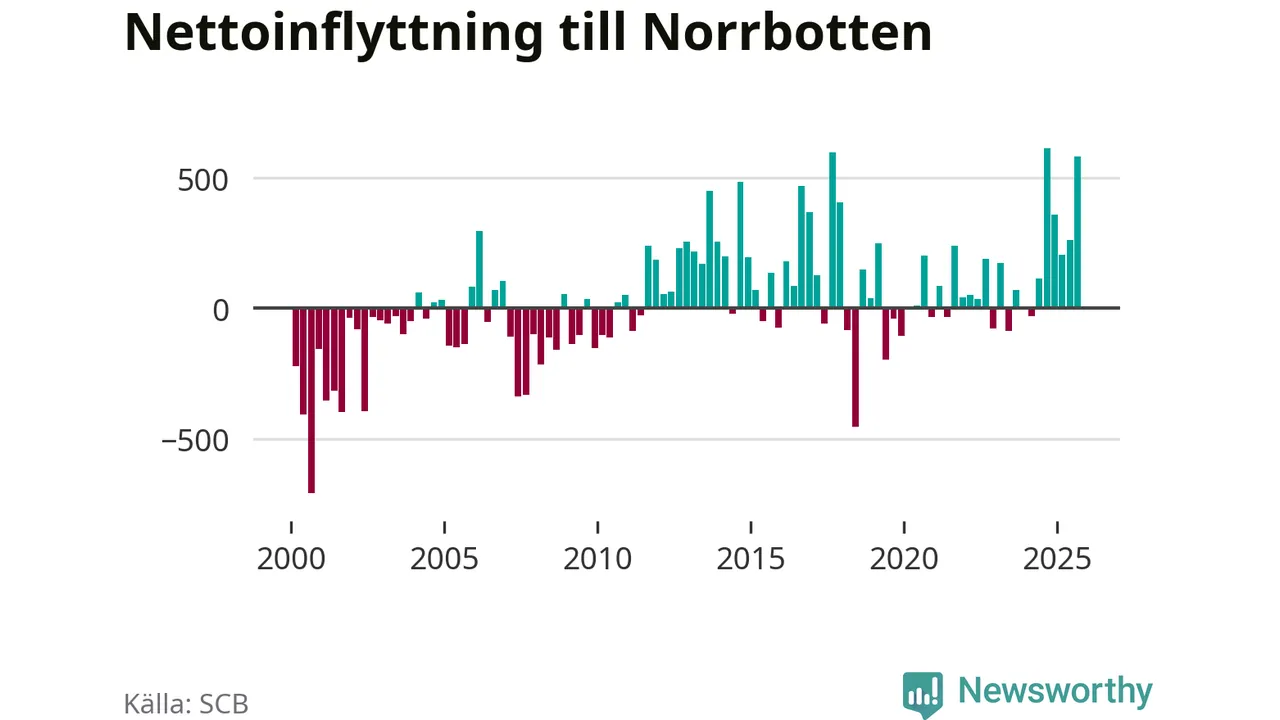 Under tredje kvartalet 2025 flyttade 2 970 personer till länet medan 2 389 personer flyttade därifrån. Det är historiskt sett en stor inflyttning under ett kvartal. Sedan seklets början har Norrbotten oftast haft ett positivt flyttnetto, inklusive det senaste kvartalet.