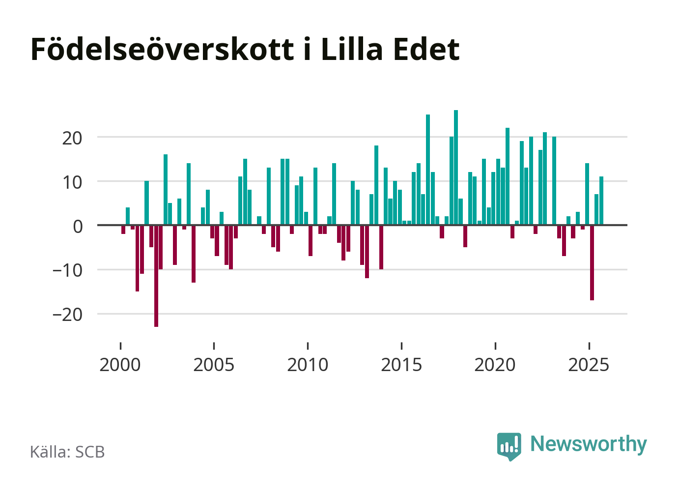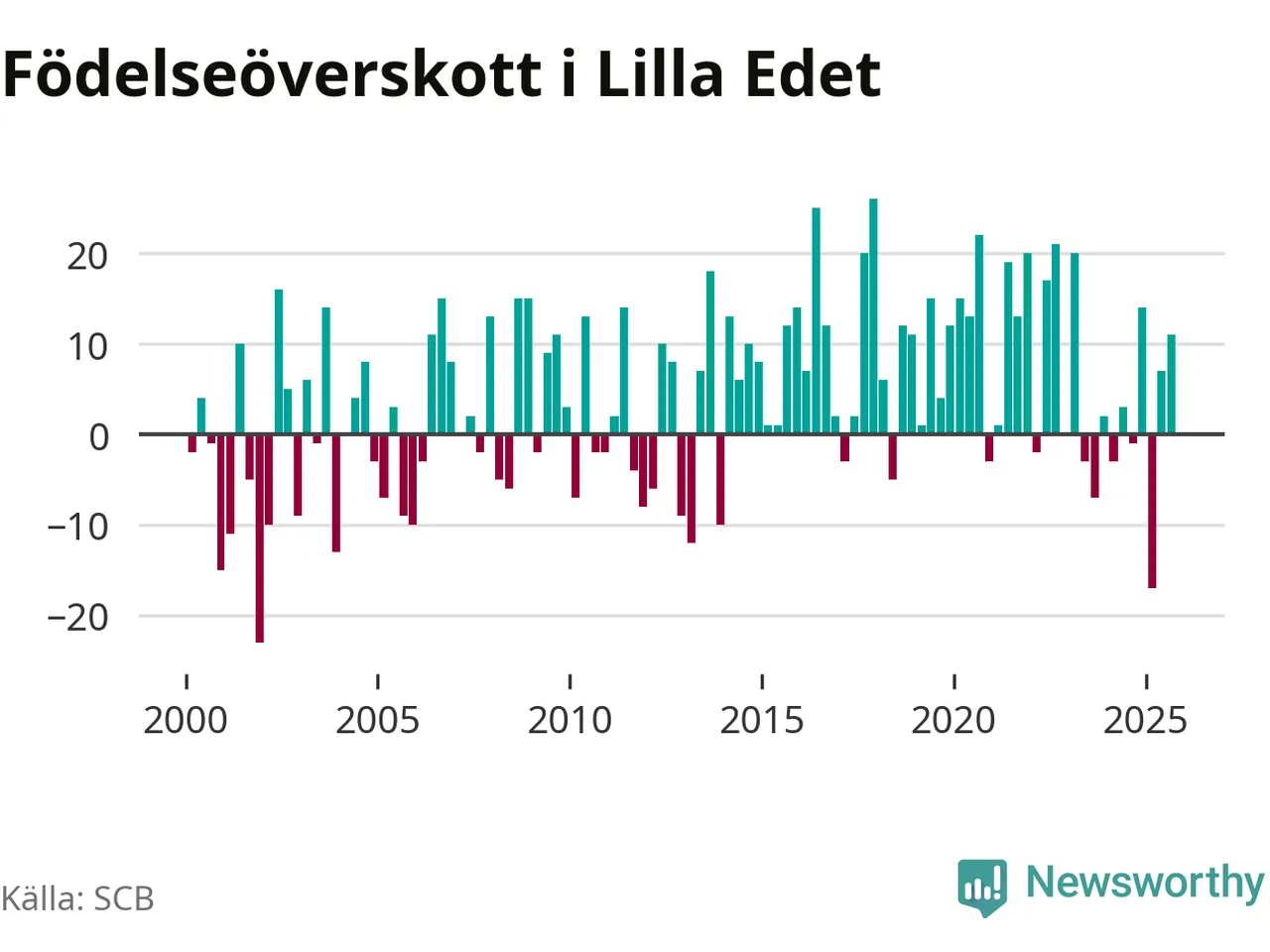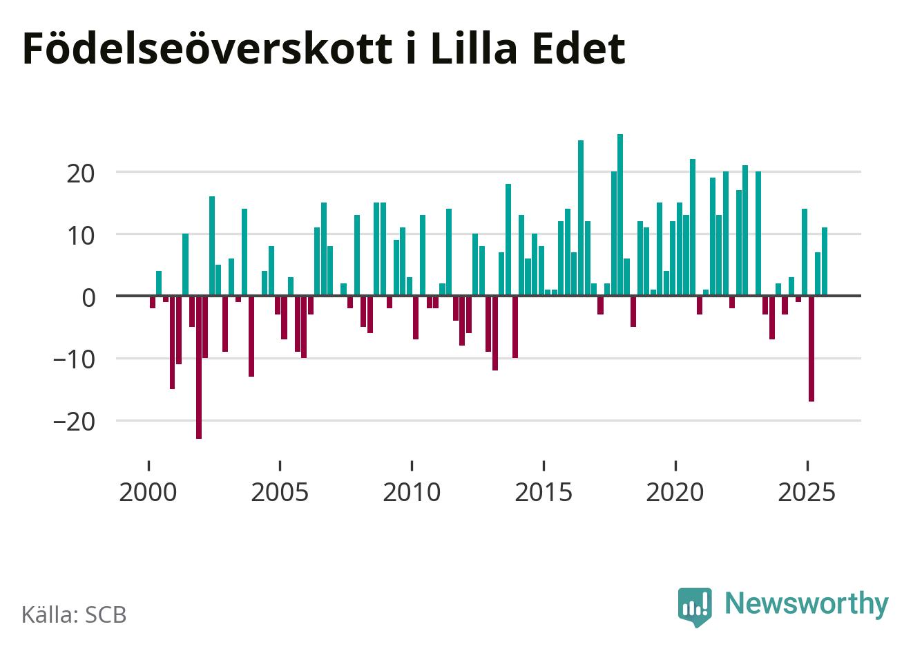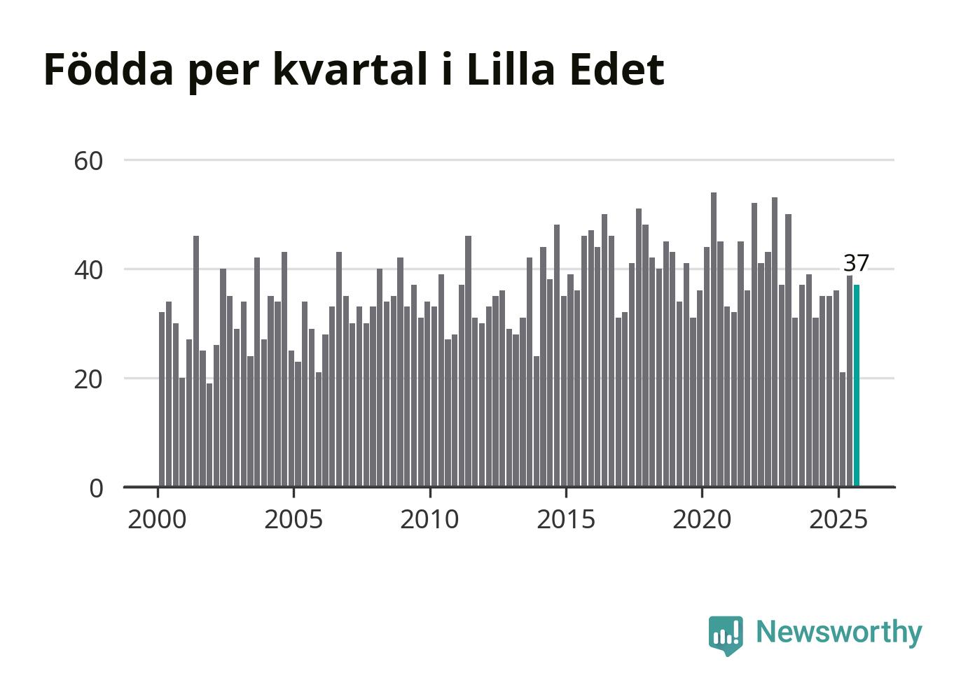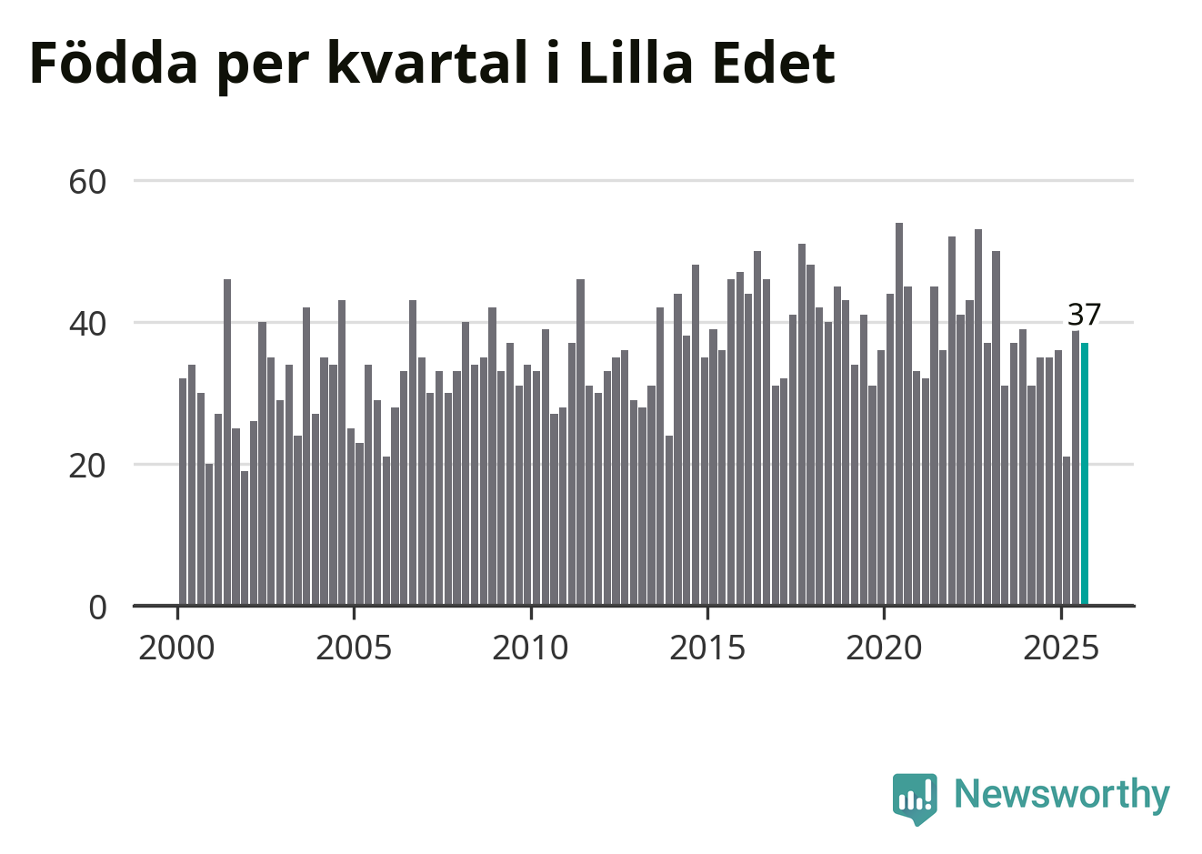 Enligt SCB:s siffror föddes 37 barn i Lilla Edet under det senaste kvartalet. Samtidigt avled 26 personer. Lilla Edet hade alltså ett positivt födelsenetto, vilket kommunen historiskt sett oftast har haft.