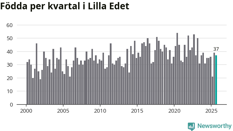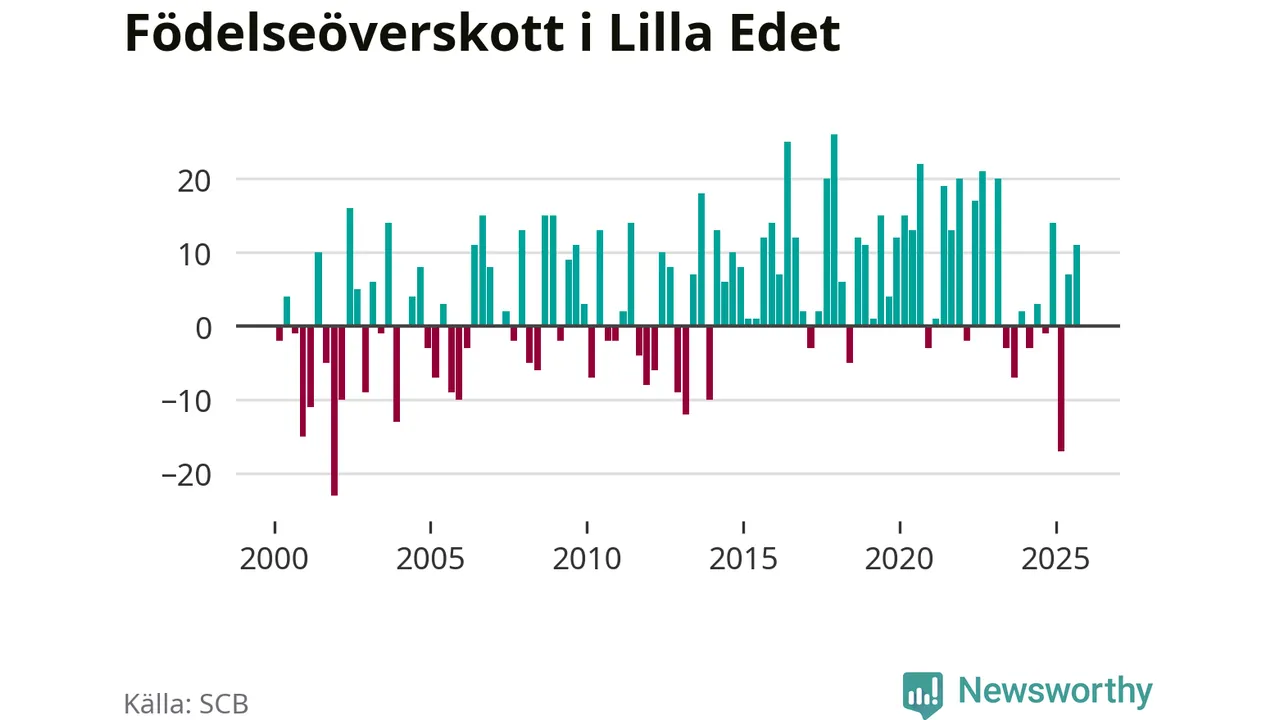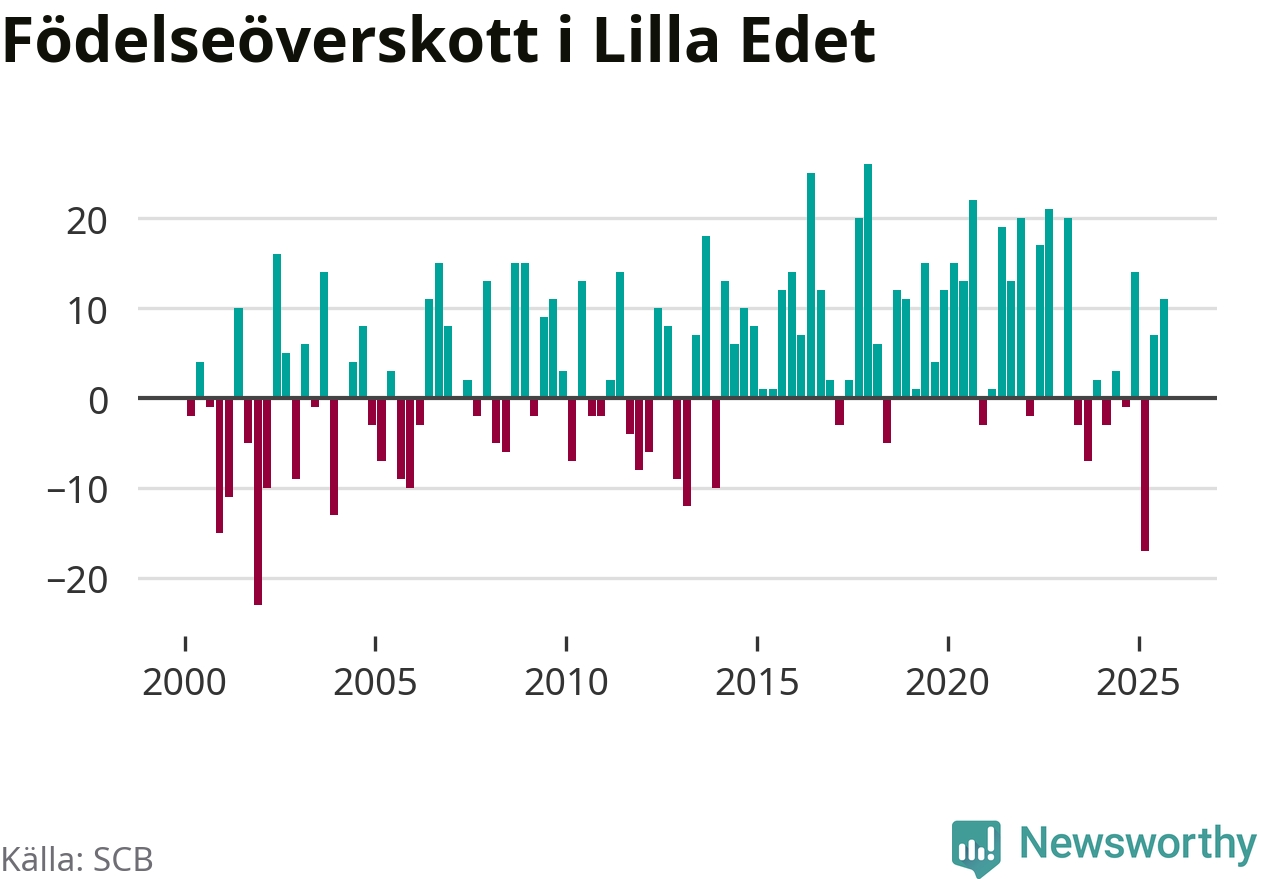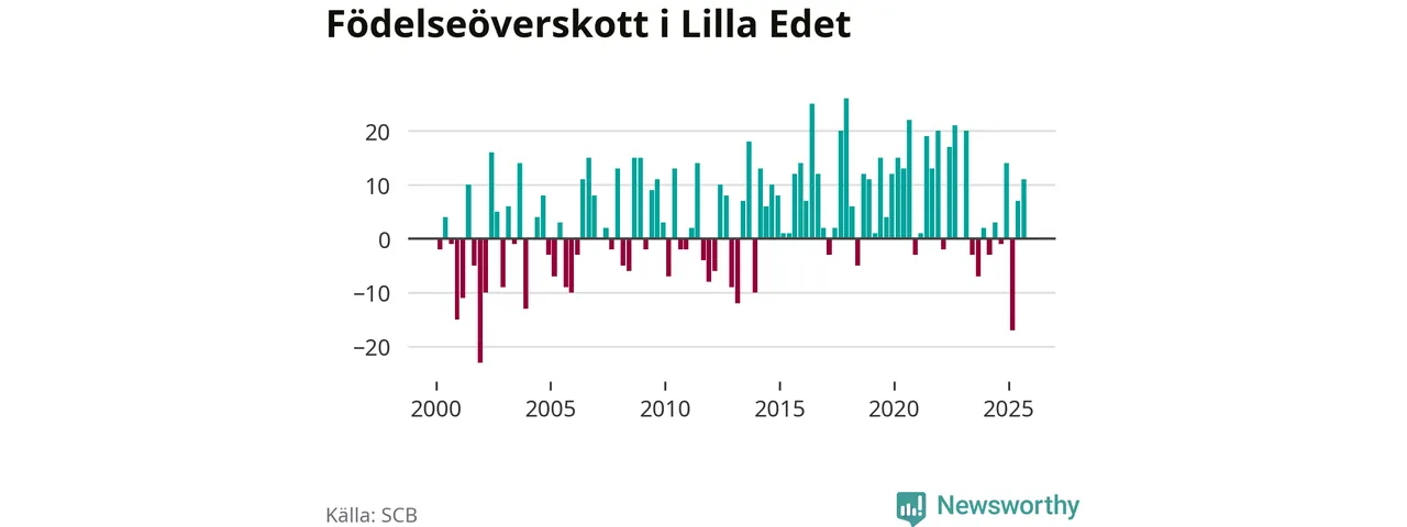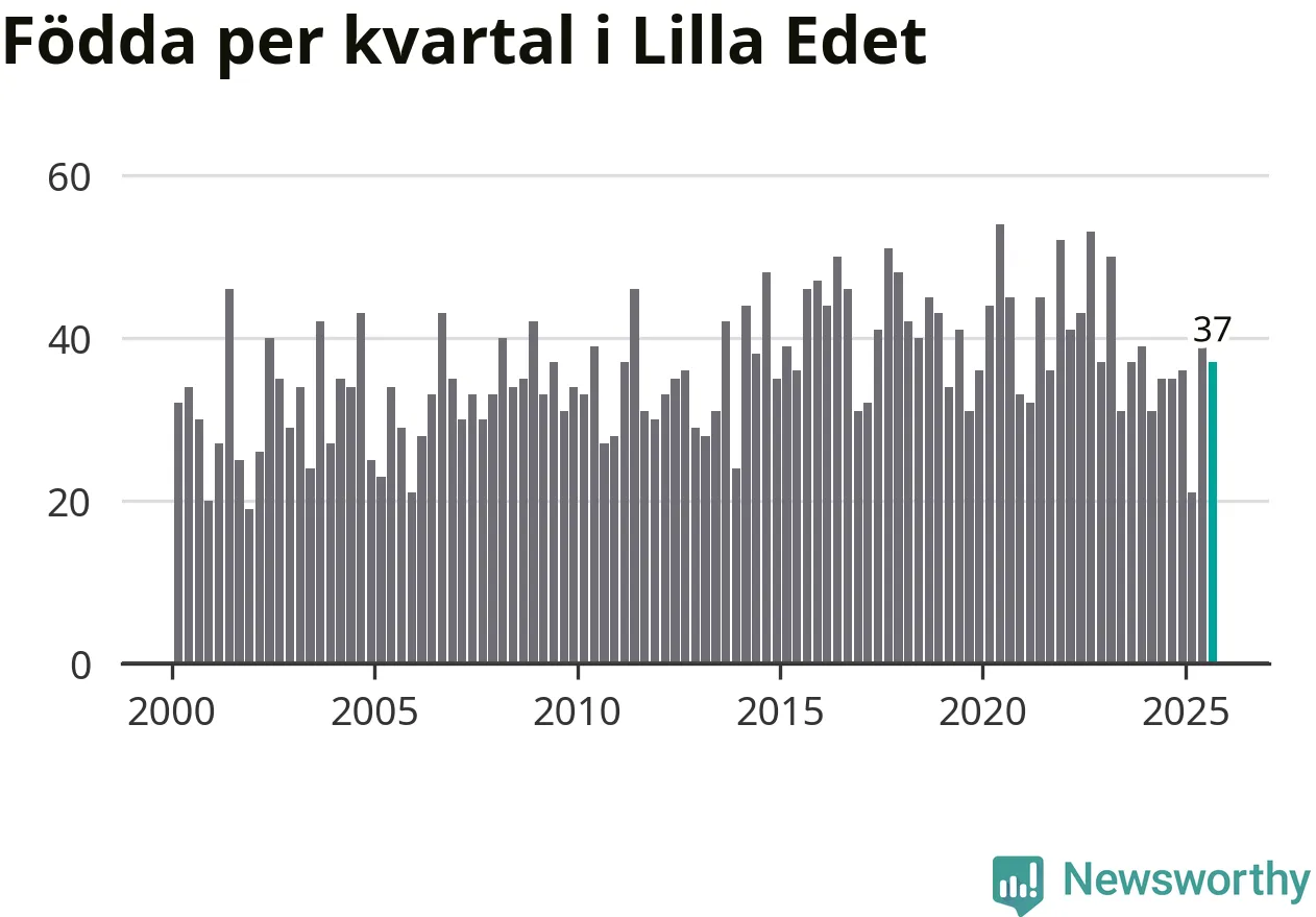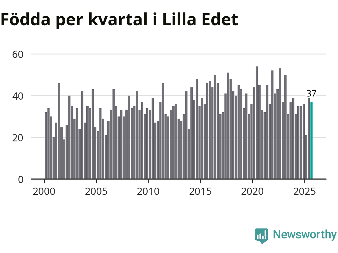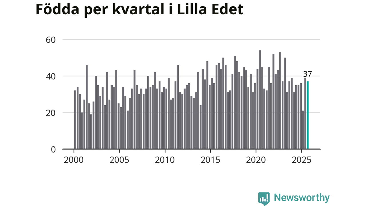 Enligt SCB:s siffror föddes 37 barn i Lilla Edet under det senaste kvartalet. Samtidigt avled 26 personer. Lilla Edet hade alltså ett positivt födelsenetto, vilket kommunen historiskt sett oftast har haft.