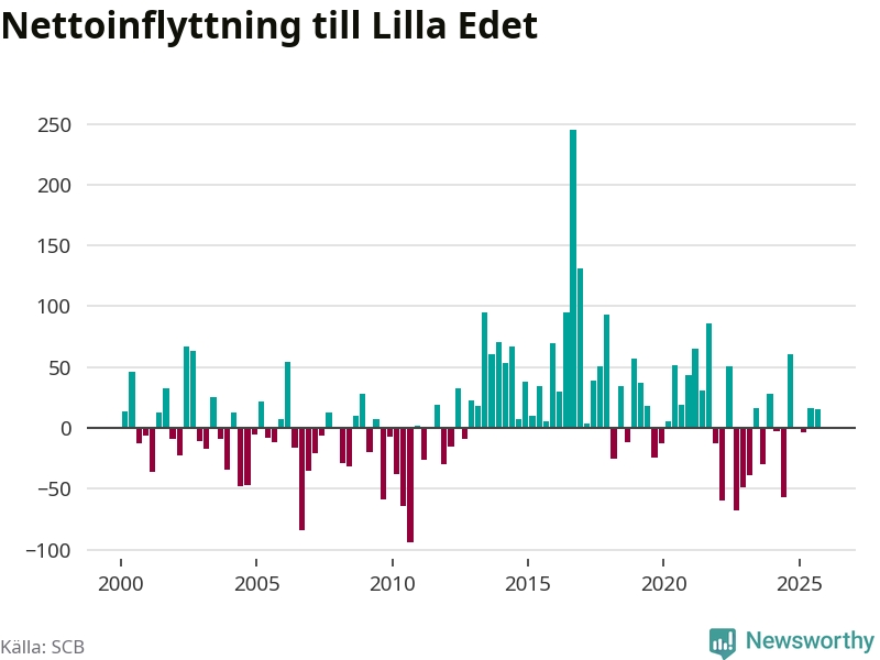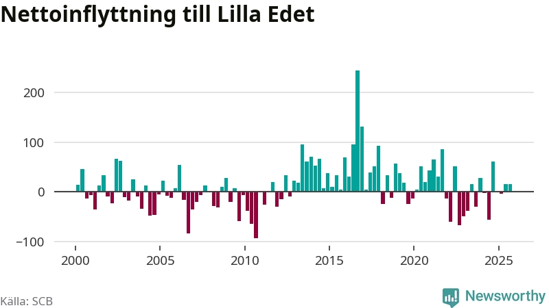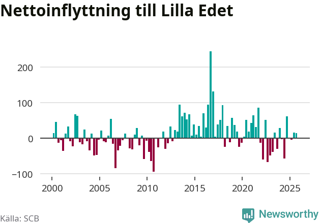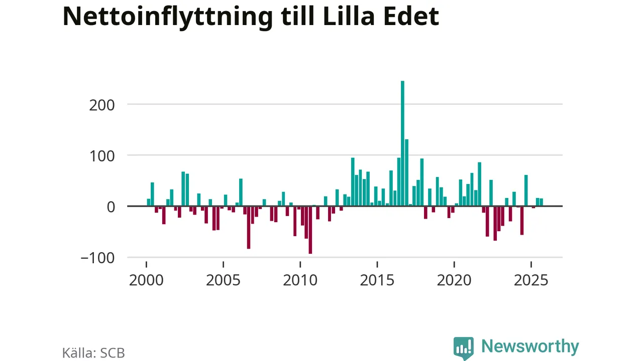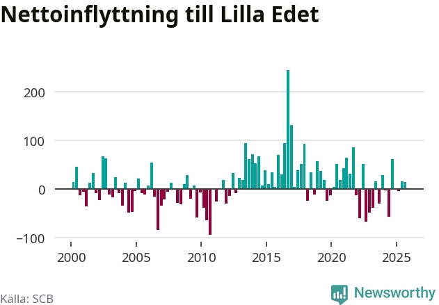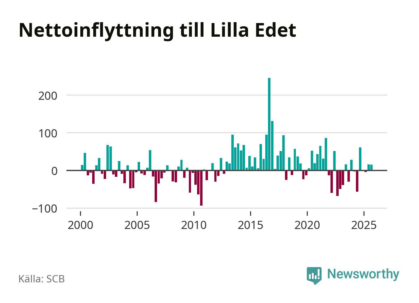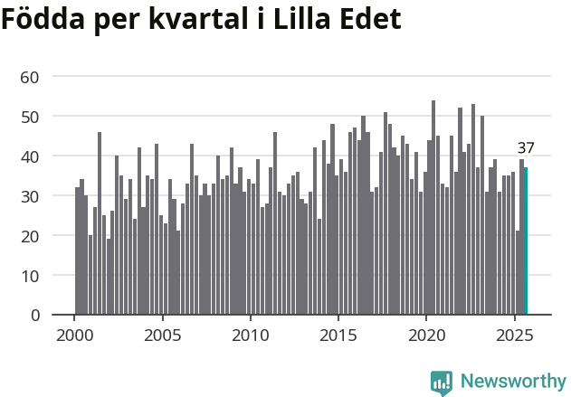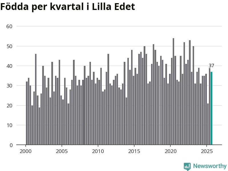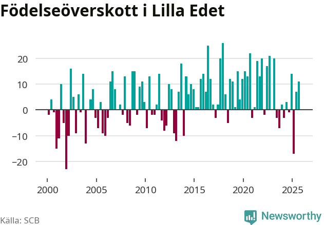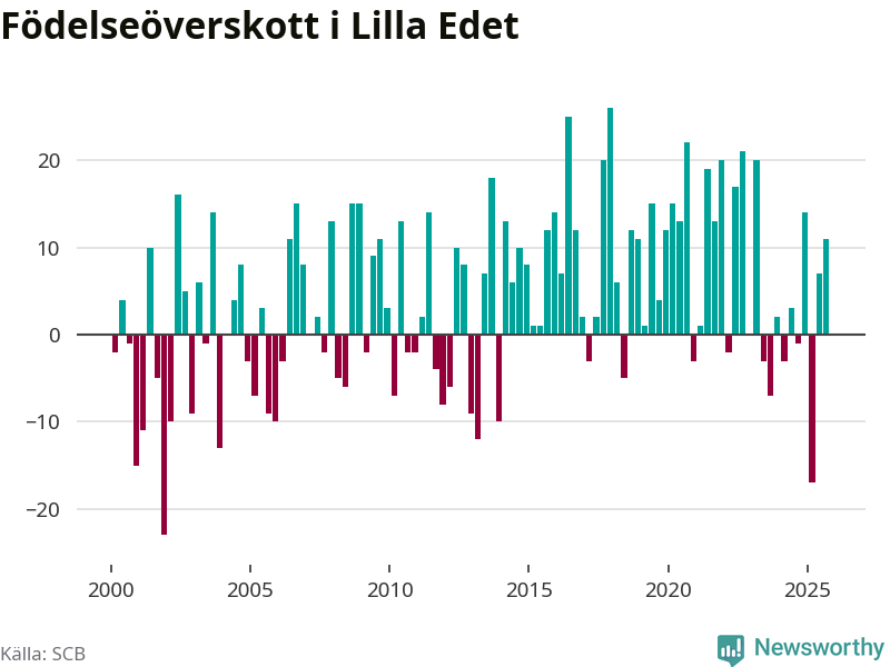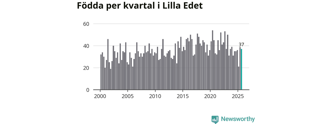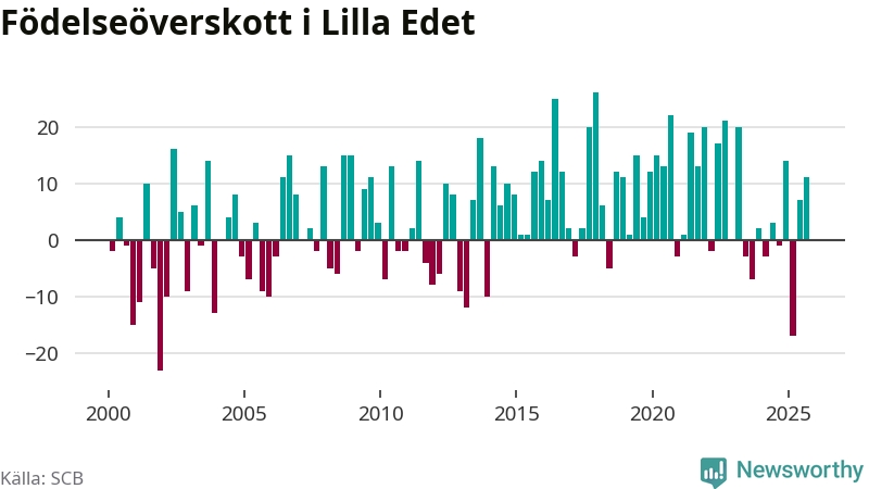 Enligt SCB:s siffror föddes 37 barn i Lilla Edet under det senaste kvartalet. Samtidigt avled 26 personer. Lilla Edet hade alltså ett positivt födelsenetto, vilket kommunen historiskt sett oftast har haft.