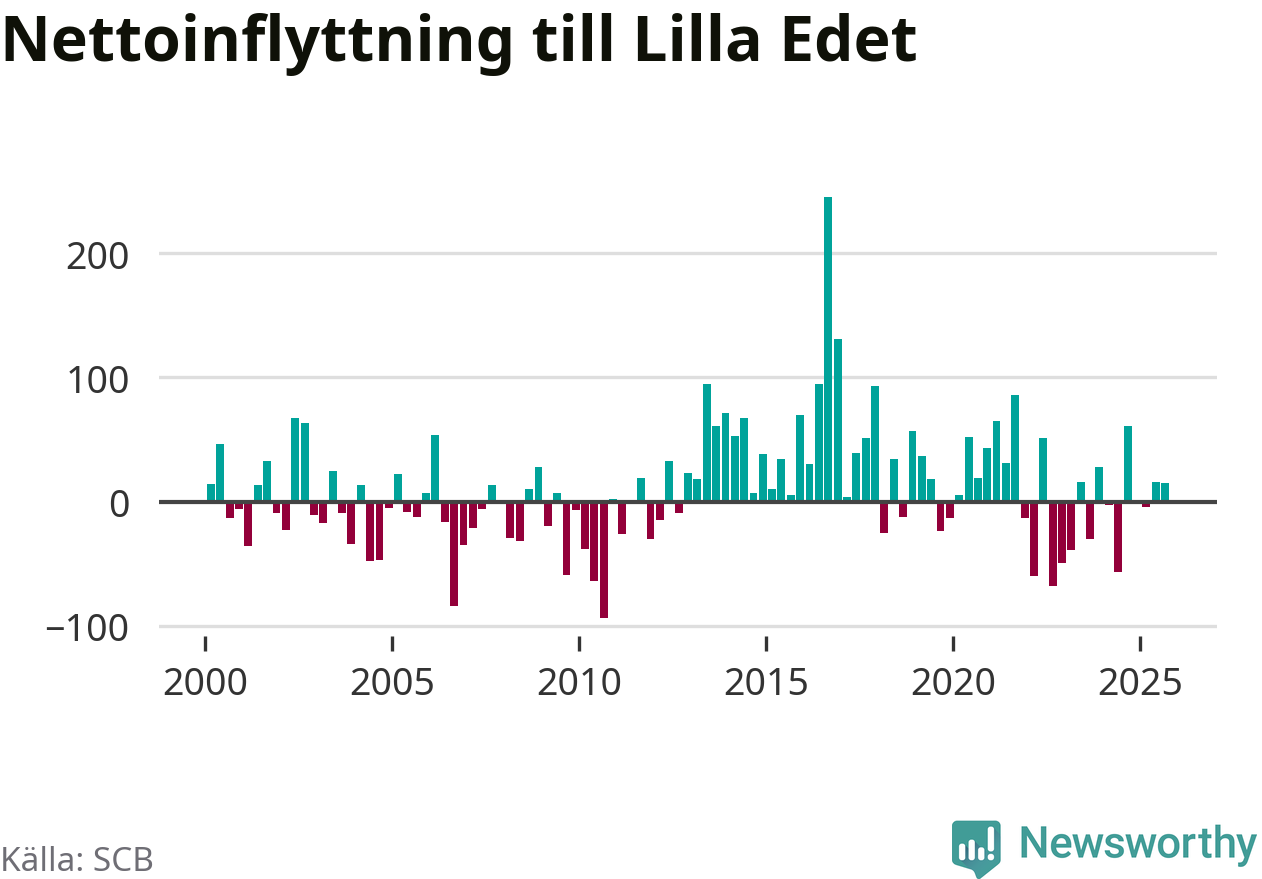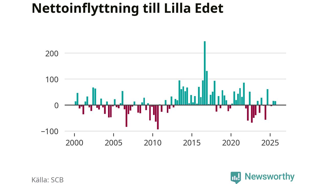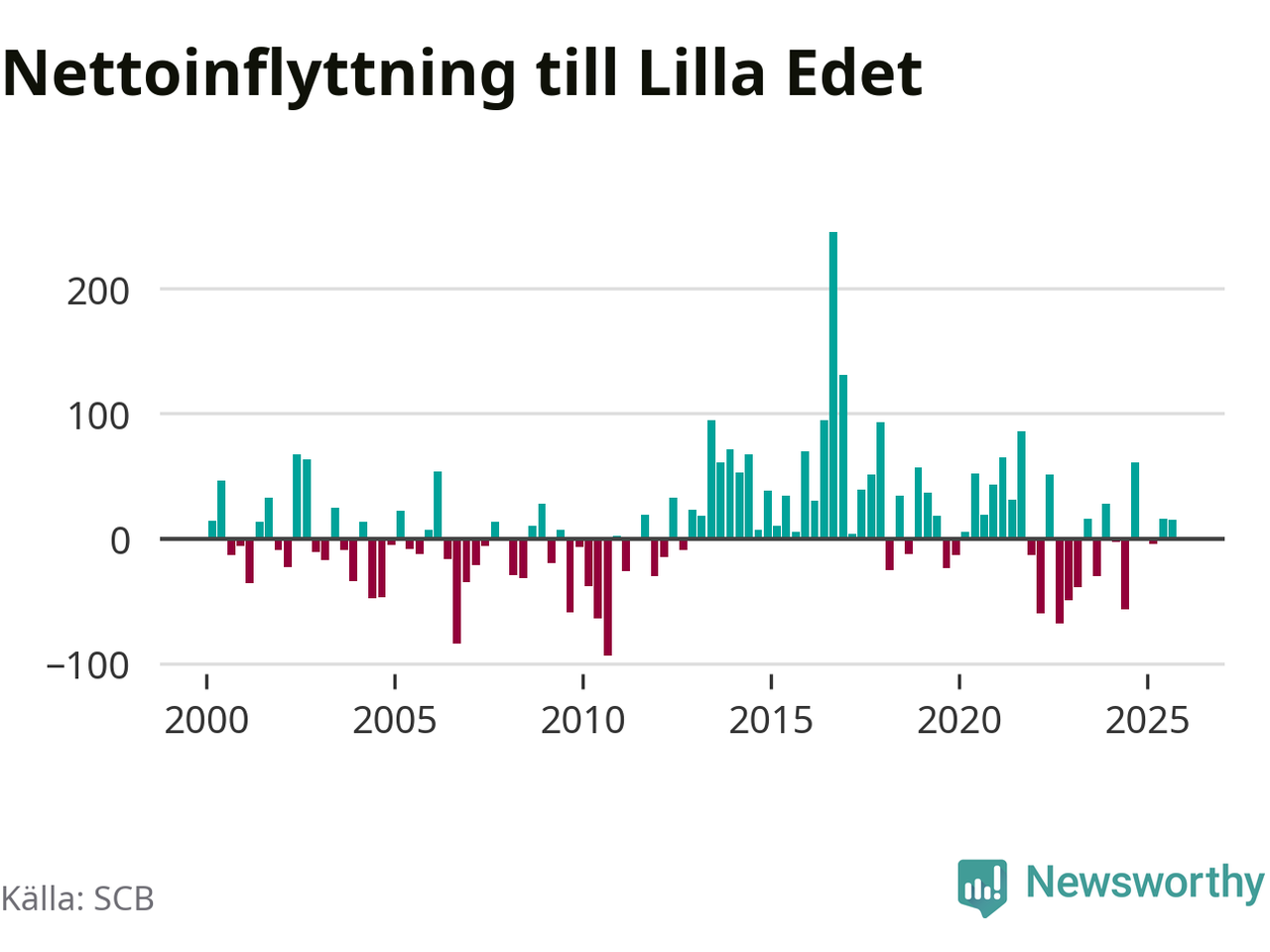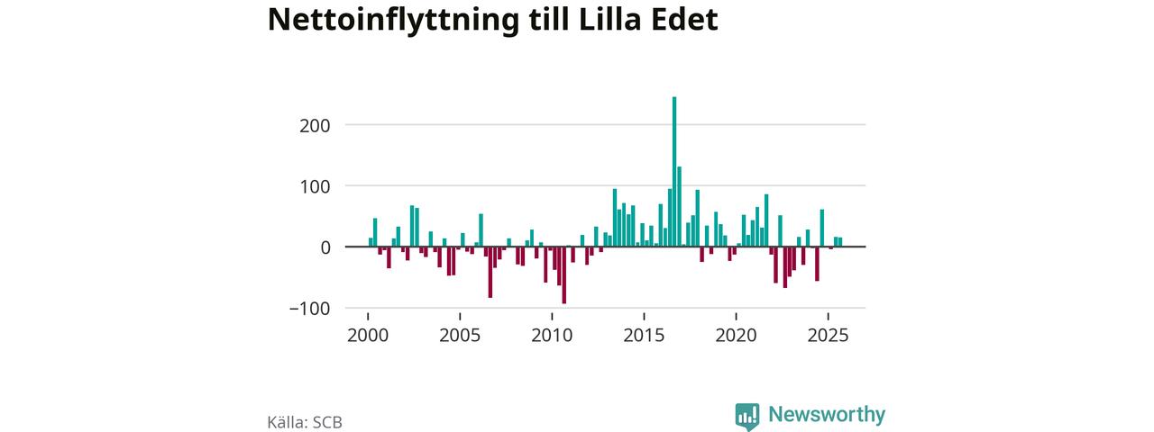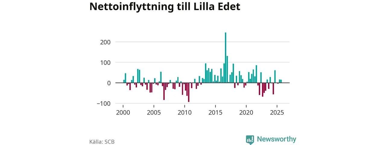Under tredje kvartalet 2025 flyttade 258 personer till kommunen medan 243 personer flyttade därifrån. Sedan seklets början har Lilla Edet oftast haft ett positivt flyttnetto, inklusive det senaste kvartalet.